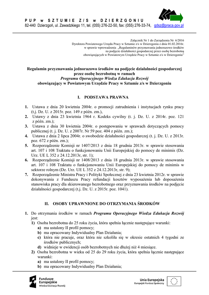 P U P w S Z T U M I E Z / S w D Z I E R Z G O N I U 82-440 Dzierzgoń, ul. Zawadzkiego 11, tel. (055) 276-22-50, fax: (055) 276-33-74, [email protected] Załącznik Nr 1 do Zarządzenia Nr 6/2016 Dyrektora Powiatowego Urzędu Pracy w Sztumie z/s w Dzierzgoniu z dnia 01.02.2016r. w sprawie wprowadzenia „Regulaminów przyznawania jednorazowo środków na podjęcie działalności gospodarczej przez osobę bezrobotną obowiązujących w Powiatowym Urzędzie Pracy w Sztumie z/s w Dzierzgoniu” Regulamin przyznawania jednorazowo środków na podjęcie działalności gospodarczej przez osobę bezrobotną w ramach Programu Operacyjnego Wiedza Edukacja Rozwój obowiązujący w Powiatowym Urzędzie Pracy w Sztumie z/s w Dzierzgoniu I. PODSTAWA PRAWNA 1. 2. 3. 4. 5. 6. 7. Ustawa z dnia 20 kwietnia 2004r. o promocji zatrudnienia i instytucjach rynku pracy (t.j. Dz. U. z 2015r. poz. 149 z późn. zm.), Ustawy z dnia 23 kwietnia 1964 r. Kodeks cywilny (t. j. Dz. U. z 2014r. poz. 121 z późn. zm.); Ustawa z dnia 30 kwietnia 2004r. o postępowaniu w sprawach dotyczących pomocy publicznej (t. j. Dz. U. z 2007r. Nr 59 poz. 404 z późn. zm.); Ustawa z dnia 2 lipca 2004r. o swobodzie działalności gospodarczej (t. j. Dz. U. z 2013r. poz. 672 z późn. zm.); Rozporządzenie Komisji nr 1407/2013 z dnia 18 grudnia 2013r. w sprawie stosowania art. 107 i 108 Traktatu o funkcjonowaniu Unii Europejskiej do pomocy de minimis (Dz. Urz. UE L 352 z 24.12.2013r, str. 1); Rozporządzenie Komisji nr 1408/2013 z dnia 18 grudnia 2013r. w sprawie stosowania art. 107 i 108 Traktatu o funkcjonowaniu Unii Europejskiej do pomocy de minimis w sektorze rolnym (Dz. Urz. UE L 352 z 24.12.2013r, str. 9); Rozporządzenie Ministra Pracy i Polityki Społecznej z dnia 23 kwietnia 2012r. w sprawie dokonywania z Funduszu Pracy refundacji kosztów wyposażenia lub doposażenia stanowiska pracy dla skierowanego bezrobotnego oraz przyznawania środków na podjęcie działalności gospodarczej (t.j. Dz. U. z 2015r. poz. 1041). II. OSOBY UPRAWNIONE DO OTRZYMANIA ŚRODKÓW 1. Do otrzymania środków w ramach Programu Operacyjnego Wiedza Edukacja Rozwój jest: 1) Osoba bezrobotna do 25 roku życia, która spełnia łącznie następujące warunki: a) ma ustalony II profil pomocy; b) ma opracowany Indywidualny Plan Działania; c) która nie pracuje, oraz która nie szkoliła się w okresie ostatnich 4 tygodni ze środków publicznych; d) widnieje w ewidencji osób bezrobotnych nie dłużej niż 4 miesiące. 2) Osoba bezrobotna w wieku od 25 do 29 roku życia, która spełnia łącznie następujące warunki: a) ma ustalony II profil pomocy; b) ma opracowany Indywidualny Plan Działania; c) która nie pracuje, oraz która nie szkoliła się w okresie ostatnich 4 tygodni ze środków publicznych. 3) W przypadku osób poniżej 25 roku życia w pierwszej kolejności środki na podjęcie działalności gospodarczej będą przyznawane osobom długotrwale bezrobotnym zgodnie z definicją Komisji Europejskiej, są to osoby bezrobotne nieprzerwanie przez okres ponad 6 miesięcy. 4) W przypadku osób w wieku od 25 do 29 roku życia w pierwszej kolejności środki na podjęcie działalności gospodarczej będą przyznawane osobom długotrwale bezrobotnym zgodnie z definicją Komisji Europejskiej, są to osoby bezrobotne nieprzerwanie przez okres ponad 12 miesięcy. III. INFORMACJE OGÓLNE 1. Przed złożeniem wniosku osoba bezrobotna zobowiązana jest do rozmowy z doradcą zawodowym w celu uzyskania opinii na temat predyspozycji wnioskodawcy do prowadzania działalności gospodarczej. 2. Dofinansowanie może być przyznane w wysokości określonej w umowie, nie wyższej jednak niż 6-krotnej wysokości przeciętnego wynagrodzenia, które przyjmowane jest na dzień zawarcia umowy. 3. Dofinansowanie przekazywane jest wyłącznie na rachunek bankowy wskazany przez wnioskodawcę. 4. PUP nie może przyznać środków na rozpoczęcie działalności gospodarczej osobom, które: 1) otrzymały bezzwrotne środki Funduszu Pracy lub inne bezzwrotne środki publiczne na podjęcie działalności gospodarczej lub rolniczej, założyły lub przystąpiły do spółdzielni socjalnej, 2) posiadają wpis do ewidencji działalności gospodarczej w okresie 12 miesięcy bezpośrednio poprzedzających dzień złożenia wniosku, 3) były karane w okresie 2 lat przed dniem złożenia wniosku za przestępstwo przeciwko obrotowi gospodarczemu, w rozumieniu ustawy z dnia 6 czerwca 1997r. - Kodeks karny lub ustawy z dnia 28 października 2002r. o odpowiedzialności podmiotów za czyny zabronione pod groźbą kary, 4) złożyły wniosek do innego starosty o przyznanie dofinansowania lub przyznanie jednorazowo środków na założenie lub przystąpienie do spółdzielni socjalnej, 5) w okresie 12 miesięcy bezpośrednio poprzedzających dzień złożenia wniosku: a) odmówiły bez uzasadnionej przyczyny przyjęcia propozycji odpowiedniej pracy lub innej formy pomocy określonej w ustawie oraz udziału w działaniach w ramach Programu Aktywizacja i Integracja, o którym mowa w art. 62a ustawy o promocji zatrudnienia i instytucjach rynku pracy, b) przerwały z własnej winy szkolenie, staż, realizację indywidualnego planu działania, udział w ramach Programu Aktywizacja i Integracja, o którym mowa w art. 62a ustawy, wykonywanie prac społecznie użytecznych lub inną formę pomocy określoną w ustawie, c) po skierowaniu nie podjęły szkolenia, przygotowania zawodowego dorosłych, stażu, prac społecznie użytecznych lub innej formy pomocy określonej w ustawie. 5. Wnioski w sprawie przyznania jednorazowo środków na podjęcie działalności gospodarczej przyjmowane i rozpatrywane są na bieżąco. 6. Złożenie wniosku nie gwarantuje przyznania dofinansowania, jak również nie zwalnia z konieczności stawiania się na obowiązkowe wizyty w Urzędzie w wyznaczonych terminach. 7. Złożony wniosek wraz z dokumentacją nie podlega zwrotowi. Urząd nie wydaje kopii wniosku lub je