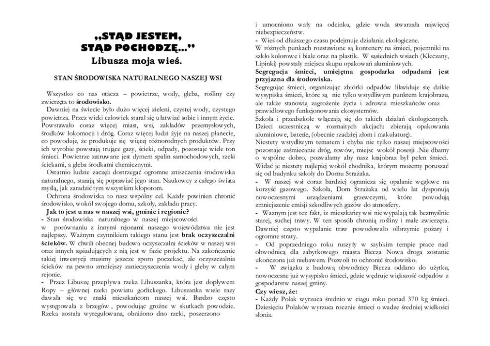 „STĄD JESTEM, STĄD POCHODZĘ…” Libusza moja wieś. STAN ŚRODOWISKA NATURALNEGO NASZEJ WSI Wszystko co nas otacza – powietrze, wody, gleba, rośliny czy zwierzęta to środowisko. Dawniej na świecie było duŜo więcej zieleni, czystej wody, czystego powietrza. Przez wieki człowiek starał się ułatwiać sobie i innym Ŝycie. Powstawało coraz więcej miast, wsi, zakładów przemysłowych, środków lokomocji i dróg. Coraz więcej ludzi Ŝyje na naszej planecie, co powoduje, Ŝe produkuje się więcej róŜnorodnych produktów. Przy ich wyrobie powstają trujące gazy, ścieki, odpady, pozostaje wiele ton śmieci. Powietrze zatruwane jest dymem spalin samochodowych, rzeki ściekami, a gleba środkami chemicznymi. Ostatnio ludzie zaczęli dostrzegać ogromne zniszczenia środowiska naturalnego, starają się poprawiać jego stan. Naukowcy z całego świata myślą, jak zaradzić tym wszystkim kłopotom. Ochrona środowiska to nasz wspólny cel. KaŜdy powinien chronić środowisko, wokół swojego domu, szkoły, zakładu pracy. Jak to jest u nas w naszej wsi, gminie i regionie? - Stan środowiska naturalnego w naszej miejscowości w porównaniu z innymi rejonami naszego województwa nie jest najlepszy. WaŜnym czynnikiem takiego stanu jest brak oczyszczalni ścieków. W chwili obecnej budowa oczyszczalni ścieków w naszej wsi oraz innych sąsiadujących z nią jest w fazie projektu. Na zakończenie takiej inwestycji musimy jeszcze sporo poczekać, ale oczyszczalnia ścieków na pewno zmniejszy zanieczyszczenia wody i gleby w całym rejonie. - Przez Libuszę przepływa rzeka Libuszanka, która jest dopływem Ropy – głównej rzeki powiatu gorlickego. Libuszanka wiele razy dawała się we znaki mieszkańcom naszej wsi. Bardzo często występowała z brzegów , powodując groźne w skutkach powodzie. Rzeka została wyregulowana, obniŜono dno rzeki, poszerzono i umocniono wały na odcinku, gdzie woda stwarzała najwięcej niebezpieczeństw. - Wieś od dłuŜszego czasu podejmuje działania ekologiczne. W róŜnych punkach rozstawione są kontenery na śmieci, pojemniki na szkło kolorowe i białe oraz na plastik. W sąsiednich wsiach (Kleczany, Lipinki) powstały miejsca skupu opakowań aluminiowych. Segregacja śmieci, umiejętna gospodarka odpadami jest przyjazna dla środowiska. Segregując śmieci, organizując zbiórki odpadów likwiduje się dzikie wysypiska śmieci, które są nie tylko wstydliwym punktem krajobrazu, ale takŜe stanowią zagroŜenie Ŝycia i zdrowia mieszkańców oraz prawidłowego funkcjonowania ekosystemów. Szkoła i przedszkole włączają się do takich działań ekologicznych. Dzieci uczestniczą w rozmaitych akcjach: zbierają opakowania aluminiowe, baterie, (obecnie rzadziej złom i makulaturę). Niestety wstydliwym tematem i chyba nie tylko naszej miejscowości pozostaje zaśmiecanie dróg, rowów, miejsc wokół posesji .Nie dbamy o wspólne dobro, pozwalamy aby nasz krajobraz był pełen śmieci. Widać je niestety najlepiej wokół chodnika, którym moŜemy poruszać się od budynku szkoły do Domu StraŜaka. - W naszej wsi coraz bardziej ogranicza się opalanie węglowe na korzyść gazowego. Szkoła, Dom StraŜaka od wielu lat dysponują nowoczesnymi urządzeniami grzewczymi, które powodują zmniejszenie emisji szkodliwych gazów do atmosfery. - WaŜnym jest teŜ fakt, iŜ mieszkańcy wsi nie wypalają tak bezmyślnie starej, suchej trawy. W ten sposób chronią rośliny i małe zwierzęta. Dawniej często wypalanie traw powodowało olbrzymie poŜary i ogromne straty. - Od poprzedniego roku ruszyły w szybkim tempie prace nad obwodnicą dla zabytkowego miasta Biecza Nowa droga zostanie ukończona juŜ niebawem. Pozwoli to ochronić środowisko. W związku z budową obwodnicy Biecza oddano do uŜytku, nowoczesne juŜ wysypisko śmieci, gdzie wędruje większość odpadów z gospodarstw naszej gminy. Czy wiesz, Ŝe: - KaŜdy Polak wyrzuca średnio w ciągu roku ponad 370 kg śmieci. Dziesięciu Polaków wyrzuca rocznie śmieci o wadze średniej wielkości słonia. - Drzewa dostarczają tlenu, którym oddychamy. Jedno drzewo produkuje tyle tlenu, ile pięć osób potrzebuje do Ŝycia w ciągu roku. Drzewa utrzymują wilgoć, dają cień, wyłapują pyły i upiększają krajobraz. - Trzeba posadzić aŜ 2700 młodych drzewek, aby wyprodukowały tyle samo tlenu, ile jeden 100-letni buk. Mimo zagroŜeń jakie niesie rozwój cywilizacji moŜemy cieszyć się w naszej wsi pięknymi widokami gór, lasów, zagajników, roślin i zwierząt. Właściwie na terenie wsi nie ma większych lasów, są to raczej młode zagajniki, złoŜone głównie z drzew liściastych. Rosną one najczęściej wzdłuŜ rzeki i potoków. W ostatnich latach mieszkańcy wsi zasadzili mnóstwo drzewek iglastych i liściastych. W ten sposób powstały nowe, zalesione miejsca. Trzeba teŜ zauwaŜyć, Ŝe w naszym środowisku Ŝyją rozmaite zwierzęta. Coraz łatwiej moŜna spotkać sarnę czy usłyszeć śpiewy przylatujących do nas ptaków. Uczniowie klasy III a, naleŜący do Koła Artystycznego bardzo chętnie rozpoczęli w swoim środowisku poszukiwania starych, wysokich drzew, o grubych pniach. Dzieci mierzyły pnie tych drzew i szukały informacji na ich temat u swoich Dziadków i ludzi starszych. W ten sposób rozpoczęta została lista najciekawszych okazów drzew w naszej miejscowości, którą dzieci będą się starały rozszerzać i uzupełniać. „Przy naszym polu, koło łąki jest niewielki las. Rosną tam olchy, brzozy i dęby. Największy dąb ma w obwodzie pnia 280 cm i liczy ok. 75 la. Mniejszy dąb ma w obwodzie 215 cm i liczy ok. 60 lat.” Jadwiga Ludwin (Podlesie) „W ogrodzie domu, w którym mieszkam rośnie stary orzech, którego obwód pnia wynosi 282 cm To drzewo ma ok. 90 lat” Norbert Pijanowski (Pasternik) „Nieopodal mojego domu rośnie bardzo stara lipa. Obwód jej pnia wynosi 262 cm To drzewo liczy ok. 85 lat.” Grzegorz Rządca (Podw