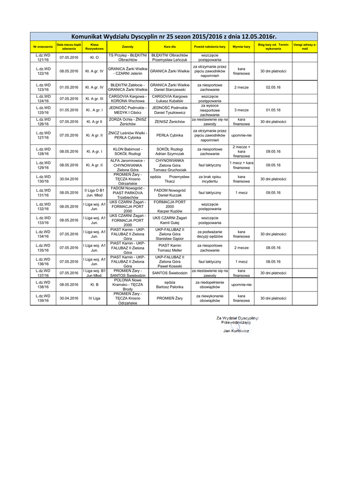 Komunikat Wydziału Dyscyplin nr 25 sezon 2015/2016 z dnia 12.05.2016r. Nr orzeczenia Data meczu bądź zdarzenia Klasa Rozrywkowa Zawody Kara dla Powód nałożenia kary L.dz.WD 121/16 07.05.2016 Kl. O TS Przylep - BŁĘKITNI Olbrachtów BŁĘKITNI Olbrachtów Przemysław Leńczuk wszczęcie postępowania L.dz.WD 122/16 08.05.2016 Kl. A gr. IV GRANICA Żarki Wielkie GRANICA Żarki Wielkie - CZARNI Jelenin L.dz.WD 123/16 01.05.2016 Kl. A gr. IV BŁĘKITNI Zabłocie - GRANICA Żarki Wielkie GRANICA Żarki Wielkie Daniel Starczewski L.dz.WD 124/16 07.05.2016 Kl. A gr. III CARGOVIA Kargowa KORONA Wschowa CARGOVIA Kargowa Łukasz Kubalski L.dz.WD 125/16 01.05.2016 Kl.. A gr. I JEDNOŚĆ Podmokle MEDYK I Cibórz JEDNOŚĆ Podmokle Daniel Tyszkiewicz L.dz.WD 126/16 07.05.2016 Kl. A gr II ZORZA Ochla - ŻNISZ Żenichów ŻENISZ Żenichów Wymiar kary Bieg kary od. Termin wykonania za otrzymanie przez pięciu zawodników napomnień kara finansowa 30 dni płatności za niesportowe zachowanie 2 mecze 02.05.16 wszczęcie postępowania za wysoce niesportowe zachowanie za niestawienie się na zawody 3 mecze 01.05.16 kara finansowa 30 dni płatności L.dz.WD 127/16 07.05.2016 Kl. A gr. II ZNICZ Leśniów Wielki PERŁA Cybinka PERŁA Cybinka za otrzymanie przez pięciu zawodników napomnień L.dz.WD 128/16 08.05.2016 Kl. A gr. I KLON Babimost SOKÓŁ Rozłogi SOKÓŁ Rozłogi Adrian Szymczak za niesportowe zachowanie 2 mecze + kara finansowa 09.05.16 L.dz.WD 129/16 08.05.2016 Kl. A gr. II CHYNOWIANKA Zielona Góra Tomasz Gruchociak faul taktyczny 1 mecz + kara finansowa 09.05.16 L.dz.WD 130/16 30.04.2016 za brak opisu incydentu kara finansowa 30 dni płatności L.dz.WD 131/16 08.05.2016 ALFA Jaromirowice CHYNOWIANKA Zielona Góra PROMIEŃ Żary TĘCZA Krosno Odrzańskie FADOM Nowogród PIAST PARKOVA Trzebiechów UKS CZARNI Żagań FORMACJA PORT 2000 UKS CZARNI Żagań FORMACJA PORT 2000 PIAST Karnin - UKPFALUBAZ II Zielona Góra PIAST Karnin - UKPFALUBAZ II Zielona Góra PIAST Karnin - UKPFALUBAZ II Zielona Góra PROMIEŃ Żary SANTOS Świebodzin POLONIA Nowe Kramsko - TĘCZA Brody PROMIEŃ Żary TĘCZA Krosno Odrzańskie FADOM Nowogród Daniel Kuczak faul taktyczny 1 mecz 09.05.16 FORMACJA PORT 2000 Kacper Kuziów wszczęcie postępowania UKS CZARNI Żagań Kamil Gulej wszczęcie postępowania UKP-FALUBAZ II Zielona Góra Stanisław Gąsior za podważanie decyzji sędziów kara finansowa 30 dni płatności PIAST Karnin Tomasz Meller za niesportowe zachowanie 2 mecze 08.05.16 UKP-FALUBAZ II Zielona Góra Paweł Koseski faul taktyczny 1 mecz 08.05.16 SANTOS Świebodzin za niestawienie się na zawody kara finansowa 30 dni płatności sędzia Bartosz Palonka za niedopełnienie obowiązków upomnie-nie PROMIEŃ Żary za niewykonanie obowiązków kara finansowa II Liga O B1 Jun. Młod L.dz.WD 132/16 08.05.2016 I Liga woj. A1 Jun. L.dz.WD 133/16 08.05.2016 I Liga woj. A1 Jun. L.dz.WD 134/16 07.05.2016 I Liga woj. A1 Jun. L.dz.WD 135/16 07.05.2016 I Liga woj. A1 Jun. L.dz.WD 136/16 07.05.2016 I Liga woj. A1 Jun. L.dz.WD 137/16 07.05.2016 I Liga woj. B1 Jun Młod. L.dz.WD 138/16 08.05.2016 Kl. B L.dz.WD 139/16 30.04.2016 IV Liga sędzia Przemysław Tkacz upomnie-nie 30 dni płatności Uwagi adresy email