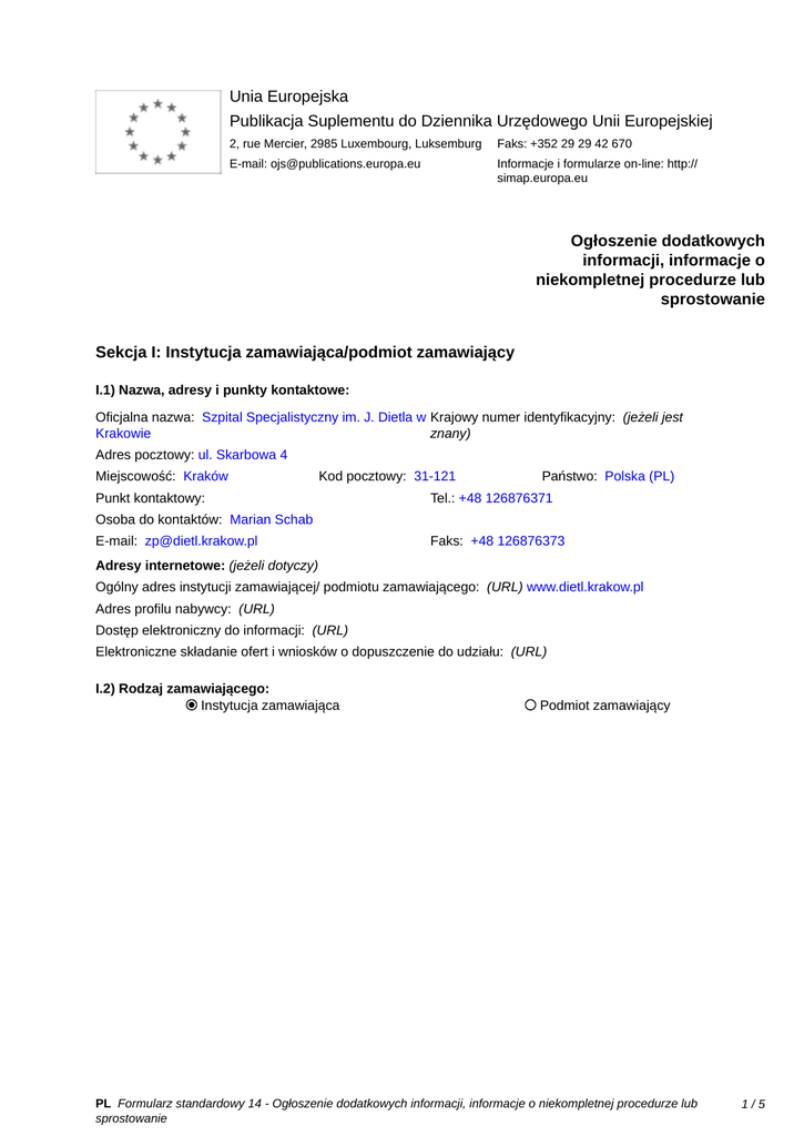 Unia Europejska Publikacja Suplementu do Dziennika Urzędowego Unii Europejskiej 2, rue Mercier, 2985 Luxembourg, Luksemburg Faks: +352 29 29 42 670 E-mail: [email protected] Informacje i formularze on-line: http:// simap.europa.eu Ogłoszenie dodatkowych informacji, informacje o niekompletnej procedurze lub sprostowanie Sekcja I: Instytucja zamawiająca/podmiot zamawiający I.1) Nazwa, adresy i punkty kontaktowe: Oficjalna nazwa: Szpital Specjalistyczny im. J. Dietla w Krajowy numer identyfikacyjny: (jeżeli jest Krakowie znany) _____ Adres pocztowy: ul. Skarbowa 4 Miejscowość: Kraków Kod pocztowy: 31-121 Punkt kontaktowy: _____ Państwo: Polska (PL) Tel.: +48 126876371 Osoba do kontaktów: Marian Schab E-mail: [email protected] Faks: +48 126876373 Adresy internetowe: (jeżeli dotyczy) Ogólny adres instytucji zamawiającej/ podmiotu zamawiającego: (URL) www.dietl.krakow.pl Adres profilu nabywcy: (URL) _____ Dostęp elektroniczny do informacji: (URL) _____ Elektroniczne składanie ofert i wniosków o dopuszczenie do udziału: (URL) _____ I.2) Rodzaj zamawiającego: Instytucja zamawiająca Podmiot zamawiający PL Formularz standardowy 14 - Ogłoszenie dodatkowych informacji, informacje o niekompletnej procedurze lub sprostowanie 1/5 Sekcja II: Przedmiot zamówienia II.1.1) Nazwa nadana zamówieniu: Dostawa implantów wraz z instrumentarium dla Bloku Operacyjnego Szpitala Specjalistycznego im. J. Dietla al. Focha 33 w Krakowie. ZP/30/2014 II.1.2) Krótki opis zamówienia lub zakupu: (podano w pierwotnym ogłoszeniu) Dostawa implantów wraz z instrumentarium dla Bloku Operacyjnego Szpitala Specjalistycznego im. J. Dietla al. Focha 33 w Krakowie.W cenie oferty Dostawca uwzględni koszt przeszkolenia personelu – osób wskazanych przez Zamawiającego. Szkolenia obejmować będą wyłącznie zakres wiedzy merytorycznej związanej z użyciem wyrobów, które Dostawca dostarczy w ramach niniejszej umowy. Harmonogram szkoleń oraz ich zakres opracuje i przedstawi Dostawca. Zamawiający dokona wyboru osób uczestniczących w szkoleniu spośród swego personelu. Wszystkie szkolenia Dostawca przeprowadzi w języku polskim lub angielskim, zapewniając na swój koszt wszystkie niezbędne do realizacji szkolenia materiały. Szkolenia zostaną przeprowadzone w siedzibie Zamawiającego lub innym dogodnym dla obu stron miejscu. Zakończenie szkoleń potwierdzone będzie protokołem, sporządzonym oddzielnie dla każdej szkolonej grupy, w dwóch jednobrzmiących egzemplarzach, po jednym dla każdej ze stron. II.1.3) Wspólny Słownik Zamówień (CPV) Główny przedmiot Dodatkowe przedmioty Słownik główny 33100000 33141000 33183100 33697110 33000000 Słownik uzupełniający (jeżeli dotyczy) PL Formularz standardowy 14 - Ogłoszenie dodatkowych informacji, informacje o niekompletnej procedurze lub sprostowanie 2/5 Sekcja IV: Procedura IV.1)Rodzaj procedury (podano w pierwotnym ogłoszeniu) Otwarta Ograniczona Ograniczona przyspieszona Negocjacyjna Negocjacyjna przyspieszona Dialog konkurencyjny Negocjacyjna z uprzednim ogłoszeniem Negocjacyjna bez uprzedniego ogłoszenia Negocjacyjna z publikacją ogłoszenia o zamówieniu Negocjacyjna bez publikacji ogłoszenia o zamówieniu Udzielenie zamówienia bez uprzedniej publikacji ogłoszenia o zamówieniu w Dzienniku Urzędowym Unii Europejskiej IV.2)Informacje administracyjne IV.2.1)Numer referencyjny: (podano w pierwotnym ogłoszeniu) ZP/30/2014 IV.2.2)Dane referencyjne ogłoszenia w przypadku ogłoszeń przesłanych drogą elektroniczną: Pierwotne ogłoszenie przesłane przez eNotices TED eSender Login: ENOTICES_Anetka1979 Dane referencyjne ogłoszenia: 2014-157754 rok i numer dokumentu IV.2.3)Ogłoszenie, którego dotyczy niniejsza publikacja: Numer ogłoszenia w Dz.U.: 2014/S 232-408694 z dnia: 02/12/2014 (dd/mm/rrrr) IV.2.4)Data wysłania pierwotnego ogłoszenia: 27/11/2014 (dd/mm/rrrr) PL Formularz standardowy 14 - Ogłoszenie dodatkowych informacji, informacje o niekompletnej procedurze lub sprostowanie 3/5 Sekcja VI: Informacje uzupełniające VI.1) Ogłoszenie dotyczy: Procedury niepełnej Sprostowania Informacji dodatkowych VI.2) Informacje na temat niepełnej procedury udzielenia zamówienia: Postępowanie o udzielenie zamówienia zostało przerwane Postępowanie o udzielenie zamówienia uznano za nieskuteczne Zamówienia nie udzielono Zamówienie może być przedmiotem ponownej publikacji VI.3) Informacje do poprawienia lub dodania : VI.3.1) Zmiana oryginalnej informacji podanej przez instytucję zamawiającą Publikacja w witrynie TED niezgodna z oryginalną informacją, przekazaną przez instytucję zamawiającą Oba przypadki VI.3.2) W ogłoszeniu pierwotnym W odpowiedniej dokumentacji przetargowej (więcej informacji w odpowiedniej dokumentacji przetargowej) W obu przypadkach (więcej informacji w odpowiedniej dokumentacji przetargowej) VI.3.3) Tekst, który należy poprawić w pierwotnym ogłoszeniu Miejsce, w którym znajduje się Zamiast: Powinno być: zmieniany tekst: Warunkiem udziału w postępowaniu Warunkiem udziału w postępowaniu III.1.1)Wymagane wadia i gwarancje: jest wniesienie przez Dostawcę jest wniesienie przez Dostawcę wadium w odpowiedniej wysokości wadium w odpowiedniej wysokości na poszczególne Pakiety, które na poszczególne Pakiety, które podane zostały w Rodziale 13 SIWZ. podane zostały w Rodziale 13 SIWZ. 1. Wadium wniesione w pieniądzu 1. Wadium wniesione w pieniądzu należy wpłacić przelewem na należy wpłacić przelewem na rachunek bankowy Zamawiającego rachunek bankowy Zamawiającego BOŚ S.A. I Oddz. Operacyjny w BOŚ S.A. I Oddz. Operacyjny w Krakowie nr 07 1540 1115 2111 1341 Krakowie nr 07 1540 1115 2111 1341 9989 0002 z oznaczeniem: „Przetarg 9989 0003 z oznaczeniem: „Przetarg nieograniczony na: Dostawę nieograniczony na: Dostawę implantów nr sprawy ZP/30 /2014”. implantów nr sprawy ZP/30 /2014”. VI.3.4) Daty, które należy poprawić w pierwotnym ogłoszeniu Miejsce, w któr