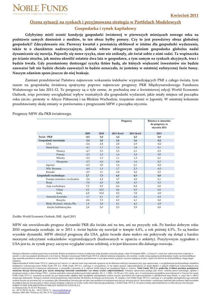 Kwiecień 2011 Ocena sytuacji na rynkach i przyjmowana strategia w Portfelach Modelowych Gospodarka i rynek kapitałowy Gdybyśmy mieli ocenić kondycję gospodarki światowej w pierwszych miesiącach nowego roku na podstawie samych doniesień z mediów, to ten obraz byłby ponury. Czy to jest prawdziwy obraz globalnej gospodarki? Zdecydowanie nie. Pierwszy kwartał z pewnością obfitował w istotne dla gospodarki wydarzenia, także te o charakterze nadzwyczajnym, jednak wbrew obiegowym opiniom gospodarka globalna nadal dynamicznie się rozwija. Pojawiły się nowe ryzyka, stare nie zniknęły, ale świat sobie z nimi radzi. Ta wspinaczka po ścianie strachu, jak można określić ostatnie dwa lata w gospodarce, a tym samym na rynkach akcyjnych, trwa i będzie trwała. Gdy przestaniemy dostrzegać ryzyka (które będą, ale których większość inwestorów nie będzie zauważać lub nie będzie chciała zauważyć) to będzie oznaczało, że jesteśmy w ostatniej euforycznej fazie hossy. Naszym zdaniem sporo jeszcze do niej brakuje. Zamiast przedstawiać Państwu najnowsze wskazania indeksów wyprzedzających PMI z całego świata, tym razem na gospodarkę światową spojrzymy poprzez najnowsze prognozy PKB Międzynarodowego Funduszu Walutowego na lata 2011-12. Te prognozy są o tyle cenne, że pochodzą one z kwietniowej edycji World Economic Outlook, więc powinny uwzględniać wpływ rozmaitych dla gospodarki wydarzeń, jakie miały miejsce od początku roku (m.in.: protesty w Afryce Północnej i na Bliskim Wschodzie, trzęsienie ziemi w Japonii). W ostatniej kolumnie przedstawiamy skalę zmiany w porównaniu z prognozami MFW z początku stycznia. Prognozy MFW dla PKB światowego. Prognozy Świat - PKB Gospodarki rozwinięte USA Strefa Euro Niemcy Francja Włochy Hiszpania Japonia Wlk. Brytania Kanada Gospodarki wschodzące Europa centralna i wschodnia Rosja Azja wschodząca Chiny Indie Ameryka Łacińska Brazylia Bliski Wschód i Afryka Płn. Afryka SubSaharyjska 2009 -0,5 -3,4 -2,6 -4,1 -4,7 -2,5 -5,2 -3,7 -6,3 -4,9 -2,5 2,7 -3,6 -7,8 7,2 9,2 6,8 -1,7 -0,6 1,8 2,8 2010 5,0 3,0 2,8 1,7 3,5 1,5 1,3 -0,1 3,9 1,3 3,1 7,3 4,2 4,0 9,5 10,3 10,4 6,1 7,5 3,8 5,0 2011 (kwi) 4,4 2,4 2,8 1,6 2,5 1,6 1,1 0,8 1,4 1,7 2,8 6,5 3,7 4,8 8,4 9,6 8,2 4,7 4,5 4,1 5,5 2012 (kwi) 4,5 2,6 2,9 1,8 2,1 1,8 1,3 1,6 2,1 2,3 2,6 6,5 4,0 4,5 8,4 9,5 7,8 4,2 4,1 4,2 5,9 Różnica w stosunku do prognozy ze stycznia 2011 2011 0,0 -0,1 -0,2 0,1 0,3 0,0 0,1 0,2 -0,2 -0,3 0,5 0,0 0,1 0,3 0,0 0,0 -0,2 0,4 0,0 -0,5 0,0 Źródło: World Economic Outlook, IMF, April 2011 MFW nie zrewidowało prognoz dynamiki PKB dla świata ani na ten, ani na przyszły rok. Po bardzo dobrym roku 2010 organizacja oczekuje, że w 2011 r. świat będzie się rozwijał w tempie 4.4%, a rok później 4.5%. To są bardzo wysokie dynamiki. MFW obniżył prognozę dla USA, gdzie twarde dane makro nie pokrywały się dotąd z bardzo mocnymi odczytami wskaźników wyprzedzających (budowanych w oparciu o ankiety). Pozytywnym sygnałem z USA jest to, że rynek pracy zaczyna wyglądać coraz solidniej, a to jest kluczowe dla dalszego rozwoju. Niniejszy dokument został przygotowany na potrzeby Klienta na podstawie Umowy świadczenia usług doradztwa inwestycyjnego z dnia 24 listopada 2008 r. („Umowa”) i może być wykorzystywany wyłącznie w sposób, w celu i na zasadach określonych w tej Umowie. Doradcy inwestycyjni Noble Funds TFI S.A. dołożyli należytej staranności, aby rzetelnie i wedle swojej najlepszej profesjonalnej wiedzy na dzień publikacji tego materiału przedstawić informacje w nim zawarte. Wszystkie opinie i prognozy przedstawione w tym opracowaniu są jedynie wyrazem najlepszej wiedzy i opinii ich autorów na dzień publikacji i mogą ulegać zmianom. Odpowiedzialność Noble Funds TFI S.A. oparta jest na Umowie i w zakresie treści tego materiału ogranicza się do dołożenia należytej staranności przy jego opracowaniu, z uwzględnieniem profesjonalnego charakteru działalności wykonywanej przez Noble Funds TFI S.A. Noble Funds TFI S.A. zastrzega w szczególności, iż nie będzie ponosić odpowiedzialności za skutki błędów w danych źródłowych wykorzystanych przy analizach umieszczonych w niniejszym dokumencie, w przypadku wykazania, iż w zakresie źródła danych nie popełniono błędu w wyborze. Noble Funds TFI S.A: podkreśla, iż Klient powinien podejmować ostateczne decyzje inwestycyjne przy użyciu niniejszego materiału samodzielnie i na własne ryzyko i odpowiedzialność. Niniejsze opracowanie podlega jako utwór ochronie prawa autorskiego, zgodnie z przepisami ustawy z dnia 4 lutego 1994 r. o prawie autorskim i prawach pokrewnych (tekst jednolity: Dz. U. z 2006 r. Nr 90, poz. 631 z późn. zm.). Z zastrzeżeniem przypadków przewidzianych w Umowie bez zgody Noble Funds TFI S.A. wyrażonej na piśmie nie jest dopuszczalne odpłatne bądź nieodpłatne udostępnianie osobom trzecim, powielanie lub rozpowszechnianie w jakiejkolwiek innej formie, w części lub w całości niniejszego dokumentu. Niniejszy materiał został przygotowany indywidualnie dla Klienta, do którego jest kierowany. W związku z tym Noble Funds TFI S.A. zastrzega, iż w przypadku udostępnienia tego materiału osobom trzecim nie powinien być on rozumiany jako rekomendacja inwestycyjna ani jako inna podstawa do podejmowania decyzji inwestycyjnych. Skorzystanie z niniejszego materiału jako podstawy bądź przesłanki do podjęcia decyzji inwestycyjnej w takiej sytuacji następuje wyłącznie na ryzyko osoby, która taką decyzję podejmuje, a Noble Funds TFI S.A. nie ponosi żadnej odpowiedzialności za takie decyzje inwestycyjne. NOBLE FUNDS TOWARZYSTWO FUNDUSZY INWESTYCYJNYCH S.A. ul. Domaniewska 39, 02-672 Warszawa tel. +48 22 288 81 30, fax. +48 22 288 81 31 , [email protected] Infolinia: 0801 080 770 lub tel. 022 588 18 79, www.noblefunds.pl Bardzo dobre dane płyną z Niemiec i to skłoniło MFW z kolei do rewizji PKB w 