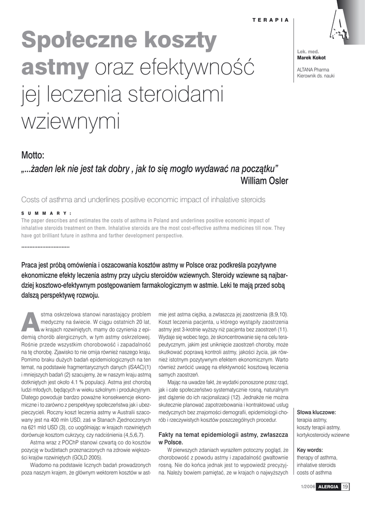 T E R A P I A Społeczne koszty astmy oraz efektywność jej leczenia steroidami wziewnymi Lek. med. Marek Kokot ALTANA Pharma Kierownik ds. nauki Motto: „...żaden lek nie jest tak dobry , jak to się mogło wydawać na początku” William Osler Costs of asthma and underlines positive economic impact of inhalative steroids S U M M A R Y : The paper describes and estimates the costs of asthma in Poland and underlines positive economic impact of inhalative steroids treatment on them. Inhalative steroids are the most cost-effective asthma medicines till now. They have got brilliant future in asthma and farther development perspective. .............................. Praca jest próbą omówienia i oszacowania kosztów astmy w Polsce oraz podkreśla pozytywne ekonomiczne efekty leczenia astmy przy użyciu steroidów wziewnych. Steroidy wziewne są najbardziej kosztowo-efektywnym postępowaniem farmakologicznym w astmie. Leki te mają przed sobą dalszą perspektywę rozwoju. A stma oskrzelowa stanowi narastający problem medyczny na świecie. W ciągu ostatnich 20 lat, w krajach rozwiniętych, mamy do czynienia z epidemią chorób alergicznych, w tym astmy oskrzelowej. Rośnie przede wszystkim chorobowość i zapadalność na tę chorobę. Zjawisko to nie omija również naszego kraju. Pomimo braku dużych badań epidemiologicznych na ten temat, na podstawie fragmentarycznych danych (ISAAC)(1) i mniejszych badań (2) szacujemy, że w naszym kraju astmą dotkniętych jest około 4.1 % populacji. Astma jest chorobą ludzi młodych, będących w wieku szkolnym i produkcyjnym. Dlatego powoduje bardzo poważne konsekwencje ekonomiczne i to zarówno z perspektywy społeczeństwa jak i ubezpieczycieli. Roczny koszt leczenia astmy w Australii szacowany jest na 400 mln USD, zaś w Stanach Zjednoczonych na 621 mld USD (3), co uogólniając w krajach rozwiniętych dorównuje kosztom cukrzycy, czy nadciśnienia (4,5,6,7). Astma wraz z POChP stanowi czwartą co do kosztów pozycję w budżetach przeznaczonych na zdrowie większości krajów rozwiniętych (GOLD 2005). Wiadomo na podstawie licznych badań prowadzonych poza naszym krajem, że głównym wektorem kosztów w ast- mie jest astma ciężka, a zwłaszcza jej zaostrzenia (8,9,10). Koszt leczenia pacjenta, u którego wystąpiły zaostrzenia astmy jest 3-krotnie wyższy niż pacjenta bez zaostrzeń (11). Wydaje się wobec tego, że skoncentrowanie się na celu terapeutycznym, jakim jest uniknięcie zaostrzeń choroby, może skutkować poprawą kontroli astmy, jakości życia, jak również istotnym pozytywnym efektem ekonomicznym. Warto również zwrócić uwagę na efektywność kosztową leczenia samych zaostrzeń. Mając na uwadze fakt, że wydatki ponoszone przez rząd, jak i całe społeczeństwo systematycznie rosną, naturalnym jest dążenie do ich racjonalizacji (12). Jednakże nie można skutecznie planować zapotrzebowania i kontraktować usług medycznych bez znajomości demografii, epidemiologii chorób i rzeczywistych kosztów poszczególnych procedur. Fakty na temat epidemiologii astmy, zwłaszcza w Polsce. W pierwszych zdaniach wyraziłem potoczny pogląd, że chorobowość z powodu astmy i zapadalność gwałtownie rosną. Nie do końca jednak jest to wypowiedź precyzyjna. Należy bowiem pamiętać, ze w krajach o najwyższych Słowa kluczowe: terapia astmy, koszty terapii astmy, kortykosteroidy wziewne Key words: therapy of asthma, inhalative steroids costs of asthma 1/2006 ALERGIA 19 T E R A P I A odsetkach występowania astmy w ostatnich latach wzrost ten został zahamowany i utrzymuje się stale na poziomie około 20% (13). W Polsce, chociaż szacowana, bezwzględna liczba chorych jest duża - 1.6 mln dotkniętych astmą, to jednak trzeba pamiętać, że Polska należy (na szczęście!) do krajów o najniższej zapadalności na astmę, zwłaszcza wśród krajów rozwiniętych. Natomiast stosunkowo wysoka jest w Polsce śmiertelność z powodu astmy (6.6 na 100 000 chorych), co oznacza, że rocznie w Polsce ginie z powodu astmy 105 osób (13). Ciekawe dlaczego tak się dzieje i czy wraz z przyspieszonym rozwojem cywilizacyjnym będziemy obserwowali epidemię chorób alergicznych, w tym astmy w naszym kraju? Jest to o tyle ważne, że moglibyśmy przewidywać jakie czekają nas jako społeczeństwo, wydatki związane z chorobowością na astmę oraz leczeniem pacjentów dotkniętych tą chorobą. Ile kosztuje nas astma? Nie do końca wiadomo. Jedyne dwie publikacje jakie udało mi się odnaleźć na ten temat koncentrują się na szacowaniu kosztów pośrednich i bezpośrednich leczenia zaostrzeń astmy w Polsce (14,15) Autorzy tych publikacji wychodzą z nieco uproszczonego założenia, wyrażonego zresztą wcześniej we wstępie, że podobnie jak w innych, tak i w naszym kraju, głównym wektorem kosztów w astmie są zaostrzenia tej choroby. Nie wiemy tego z całą pewnością. Niemniej kwestionariuszowe badania przekrojowe prowadzone na ten temat przez firmę Altana Pharma, w Polsce i na świecie, pośrednio potwierdzają, że około 41% chorych na astmę w naszym kraju, w ciągu roku musi korzystać z dodatkowych, niezaplanowanych wizyt lekarskich, 15% odwiedza izbę przyjęć szpitala, a 13% jest hospitalizowanych (wyniki w zasobach firmy Altana) (16). Cytowane powyżej badania, wskazują dosyć zgodnie, że bezpośredni koszt leczenia zaostrzenia w warunkach szpitalnych w Polsce wynosi odpowiednio 3 988 i 3 190 PLN (14,15). Niestety koszty całkowite; pośrednie i bezpośrednie, zmierzone i oszacowane były tylko w pierwszym z dwóch badań i wyniosły około 4 428 PLN. Również tylko to badanie oceniło koszty bezpośrednie i pośrednie wynikające ze zużycia zasobów potrzebnych do leczenia ambulatoryjnego zaostrzenia astmy (tab.1). Mając dokładne dane na temat średnich kosztów leczenia zaostrzeń astmy w Polsce i szacunkowych, kwestionariuszowych danych o korzystaniu przez chorych z różnych form nieplanowanej 