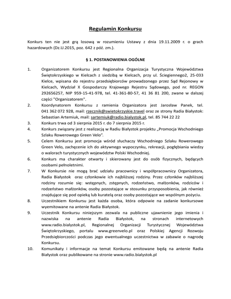 Regulamin Konkursu Konkurs ten nie jest grą losową w rozumieniu Ustawy z dnia 19.11.2009 r. o grach hazardowych (Dz.U.2015, poz. 642 z póź. zm.). § 1. POSTANOWIENIA OGÓLNE 1. 2. 3. 4. 5. 6. 7. 8. 9. 10. Organizatorem Konkursu jest Regionalna Organizacja Turystyczna Województwa Świętokrzyskiego w Kielcach z siedzibą w Kielcach, przy ul. Ściegiennego2, 25-033 Kielce, wpisana do rejestru przedsiębiorców prowadzonego przez Sąd Rejonowy w Kielcach, Wydział X Gospodarczy Krajowego Rejestru Sądowego, pod nr. REGON 292656257, NIP 959-15-41-978, tel. 41-361-80-57, 41 36 81 200, zwane w dalszej części "Organizatorem". Koordynatorem Konkursu z ramienia Organizatora jest Jarosław Panek, tel. 041 362 072 928, mail: [email protected] oraz ze strony Radia Białystok: Sebastian Artemiuk, mail: [email protected], tel. 85 744 22 22 Konkurs trwa od 3 sierpnia 2015 r. do 7 sierpnia 2015 r. Konkurs związany jest z realizacją w Radiu Białystok projektu „Promocja Wschodniego Szlaku Rowerowego Green Velo”. Celem Konkursu jest promocja wśród słuchaczy Wschodniego Szlaku Rowerowego Green Velo, zachęcenie ich do aktywnego wypoczynku, rekreacji, pogłębiania wiedzy o walorach turystycznych województw Polski Wschodniej. Konkurs ma charakter otwarty i skierowany jest do osób fizycznych, będących osobami pełnoletnimi. W Konkursie nie mogą brać udziału pracownicy i współpracownicy Organizatora, Radia Białystok oraz członkowie ich najbliższej rodziny. Przez członków najbliższej rodziny rozumie się: wstępnych, zstępnych, rodzeństwo, małżonków, rodziców i rodzeństwo małżonków, osoby pozostające w stosunku przysposobienia, jak również znajdujące się pod opieką lub kuratelą oraz osoby pozostające we wspólnym pożyciu. Uczestnikiem Konkursu jest każda osoba, która odpowie na zadanie konkursowe wyemitowane na antenie Radia Białystok. Uczestnik Konkursu niniejszym zezwala na publiczne ujawnienie jego imienia i nazwiska na antenie Radia Białystok, na stronach internetowych www.radio.bialystok.pl, Regionalnej Organizacji Turystycznej Województwa Świętokrzyskiego, portalu www.greenvelo.pl oraz Polskiej Agencji Rozwoju Przedsiębiorczości podczas jego ewentualnego uczestnictwa w zabawie o nagrodę Konkursu. Komunikaty i informacje na temat Konkursu emitowane będą na antenie Radia Białystok oraz publikowane na stronie www.radio.bialystok.pl § 2. ZASADY KONKURSU 1. 2. 3. 4. 5. 6. 7. 8. Warunkiem uczestnictwa w Konkursie jest wysłuchanie na antenie Radia Białystok fragmentu słuchowiska „Legendy świętokrzyskie”, następnie nadesłanie za pośrednictwem e:maila odpowiedzi na dwa pytania, w tym jednego opisowego związanego z tematyką słuchowiska pod wskazany przez Organizatora adres: [email protected] wraz z danymi wskazanymi w ust. 7 niniejszego paragrafu, spełniającej wymagania Konkursu. Jest to równoznaczne ze zgłoszeniem i zaakceptowaniem regulaminu Konkursu. W tytule e:maila należy wpisać Green Velo Białystok W Konkursie będą rozpatrywane tylko i wyłącznie zgłoszenia, które wpłynęły do dnia 6 sierpnia 2015 roku do 23:59:59 na adres wskazany w ust. 1. Organizator nie ponosi odpowiedzialności za zgłoszenia, które nie dotarły do niego z przyczyn od niego niezależnych oraz za podanie przez Uczestników, nieprawdziwych danych lub danych osoby trzeciej. Podanie nieprawdziwych danych skutkuje odebraniem prawa do nagrody. Uczestnik może złożyć rezygnację z udziału w Konkursie do dnia 6 sierpnia 2015 r. do 23:59:59 przesyłając mailowo informację o rezygnacji na adres: [email protected], w temacie maila wpisując "rezygnacja" i podając swoje imię i nazwisko. Każdy Uczestnik Konkursu może nadesłać maksymalnie jedno zgłoszenie. Przyjmowanie e:maili z odpowiedziami rozpoczyna się od dnia 3 sierpnia 2015r., do dnia 6 sierpnia 2015 r. do godz. 23:59:59. E:maile nadesłane po tym terminie nie będą brały udziału w Konkursie. Uczestnik poprzez akceptację regulaminu w sposób określony w ust. 1 regulaminu, oświadcza, że przesłana przez niego treść odpowiedzi, jest jego autorstwa, nie narusza dóbr i praw osób trzecich, że posiada on pełnię praw autorskich do nadesłanej treści i przenosi je na Organizatora w zakresie niezbędnym do ich publikacji i/lub innego rozpowszechniania oraz oświadcza, że przenosi nieodpłatnie autorskie prawa majątkowe do nadesłanych treści na rzecz Organizatora na następujących polach eksploatacji: emisję na antenie, zwielokrotnianie, wykorzystywanie techniką drukarską i cyfrową, wystawianie, udostępnianie na stronach internetowych oraz we wszystkich materiałach promocyjnych i reklamowych, bez względu na sposób ich zwielokrotniania i wprowadzania do obrotu. Zgłoszenia niespełniające wymogów określonych w ust. 7 regulaminu, oraz bez imienia i nazwiska tylko np. z pseudonimem lub z niepełnymi danymi nie będą brały udziału w Konkursie. Organizator nie zwraca prac zgłoszonych do konkursu. Organizator zastrzega sobie możliwość nie wybrania żadnego zgłoszenia. § 3. PRZEBIEG KONKURSU 1. 2. 3. Przewidziano jedną edycję Konkursu trwającą od dnia 3. 08.2015 r. od godziny 06.00 do dnia 06.07.2015 do godziny 23:59:59. Nadesłane odpowiedzi będą wybierane według dwóch kryteriów: a. poprawna odpowiedź na pierwsze pytanie konkursowe b. najoryginalniejsze w swej treści dopisane zakończenie słuchowiska wyemitowanego na antenie Nazwiska zwycięzców Konkursu opublikujemy na stronach internetowych Radia Białystok, Regionalnej Organizacji Turystycznej Województwa Świętokrzyskiego www.greenvelo.pl., zaś zwycięzcy zostaną powiadomieni o wygranej telefonicznie. § 4. NAGRODY, WARUNKI ICH ODBIORU 1. 2. 3. 4. 5. 6. 7. Nagrodą dla zwycięzcy Konkursu jest rower turystyczny o wartości ok. 1800 zł. Fundatorem nagród w Konkursie jest Organizator Konkursu. Organizator nie dopuszcza możliwości zamiany nagrody na ekwiwalent pieniężny. Organizator może p