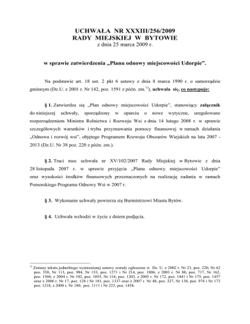 UCHWAŁA NR XXXIII/256/2009 RADY MIEJSKIEJ W BYTOWIE z dnia 25 marca 2009 r. w sprawie zatwierdzenia „Planu odnowy miejscowości Udorpie”. Na podstawie art. 18 ust. 2 pkt 6 ustawy z dnia 8 marca 1990 r. o samorządzie gminnym (Dz.U. z 2001 r. Nr 142, poz. 1591 z późn. zm.1)), uchwala się, co następuje: § 1. Zatwierdza się „Plan odnowy miejscowości Udorpie”, stanowiący załącznik do niniejszej uchwały, sporządzony w oparciu o nowe wytyczne, uregulowane rozporządzeniem Ministra Rolnictwa i Rozwoju Wsi z dnia 14 lutego 2008 r. w sprawie szczegółowych warunków i trybu przyznawania pomocy finansowej w ramach działania „Odnowa i rozwój wsi”, objętego Programem Rozwoju Obszarów Wiejskich na lata 2007 2013 (Dz.U. Nr 38 poz. 220 z późn. zm.). § 2. Traci moc uchwała nr XV/102/2007 Rady Miejskiej w Bytowie z dnia 28 listopada 2007 r. w sprawie przyjęcia „Planu odnowy miejscowości Udorpie” oraz wysokości środków finansowych przeznaczonych na realizację zadania w ramach Pomorskiego Programu Odnowy Wsi w 2007 r. § 3. Wykonanie uchwały powierza się Burmistrzowi Miasta Bytów. § 4. Uchwała wchodzi w Ŝycie z dniem podjęcia. 1) Zmiany tekstu jednolitego wymienionej ustawy zostały ogłoszone w Dz. U. z 2002 r. Nr 23, poz. 220, Nr 62 poz. 558, Nr 113, poz. 984, Nr 153, poz. 1271 i Nr 214, poz. 1806; z 2003 r. Nr 80, poz. 717, Nr 162, poz. 1568; z 2004 r. Nr 102, poz. 1055, Nr 116, poz. 1203, z 2005 r. Nr 172, poz. 1441 i Nr 175, poz. 1457 oraz z 2006 r. Nr 17, poz. 128 i Nr 181, poz. 1337 oraz z 2007 r. Nr 48, poz. 327, Nr 138, poz. 974 i Nr 173 poz. 1218, z 2008 r. Nr 180, poz. 1111 i Nr 223, poz. 1458. Załącznik do uchwały Nr XXXIII/256/2009 Rady Miejskiej w Bytowie z dnia 25.03.2009 r. PLAN ODNOWY MIEJSCOWOŚCI UDORPIE NA LATA 2009 – 2016 Udorpie 2009 2 ISTOTA OPRACOWANIA PLANU Plan odnowy miejscowości powstał w wyniku dyskusji na zebraniu wiejskim, po konsultacji z mieszkańcami i dotyczy kilku najbliższych lat. Określa najważniejsze kierunki działania, które pomogą rozwiązać problemy, pokonać bariery i osiągnąć stawiane sobie cele w miarę pozyskanych środków finansowych. Planowane zadania mieszkańcy uznali za realne do zrealizowania przy swoim zaangażowaniu oraz władz samorządowych Gminy Bytów. Plan odnowy stanowi również wyzwanie dla mieszkańców do realizacji własnych pomysłów oraz poprawy warunków życia. 1. CHARAKTERYSTYKA MIEJSCOWOŚCI Udorpie to wieś kaszubska leżąca w zachodniej części województwa pomorskiego przy trasie nieistniejącej już linii kolejowej (Lębork-Bytów) w pobliżu przebiegającej wschodnimi obrzeżami drogi wojewódzkiej nr 212. Na wschód od Udorpia znajduje się jezioro Mądrzechowskie. Udorpie położone jest w strefie ochronnej Parku Krajobrazowego „Dolina Słupi”. Wieś jest siedzibą sołectwa Udorpie, w którego skład wchodzi również miejscowość Półczynek oraz Osiedle Leśna. Miejscowość obejmuje obszar o powierzchni 1.276ha co stanowi 6,79% ogólnej powierzchni gminy Bytów. Udorpie łącznie z przysiółkiem Półczynek i Osiedlem Leśna liczy 923 mieszkańców (stan na dzień 31.12.2008). Najstarsza nazwa wsi brzmiała Höhendorf. Jest to nazwa powstała z dwóch członów gdzie pierwszy człon „hoch” oznacza wysoko położony, a drugi „dorf” oznacza wieś. Wieś lokowana przez Krzyżaków na prawie chełmińskim w 1346 roku. Według ksiąg z 1438 roku Udorpie stanowiło już majątek miejski Bytowa. W 1532 roku Udorpie zamieszkiwało 15 rodzin chłopskich, a areał ziemi wynosił 38 włók (682,29ha). Wiadomo, że od 1638r. folwark miejski (należący do Bytowa) był dzierżawiony. Mieszkańcami wsi byli głównie ewangeliccy Kaszubi. W końcu XVIII stulecia folwark w Udorpiu powiększono kosztem gospodarstw chłopskich. W 1885r. mieszkały tu 494 osoby, a łączny areał gruntów wynosił 1.044ha. W 1900r. dobra te jako domenę nabył skarb państwa. W 1932r. nastąpiła jej częściowa parcelacja. Po II wojnie światowej w Udorpiu osiedlono znaczną grupę Ukraińców wysiedlonych z Bieszczad w ramach akcji „Wisła”. Dziś wieś stanowi znany ośrodek kultury ukraińskiej. Od kilku lat w miesiącu lipcu odbywa się tu największa impreza na Pomorzu organizowana przez mniejszość ukraińską pn. „Bytowska Watra”. Impreza sprowadza do 3 miejscowości mniejszość ukraińską z całej Polski jak również z poza jej granic (m.in. Ukraina, Kanada). We wsi działa Rada Sołecka oraz Stowarzyszenie Kultury Fizycznej Klub Sportowy „Urania”. Infrastruktura techniczna spełnia bardzo istotne funkcje związane z rozwojem społecznogospodarczym danego obszaru. Udorpie na tle Gminy Bytów 2. INWENTARYZACJA ZASOBÓW SŁUŻĄCYCH ODNOWIE MIEJSCOWOŚCI a) zasoby przyrodnicze Rzeźba terenu jest bardzo urozmaicona ze względu na występowanie wielu zjawisk i procesów geomorfologicznych. 4 Krajobraz wsi urozmaica także duże i malownicze jezioro, które podnosi walory krajobrazowe miejscowości oraz jest ostoją dla ptactwa wodnego. Pełni też funkcję zbiornika retencyjnego w czasie ulew. Jezioro jest także wspaniałym miejscem wypoczynku turystów oraz wędkarzy. Na obszarze sołectwa znajduje się leśny rezerwat przyrody „Las nad Jeziorem Mądrzechowskim” (utworzony w 1998r., o powierzchni 25,34ha). Rezerwat obejmuje jary i wąwozy w okolicy jeziora Mądrzechowskiego porośnięte lasami grądowymi i łęgowymi. Ochronie rezerwatu podlega głównie występujący tu las mieszany. Znajdują się tu również stanowiska skrzypu olbrzymiego. Rezerwat przyrody „Las nad Jeziorem Mądrzechowskim” leży w obrębie potencjalnego specjalnego obszaru ochrony siedlisk Natura 2000 (kod PLH 220052 Dolina Rzeki Słupi). Na terenie Udorpia można także podziwiać drzewa uznane za pomniki przyrody. Dwa z nich to dęby szypułkowe, jeden buk zwyczajny oraz dwie lipy szerokolistne w wieku od 100 do 260 lat. Rezerwat Las nad Jeziorem Mądrzechowskim b) Dzied