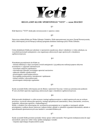 REGULAMIN KLUBU SPORTOWEGO "YETI" — sezon 2014/2015 §1 Klub Sportowy "YETI" działa jako stowarzyszenie w oparciu o statut. §2 Najwyższą władzą Klubu jest Walne Zebranie Członków. Klub reprezentowany jest przez Zarząd Stowarzyszenia, który zobowiązany jest do bieżącej realizacji programu działania ustalonego przez Walne Zebranie. §3 Celem działalności Klubu jest szkolenie w narciarstwie zjazdowym, dzieci i młodzieży w wieku szkolnym, na wszystkich poziomach umiejętności, oraz organizacja całorocznych zajęć sportowych o charakterze ogólnorozwojowym. §4 Warunkami przynależności do Klubu są: - złożenie deklaracji o chęci rozwijania swoich umiejętności i jej praktyczna realizacja poprzez aktywne uczestnictwo w zajęciach szkoleniowych - zezwolenie rodziców (opiekunów) - zaświadczenie lekarskie zezwalające uprawiać narciarstwo - opłacenie składek członkowskich - przestrzeganie zasad bezpieczeństwa - bezwzględne posłuszeństwo instruktorom i opiekunom - kultura osobista i zdyscyplinowanie - przestrzeganie niniejszego regulaminu §5 Każdy uczestnik Klubu zobowiązany jest do dbania o sprawność fizyczną i winien ją systematycznie podnosić. W tym celu Klub zapewnia organizację całorocznych zajęć o charakterze ogólnorozwojowym. §6 Klub prowadzi działalność w cyklu rocznym: treningi ogólnorozwojowe w salach sportowych oraz na wolnym powietrzu, wycieczki rekreacyjno-sportowe, treningi specjalistyczne (narciarskie), obozy (narciarskie, rowerowe, żeglarskie, rekreacyjno-sportowe, windsurfingowe). Każdy z członków jest zobowiązany do: uczestnictwa przynajmniej raz w tygodniu w treningach, udziału przynajmniej w jednym obozie zimowym i jednym letnim, udziału w sobotnich wyjazdach narciarskich, udziału w sprawdzianach sprawnościowych oraz startach w zawodach Klubowych. §7 Każdy uczestnik Klubu powinien posiadać własny sprzęt i ubiór narciarski. Pod rygorem niedopuszczenia do zajęć narciarskich, sprzęt ten i ubiór winny spełnia następujące warunki: - wiązania zapewniające bezpieczeństwo jazdy - narty o odpowiedniej długości w zależności od wieku i umiejętności, każdorazowo przygotowane do zajęć, to znaczy z gładkimi, nasmarowanymi ślizgami i ostrymi, równymi krawędziami - obowiązuje jazda w kasku - ciepłe, wygodne buty narciarskie (wieloklamrowe) z kompletem klamer - ubiór zapewniający komfort i bezpieczeństwo przebywania na śniegu Kadra klubu zapewnia wszechstronną pomoc w zakresie doboru sprzętu, kompletowania (pośrednictwo w wymianie) §8 Wyjazdy na zajęcia szkoleniowe (narciarskie) odbywają się na koszt uczestników. Koszty te obejmują: ubezpieczenie, przejazd, wyciągi, noclegi i wyżywienie (w przypadku obozów), koszty obsługi instruktorskiej. Zajęcia ogólnorozwojowe są opłacone w ramach składek członkowskich, lecz Klub nie zapewnia ubezpieczenia ćwiczących. §9 Na obowiązkowe opłaty składają się: składki członkowskie - 550 zł/rok za 1-sze dziecko (płatne jednorazowo, lub 2x300 zł, płatne w 2 ratach) - 450 zł/rok za 2-gie dziecko (płatne jednorazowo, lub 2x250 zł, płatne w 2 ratach) - 0 zł za kolejne dzieci Terminy wpłat: do 15.10.2014 r. I-sza rata do 15.01.2015 r. II-ga rata Wpisowe za pierwszy rok przynależności do Klubu: 100,- (jednorazowo płatne do 15.10.2014 r.) Zaliczka na obóz (Międzyświąteczny, Styczniowy) Zaliczka na obóz - ferie (Włochy) I i II turnus 300 zł, (płatne do 31 października ’14) 300 zł, (płatne do 15 listopada ’14) Wykupienie abonamentu na wyjazdy jednodniowe (przejazd autokarem + instruktor, bez opłaty za wyciągi narciarskie). 5 wyjazdów 350,3 wyjazdy 220,1 wyjazd 80,W chwili rezygnacji z obozu lub wyjazdu, zaliczki przechodzą na konto Klubu. §10 Zarząd Klubu zastrzega sobie prawo do interpretacji powyższego Regulaminu.