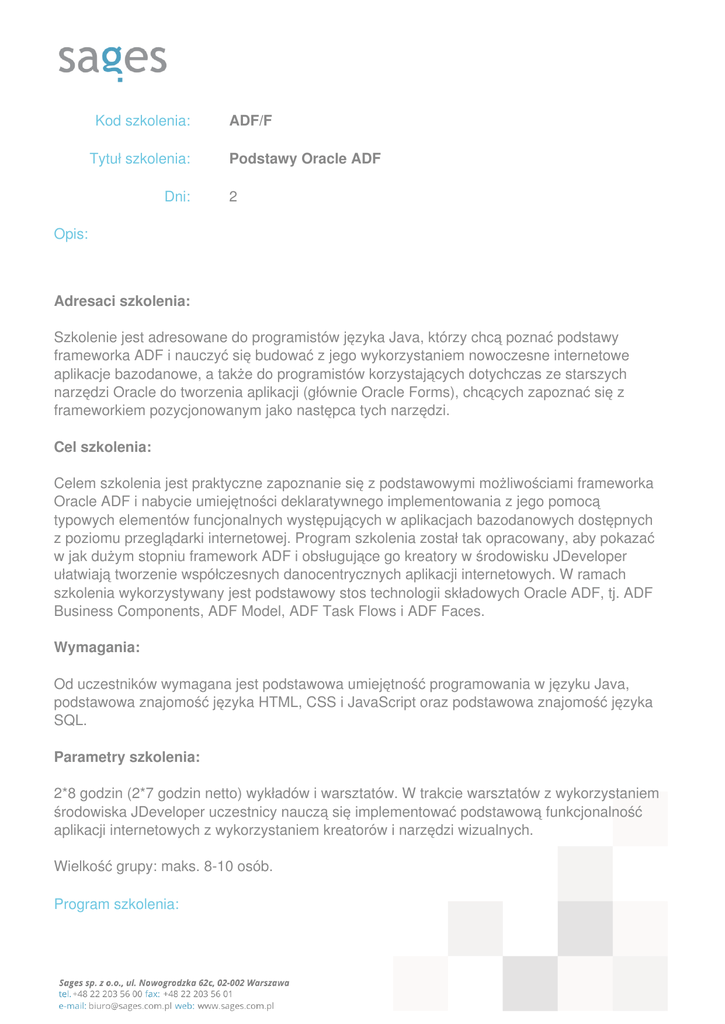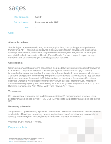 Kod szkolenia: Tytuł szkolenia: Dni: ADF/F Podstawy Oracle ADF 2 Opis: Adresaci szkolenia: Szkolenie jest adresowane do programistów języka Java, którzy chcą poznać podstawy frameworka ADF i nauczyć się budować z jego wykorzystaniem nowoczesne internetowe aplikacje bazodanowe, a także do programistów korzystających dotychczas ze starszych narzędzi Oracle do tworzenia aplikacji (głównie Oracle Forms), chcących zapoznać się z frameworkiem pozycjonowanym jako następca tych narzędzi. Cel szkolenia: Celem szkolenia jest praktyczne zapoznanie się z podstawowymi możliwościami frameworka Oracle ADF i nabycie umiejętności deklaratywnego implementowania z jego pomocą typowych elementów funcjonalnych występujących w aplikacjach bazodanowych dostępnych z poziomu przeglądarki internetowej. Program szkolenia został tak opracowany, aby pokazać w jak dużym stopniu framework ADF i obsługujące go kreatory w środowisku JDeveloper ułatwiają tworzenie współczesnych danocentrycznych aplikacji internetowych. W ramach szkolenia wykorzystywany jest podstawowy stos technologii składowych Oracle ADF, tj. ADF Business Components, ADF Model, ADF Task Flows i ADF Faces. Wymagania: Od uczestników wymagana jest podstawowa umiejętność programowania w języku Java, podstawowa znajomość języka HTML, CSS i JavaScript oraz podstawowa znajomość języka SQL. Parametry szkolenia: 2*8 godzin (2*7 godzin netto) wykładów i warsztatów. W trakcie warsztatów z wykorzystaniem środowiska JDeveloper uczestnicy nauczą się implementować podstawową funkcjonalność aplikacji internetowych z wykorzystaniem kreatorów i narzędzi wizualnych. Wielkość grupy: maks. 8-10 osób. Program szkolenia: 1. ADF – Wprowadzenie do Oracle ADF a. architektura b. warstwy aplikacji c. technologie składowe 2. ADF Business Components – logika biznesowa, komunikacja z bazą danych a. obiekty encji (ang. Entity Objects), asocjacje między encjami b. obiekty perspektywy/widoku (ang. View Objects), linki między widokami c. moduły aplikacji (ang. Application Modules) d. testowanie warstwy usług biznesowych w środowisku JDeveloper 3. ADF Model – deklaratywne wiązanie usług biznesowych z komponentami interfejsu użytkownika a. koncepcja kontrolek danych (ang. data controls) b. wiązania (ang. bindings) c. przegląd XML-owych plików konfiguracyjnych Oracle ADF 4. ADF Faces – interfejs użytkownika w aplikacjach internetowych a. przegląd komponentów b. formularzowa i tabelaryczna prezentacja danych c. aranżacja układu graficznego strony d. fragmenty i wzorce stron 5. Rozwiązania typowych problemów przy tworzeniu stron aplikacji ADF a. walidacja i formatowanie pól b. atrybuty wyliczeniowe c. listy wartości d. formularze do wyszukiwania danych 6. ADF Task Flows – nawigacja, sterowanie a. unbounded task flows b. bounded task flows c. wykorzystanie przepływów jako regionów na stronach aplikacji Powered by TCPDF (www.tcpdf.org)