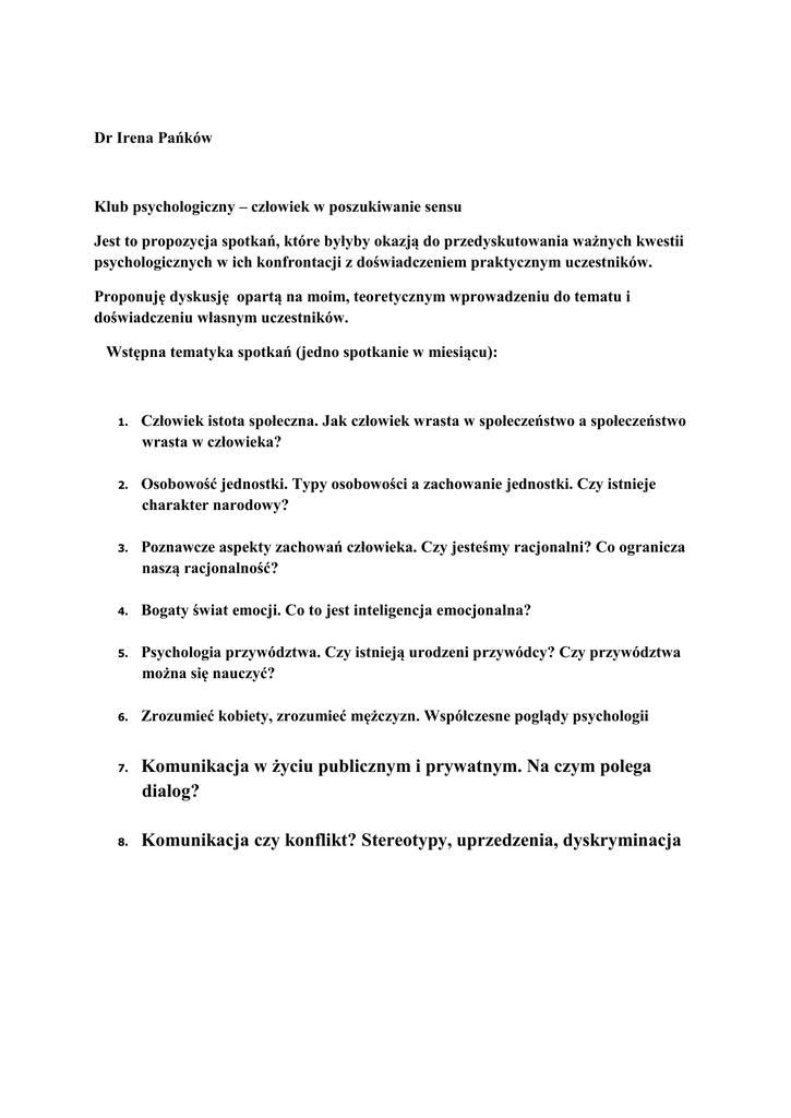 Dr Irena Pańków Klub psychologiczny – człowiek w poszukiwanie sensu Jest to propozycja spotkań, które byłyby okazją do przedyskutowania ważnych kwestii psychologicznych w ich konfrontacji z doświadczeniem praktycznym uczestników. Proponuję dyskusję opartą na moim, teoretycznym wprowadzeniu do tematu i doświadczeniu własnym uczestników. Wstępna tematyka spotkań (jedno spotkanie w miesiącu): 1. Człowiek istota społeczna. Jak człowiek wrasta w społeczeństwo a społeczeństwo wrasta w człowieka? 2. Osobowość jednostki. Typy osobowości a zachowanie jednostki. Czy istnieje charakter narodowy? 3. Poznawcze aspekty zachowań człowieka. Czy jesteśmy racjonalni? Co ogranicza naszą racjonalność? 4. Bogaty świat emocji. Co to jest inteligencja emocjonalna? 5. Psychologia przywództwa. Czy istnieją urodzeni przywódcy? Czy przywództwa można się nauczyć? 6. Zrozumieć kobiety, zrozumieć mężczyzn. Współczesne poglądy psychologii 7. 8. Komunikacja w życiu publicznym i prywatnym. Na czym polega dialog? Komunikacja czy konflikt? Stereotypy, uprzedzenia, dyskryminacja
