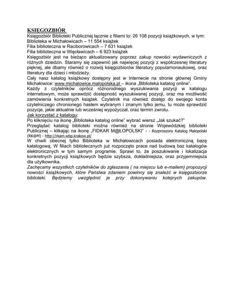 KSIĘGOZBIÓR Księgozbiór Biblioteki Publicznej łącznie z filiami to: 26 108 pozycji książkowych, w tym: Biblioteka w Michałowicach – 11 554 książek Filia biblioteczna w Raciborowicach – 7 631 książek Filia biblioteczna w Więcławicach – 6 923 książek Księgozbiór jest na bieżąco aktualizowany poprzez zakup nowości wydawniczych z różnych dziedzin. Staramy się zapewnić jak najwięcej pozycji z współczesnej literatury pięknej, ale dbamy również o rozwój księgozbiorów literatury popularnonaukowej, oraz literatury dla dzieci i młodzieży. Cały nasz katalog książkowy dostępny jest w Internecie na stronie głównej Gminy Michałowice: www.michalowice.malopolska.pl – ikona „Biblioteka katalog online”. Każdy z czytelników oprócz różnorodnego wyszukiwania pozycji w katalogu internetowym, może sprawdzić dostępność wyszukiwanej pozycji, oraz ma możliwość zamówienia konkretnych książek. Czytelnik ma również dostęp do swojego konta czytelniczego chronionego hasłem wybranym i znanym tylko jemu, tu może sprawdzić pozycje, jakie aktualnie lub wcześniej wypożyczał, oraz termin zwrotu. Jak korzystać z katalogu: Po kliknięciu na ikonę „Biblioteka katalog online” wybrać wiersz „Jak szukać?” Przeglądać katalog biblioteki można również na stronie Wojewódzkiej biblioteki Publicznej – klikając na ikonę „FIDKAR M@ŁOPOLSKI” - - Rozproszony Katalog Małopolski (RK@M) - http://rkam.wbp.krakow.pl/ W chwili obecnej tylko Biblioteka w Michałowicach posiada elektroniczną bazę katalogową. W filiach bibliotecznych już rozpoczęto prace nad budową baz katalogów elektronicznych w tym samym programie. Sprawi to, że poszukiwanie i lokalizacja konkretnych pozycji książkowych będzie szybsza, dokładniejsza, oraz przyjemniejsza dla użytkownika. Zachęcamy wszystkich czytelników do zgłaszania ( na miejscu lub e-mailem) propozycji nowości książkowych, które Państwa zdaniem powinny się znaleźć w księgozbiorze biblioteki. Będziemy uwzględnić je przy dokonywaniu kolejnych zakupów.