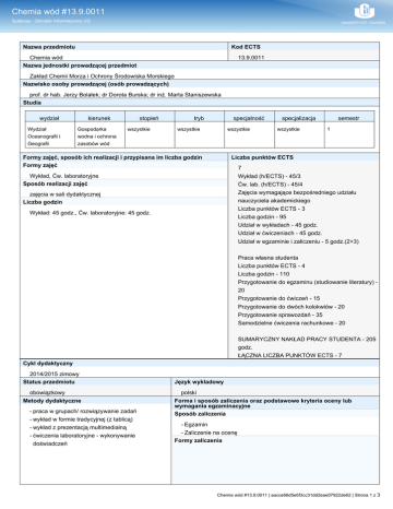 Chemia wód #13.9.0011 Sylabusy - Ośrodek Informatyczny UG Nazwa przedmiotu Kod ECTS Chemia wód Nazwa jednostki prowadzącej przedmiot 13.9.0011 Zakład Chemii Morza i Ochrony Środowiska Morskiego Nazwisko osoby prowadzącej (osób prowadzących) prof. dr hab. Jerzy Bolałek; dr Dorota Burska; dr inż. Marta Staniszewska Studia wydział Wydział Oceanografii i Geografii kierunek Gospodarka wodna i ochrona zasobów wód stopień wszystkie tryb specjalność wszystkie wszystkie Formy zajęć, sposób ich realizacji i przypisana im liczba godzin Formy zajęć specjalizacja wszystkie semestr 1 Liczba punktów ECTS 7 Wykład (h/ECTS) - 45/3 Ćw. lab. (h/ECTS) - 45/4 Zajęcia wymagające bezpośredniego udziału nauczyciela akademickiego Liczba punktów ECTS - 3 Liczba godzin - 95 Udział w wykładach - 45 godz. Udział w ćwiczeniach - 45 godz. Udział w egzaminie i zaliczeniu - 5 godz.(2+3) Wykład, Ćw. laboratoryjne Sposób realizacji zajęć zajęcia w sali dydaktycznej Liczba godzin Wykład: 45 godz., Ćw. laboratoryjne: 45 godz. Praca własna studenta Liczba punktów ECTS - 4 Liczba godzin - 110 Przygotowanie do egzaminu (studiowanie literatury) 20 Przygotowanie do ćwiczeń - 15 Przygotowanie do dwóch kolokwiów - 20 Przygotowanie sprawozdań - 35 Samodzielne ćwiczenia rachunkowe - 20 SUMARYCZNY NAKŁAD PRACY STUDENTA - 205 godz. ŁĄCZNA LICZBA PUNKTÓW ECTS - 7 Cykl dydaktyczny 2014/2015 zimowy Status przedmiotu obowiązkowy Metody dydaktyczne - praca w grupach/ rozwiązywanie zadań - wykład w formie tradycyjnej (z tablicą) - wykład z prezentacją multimedialną - ćwiczenia laboratoryjne - wykonywanie doświadczeń Język wykładowy polski Forma i sposób zaliczenia oraz podstawowe kryteria oceny lub wymagania egzaminacyjne Sposób zaliczenia - Egzamin - Zaliczenie na ocenę Formy zaliczenia Chemia wód #13.9.0011 | aacce66d5e6f3cc31dd2eae07922de62 | Strona 1 z 3 Chemia wód #13.9.0011 Sylabusy - Ośrodek Informatyczny UG - egzamin pisemny z pytaniami (zadaniami) otwartymi - egzamin pisemny: z zadaniami zamkniętymi - dwa kolokwia - wykonanie praktycznej części ćwiczenia i prezentacja uzyskanych wyników w formie pisemnego sprawozdania - kolokwium - egzamin ustny Podstawowe kryteria oceny Wykład: student po potwierdzeniu realizacji efektów kształcenia uzyskuje ocenę w zależności od uzyskanej punktacji (51-60% dst.; 61-70% dst. plus; 71-80% dobry; 81-90% dobry plus; 91-100% bardzo dobry). Określenie przedmiotów wprowadzających wraz z wymogami wstępnymi A. Wymagania formalne brak B. Wymagania wstępne brak Cele kształcenia Przekazanie podstawowych pojęć i terminów z zakresu hydrochemii. Przekazanie umiejętności klasyfikacji wód w oparciu o chemiczne wskaźniki jakości wody. Przedstawienie zasad bezpieczeństwa pracy oraz podstawowych umiejętności praktycznych pracy w laboratorium analiz próbek wody. Zaprezentowanie podstawowych technik (wagowych, miareczkowych, potencjometrycznych, spektrofotometrycznych) i narzędzi badawczych stosowanych w hydrochemii. Wdrożenie zasad poprawności przeliczeń chemicznych oraz zasad otrzymywania i zapisu wyniku pomiarów. Treści programowe A. Problematyka wykładu A.1. Jednostki miar używane w hydrochemii, analiza jednostek, precyzja, dokładność, cyfry znaczące i pewne; A.2. Współczesny model budowy atomu i prawidłowości rejestrowane w układzie okresowym; A.3. Współzależności między rodzajem wiązania chemicznego a właściwościami substancji; A4. Właściwości mieszanin oraz wyrażanie stężeń roztworów; A.5. Równowagi w roztworach elektrolitów (właściwości kwasów, zasad i roztworów elektrolitów; omówienie i interpreta-cja skali pH); A.6. Wodór i tlen oraz woda - jej budowa i wlasności fizyczne; A.7. Metody pobierania i badań składu chemicznego próbek wody, programy pobierania; A.8. Własności fizyczne i chemiczne wód - wskaźniki fizyczne i chemiczne jakości wody, bilans jonowy; A.9. Sposoby przedstawiania skladu chemicznego wód oraz klasyfikacje hydrochemiczne wód; A.10. Substancje nieorganiczne i organiczne w wodach naturalnych i ich przemiany. A.11. Skład chemiczny wody morskiej – zasolenie – właściwości decydujące o procesach fizycznych, biologicznych i chemicznych. A.12. Migracje pierwiastków i związków chemicznych, podział pierwiastków w wodzie morskiej, równowagi jonowe; A.13. Cykle biogeochemiczne tlenu, węgla, azotu, fosforu, krzemu oraz wybranych metali, np. Fe, Hg (formy występowania i procesy zachodzące w atmosferze, biosferze, wodzie morskiej i osadach; wpływ warunków tlenowych na przebieg cykli; zmiany w obiegu pierwiastków wywołane działalnością człowieka); A.14. Materia organiczna – skład chemiczny, powstawanie, utlenianie – znaczenie procesów asymilacji i destrukcji w cyklach sezonowych i dobowych; A.15. Równowaga węglanowa, zasadowość wody morskiej, pH wody morskiej. B. Problematyka ćwiczeń B.1. Podstawowe wyposażenie oraz bezpieczeństwo pracy w laboratorium; B.2. Podstawowe zasady poprawnego uzyskania i zapisu wyniku; B.3. Obliczenia chemiczne: przeliczanie stężeń i jednostek; B.4. Właściwości fizyczne i chemiczne wód naturalnych oraz podstawy metod oznaczania gęstości, temperatury, chlorności i zasolenia, pH, alkaliczności, potencjału redoks, BZT, ChZT; B.5. Rozpuszczalność gazów w wodzie morskiej; metoda oznaczania stężenia tlenu rozpuszczonego w wodzie morskiej; B.6. Podstawy metod spektrofotometrycznych, kalibracja; wykorzystanie metod spektrofotometrycznych w oznaczaniu stężenia soli odżywczych (fosforany); B.7. Wprowadzenie do metod grawimetrycznych stosowanych w analizie próbek zawiesiny i osadów morskich (koncentracja zawiesiny, wilgotność i strata przy prażeniu w osadach); metody przygotowania próbek do analizy; B.8. Problematyka wód przejściowych – różnice w składzie chemicznym i właściwościach wód słodkich i słonych. Wykaz literatury A. Literatura wymagana do ostateczn