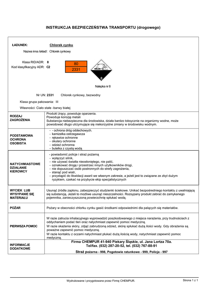 INSTRUKCJA BEZPIECZEŃSTWA TRANSPORTU (drogowego) ŁADUNEK: Chlorek cynku Nazwa inna /skład/: Chlorek cynkowy Klasa RID/ADR: 8 80 Kod klasyfikacyjny ADR: C2 2331 Nalepka nr 8 Nr UN: 2331 Chlorek cynkowy, bezwodny Klasa grupa pakowania: III Własności: Ciało stałe -barwy białej RODZAJ ZAGROŻENIA PODSTAWOWA OCHRONA OSOBISTA NATYCHMIASTOWE DZIAŁANIE KIEROWCY Produkt żrący, powoduje oparzenia. Powoduje korozję metali Substancja niebezpieczna dla środowiska, działa bardzo toksycznie na organizmy wodne, może powodować długo utrzymujące się niekorzystne zmiany w środowisku wodnym. - - ochrona dróg oddechowych. kamizelka ostrzegawcza rękawice ochronne okulary ochronne odzież ochronna - butelka z czystą wodą - powiadomić policje i straż pożarną - wyłączyć silnik, - nie używać światła nieosłoniętego, nie palić, - oznakować drogę i przestrzec innych użytkowników drogi, - nie dopuszczać osób postronnych do strefy zagrożenia, - stanąć pod wiatr, - przystąpić do likwidacji awarii we własnym zakresie, a jeżeli jest to związane ze zbyt dużym ryzykiem, czekać na przybycie ekip specjalistycznych WYCIEK LUB WYSYPANIE SIĘ MATERIAŁU Usunąć źródła zapłonu, zabezpieczyć studzienki ściekowe. Unikać bezpośredniego kontaktu z uwalniającą się substancją. Jeżeli to możliwe usunąć nieszczelności. Rozsypany produkt zebrać do zamykanego pojemnika, zanieczyszczoną powierzchnię spłukać wodą. POŻAR Pożary w obecności chlorku cynku gasić środkami odpowiednimi dla palących się materiałów. PIERWSZA POMOC INFORMACJE DODATKOWE W razie zatrucia inhalacyjnego wyprowadzić poszkodowanego z miejsca narażenia, przy trudnościach z oddychaniem podać tlen oraz natychmiast zapewnić pomoc medyczną. W razie skażenia skóry, zdjąć zabrudzoną odzież, skórę spłukać dużą ilości wody. Gdy obrażenia są poważne zapewnić pomoc medyczną. W razie kontaktu z oczami natychmiast płukać dużą ilością wody, natychmiast zapewnić pomoc medyczną. Firma CHEMPUR 41-940 Piekary Śląskie, ul. Jana Lortza 70a. Tel/fax. (032) 287-20-52, tel. (032) 767-88-91 Straż pożarna - 998, Pogotowie ratunkowe - 999, Policja - 997 Wydrukowane i przygotowane przez Firmę CHEMPUR. Strona 1 z 1