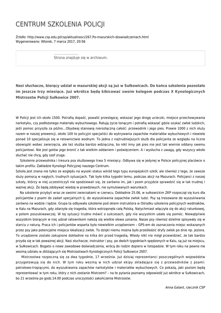 CENTRUM SZKOLENIA POLICJI Źródło: http://www.csp.edu.pl/csp/aktualnosci/267,Po-mazurskich-doswiadczeniach.html Wygenerowano: Wtorek, 7 marca 2017, 20:56 Strona znajduje się w archiwum. Nasi słuchacze, biorący udział w mazurskiej akcji są już w Sułkowicach. Do końca szkolenia pozostało im jeszcze trzy miesiące. Już wkrótce będą kibicować swoim kolegom podczas X Kynologicznych Mistrzostw Policji Sułkowice 2007. W Policji jest ich około 1500. Potrafią dopaść, powalić przestępcę, wskazać jego drogę ucieczki, miejsce przechowywania narkotyku, czy podłożonego materiału wybuchowego. Ratują życie tonącym i potrafią wskazać gdzie szukać zwłok ludzkich, jeśli pomoc przyszła za późno…Obydwaj stanowią nierozłączną całość: przewodnik i jego pies. Prawie 1000 z nich służy razem w naszej prewencji, około 100 to policyjni specjaliści do wykrywania zapachów materiałów wybuchowych i niewiele ponad 10 specjalizuje się w ratownictwie wodnym. To jedna z najtrudniejszych służb dla policjanta ze względu na liczne obowiązki wobec zwierzęcia, ale też służba bardzo wdzięczna, bo nikt inny jak pies nie jest tak wiernie oddany swemu policjantowi. Nie jest gotów jego bronić z tak wielkim oddaniem i poświęceniem. A i wysłucha z uwagą, gdy wszyscy wkoło słuchać nie chcą, gdy szef zruga. Szkolenie przewodnika i tresura psa służbowego trwa 5 miesięcy. Odbywa się w jedynej w Polsce policyjnej placówce o takim profilu: Zakładzie Kynologii Policyjnej naszego Centrum. Szkoła jest znana nie tylko ze względu na wysoki status wśród tego typu europejskich szkół, ale również z tego, że zawsze służy pomocą w nagłych, trudnych sytuacjach. Tak było kilka tygodni temu, podczas akcji na Mazurach. Policjanci z naszej szkoły, którzy w niej uczestniczyli nie spodziewali się, że zarówno im, jak i psom przyjdzie sprawdzić się w tak trudnej i ważnej akcji. Że będą zdobywać wiedzę w prawdziwych, nie symulowanych warunkach. Na szkolenie przybyli wraz ze swoimi zwierzakami w czerwcu. Dokładnie 25.06, w sułkowickim ZKP rozpoczął się kurs dla policjantów z psami do zadań specjalnych tj. do wyszukiwania zapachów zwłok ludzi. Psy są tresowane do wyszukiwania zarówno na wodzie i lądzie. Grupa ta odbywała szkolenie pod okiem instruktora w Ośrodku szkolenia policyjnych wodniaków, w Kalu na Mazurach, gdy zdarzyła się tragedia, która wstrząsnęła całą Polską. Natychmiast włączyła się do akcji ratunkowej, a potem poszukiwawczej. W tej sytuacji trudno mówić o sukcesach, gdy nie wszystkim udało się pomóc. Niewątpliwie wszystkim biorącym w niej udział ratownikom należą się wielkie słowa uznania. Nasze psy również dzielnie spisywały się w starciu z naturą. Praca ich i policjantów wsparta była niewielkim urządzeniem – GPS-em do zaznaczania miejsc wskazanych przez psy jako potencjalne miejsca lokalizacji zwłok. To dzięki niemu można było prześledzić dryfy zwłok po dnie np. jeziora. To urządzenie zostało zakupione dokładnie na kilka dni przed tragedią. Wtedy nikt nie mógł przewidzieć, że tak bardzo przyda się w tak poważnej akcji. Nasi słuchacze, instruktor i psy, po dwóch tygodniach spędzonych w Kalu, są już na miejscu, w Sułkowicach. Bogatsi o nowe zawodowe doświadczenia, wrócą do rodzin dopiero w listopadzie. W tym roku na pewno nie wezmą udziału w zbliżających się Mistrzostwach Kynologicznych Policji Sułkowice 2007. Mistrzostwa rozpoczną się za dwa tygodnie, 17 września. Już dzisiaj reprezentanci poszczególnych województw przygotowują się do nich. W tym roku wezmą w nich udział ekipy składające się z przewodników z psami: patrolowo-tropiącymi, do wyszukiwania zapachów narkotyków i materiałów wybuchowych. Co pokażą, jaki poziom będą reprezentować w tym roku, który z nich zostanie Mistrzem? – na te pytania poznamy odpowiedź już wkrótce w Sułkowicach, bo 21 września po godz.14.00 podczas uroczystości zakończenia Mistrzostw. Anna Galant, rzecznik CSP Ocena: 0/5 (0) Tweetnij
