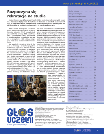 www. glos.umk.pl W numerze Rozpoczyna się rekrutacja na studia System Internetowej Rejestracji Kandydatów zostanie uruchomiony 23 kwietnia. Maturzyści będą mieć do wyboru 82 kierunki na studiach stacjonarnych i 37 na niestacjonarnych. Absolwentom studiów licencjackich zaoferuje się zaś 47 kierunków na studiach stacjonarnych i 31 na niestacjonarnych. się także nowe kierunki. Komparatystyka literacko-kulturowa to kierunek studiów I stopnia na Wydziale Filologicznym. Dotyczy badań nad relacjami międzyliterackimi i międzykulturowymi, stosunkiem literatury do innych dziedzin kultury, zagadnieniami zróżnicowania kultur, wymiany międzykulturowej i ich odzwierciedleniem w twórczości literackiej. Program studiów obejmuje m.in. historię, teorię i metodologię badań porównawczych, literaturę i kulturę wybranych obszarów oraz intensywną naukę języków obcych. Dwa nowe kierunki zaproponuje Wydział Nauk o Ziemi. Studia miejskie to oferta studiów I stopnia. Będą się one koncentrować wokół zagadnień rozwoju miast i zachodzących w nich procesów społecznych, gospodarczych i kulturowych. Studia te łączą wiedzę m.in. z zakresu geografii społeczno-gospodarczej, socjologii i planowania przestrzennego. Z kolei geoinformacja środowiskowa to nowe studia II stopnia, związane z gromadzeniem, analizą i interpretacją danych geoprzestrzennych i środowiskowych, zwłaszcza przy wykorzystaniu nowoczesnych technologii informatycznych – są więc ofertą skierowaną do osób interesujących się zarówno geografią, jak i informatyką. Swoją ofertę studiów II stopnia rozszerza także Wydział Politologii i Studiów Międzynarodowych, oferując studia z bezpieczeństwa wewnętrznego, prowadzone dotąd na poziomie licencjackim. Fot. Andrzej Romański (czy) Przed rokiem największe zainteresowanie maturzystów wzbudzały studia na kierunku lekarskim (3747 kandydatów), prawie (1585), farmacji (922) oraz finansach i rachunkowości (848). Na studiach II stopnia najwięcej kandydatów zapisało się na zarządzanie (426 osób), pedagogikę (406) oraz finanse i rachunkowość (416). Bez wątpienia najtrudniej było się dostać na farmację – by zostać przyjętym, trzeba było uzyskać na maturze z biologii i chemii (oba przedmioty na poziomie rozszerzonym) co najmniej 146 punktów. Na kierunku lekarskim próg wyniósł 83 punkty (na farmacji 1 punkt na maturze to 1 punkt w rekrutacji, na pozostałych kierunkach punkty ze świadectwa maturalnego dzieli się w odpowiednim procencie, stąd taka różnica), a na prawie 81,4. Wysokie wymagania musieli spełnić kandydaci na japonistykę (75,7 pkt.) czy lingwistykę stosowaną – język włoski z językiem hiszpańskim (70,7 pkt.) W ofercie Uniwersytetu Mikołaja Kopernika na nowy rok akademicki znajdą Zespół redakcyjny: Winicjusz Schulz (redaktor naczelny), Wojciech Streich (zastępca redaktora naczelnego), Marcin Czyżniewski, Andrzej Romański, Anna Supruniuk, Zofia Chyła-Bełkot (korektor). Stale współpracują: Alina Dauksza-Wiśniewska, Marian Filar, Sławomir Jaskólski, Piotr Kurek, Stefan Melkowski, Edward Saliński. Adres redakcji: 87-100 Toruń, ul. Gagarina 39, pok. 4 i 5, tel. 56 611 42 89, tel./fax 56 611 42 16 e-mail: [email protected] Opracowanie graficzne okładki: Edward Saliński Opracowanie graficzne: Łukasz Aleksandrowicz, Adam Dobosz Kronika rektorska . . . . . . . . . . . . . . . . . 4 Zmiany w Grudziądzu . . . . . . . . . . . . . 4 Nagrody Nobla na Festiwalu . . . . . . . . 5 Przeczytane w mózgu . . . . . . . . . . . . . 6 Wspólnie o prawie wyborczym . . . . . . . 8 Nominacje profesorskie . . . . . . . . . . . . 9 Z posiedzenia Senatu . . . . . . . . . . . . . . 10 Naukowcy przy moście . . . . . . . . . . . . 11 Najtrafniejsze szaty . . . . . . . . . . . . . . . 11 START dla młodych . . . . . . . . . . . . . . . 11 Konferencje naukowe . . . . . . . . . . . . . 12 Medal dla matematyka . . . . . . . . . . . . 12 Żałobna karta . . . . . . . . . . . . . . . . . . . 12 UMK i PZU . . . . . . . . . . . . . . . . . . . . . 12 Przez całe życie... . . . . . . . . . . . . . . . . . 13 Wojownik i czarodziej słowa . . . . . . . . 14 Zapraszamy na łamy . . . . . . . . . . . . . . 15 Badania do wykorzystania . . . . . . . . . . 16 Dary, dary, dary… . . . . . . . . . . . . . . . . 17 Geoponika . . . . . . . . . . . . . . . . . . . . . 18 Trzydzieści „sytych” lat Mirosława Pawłowskiego . . . . . . . . . . 19 Wiosna, ach to ty! . . . . . . . . . . . . . . . . 20 Kopernik a Kościół (2) . . . . . . . . . . . . . 21 Piękny koniec . . . . . . . . . . . . . . . . . . . 23 Witaminy na wiosnę . . . . . . . . . . . . . . 25 To nie tak... . . . . . . . . . . . . . . . . . . . . . 25 XYZ bibliometrii . . . . . . . . . . . . . . . . . . 26 Pięć godzin brydżowych licytacji . . . . . . 27 Druga liga basketu coraz bliżej . . . . . . . 27 Ciało jako rusztowanie . . . . . . . . . . . . . 28 Od Nowa zaprasza . . . . . . . . . . . . . . . 28 Puszka Kopernika . . . . . . . . . . . . . . . . 29 Pstryczek-elektryczek . . . . . . . . . . . . . . 29 Skład: Dariusz Żulewski Druk: Wydawnictwo Naukowe UMK, ul. Gagarina 5, 87-100 Toruń, tel. 56 611-42-95, e-mail: [email protected] © Wszelkie prawa zastrzeżone Redakcja nie zwraca materiałów niezamówionych, a także zastrzega sobie prawo do skracania i opracowywania artykułów oraz ich tytułów. Redakcja nie odpowiada za treść ogłoszeń i reklam. Ogłoszenia wymiarowe – 1,5 zł za cm2 Dla osób związanych z UMK – 50% zniżki. Serwis fotograficzny: http://glos.umk.pl/serwis_ fotograficzny.html 3 Aktualności rozmowa rozmaitości kultura nauka wspomnienia felieton Kronika rektorska 5.03. Prorektor J. Styczyński wziął udział w XX Forum Gospodarczym w Toruniu. 6.03. Prorektor J. Styczyński przewodniczył posiedzeniu Rady Społecznej Szpitala Uniwersyteckiego nr 2 im. dra J. Biziela w Bydgoszczy. 7–8.03. Prorektor J. Styczyński wziął ud