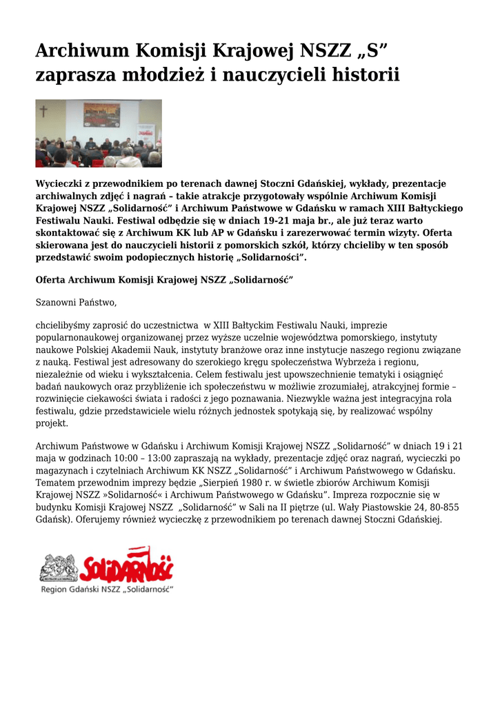 Archiwum Komisji Krajowej NSZZ „S” zaprasza młodzież i nauczycieli historii Wycieczki z przewodnikiem po terenach dawnej Stoczni Gdańskiej, wykłady, prezentacje archiwalnych zdjęć i nagrań – takie atrakcje przygotowały wspólnie Archiwum Komisji Krajowej NSZZ „Solidarność” i Archiwum Państwowe w Gdańsku w ramach XIII Bałtyckiego Festiwalu Nauki. Festiwal odbędzie się w dniach 19-21 maja br., ale już teraz warto skontaktować się z Archiwum KK lub AP w Gdańsku i zarezerwować termin wizyty. Oferta skierowana jest do nauczycieli historii z pomorskich szkół, którzy chcieliby w ten sposób przedstawić swoim podopiecznych historię „Solidarności”. Oferta Archiwum Komisji Krajowej NSZZ „Solidarność” Szanowni Państwo, chcielibyśmy zaprosić do uczestnictwa w XIII Bałtyckim Festiwalu Nauki, imprezie popularnonaukowej organizowanej przez wyższe uczelnie województwa pomorskiego, instytuty naukowe Polskiej Akademii Nauk, instytuty branżowe oraz inne instytucje naszego regionu związane z nauką. Festiwal jest adresowany do szerokiego kręgu społeczeństwa Wybrzeża i regionu, niezależnie od wieku i wykształcenia. Celem festiwalu jest upowszechnienie tematyki i osiągnięć badań naukowych oraz przybliżenie ich społeczeństwu w możliwie zrozumiałej, atrakcyjnej formie – rozwinięcie ciekawości świata i radości z jego poznawania. Niezwykle ważna jest integracyjna rola festiwalu, gdzie przedstawiciele wielu różnych jednostek spotykają się, by realizować wspólny projekt. Archiwum Państwowe w Gdańsku i Archiwum Komisji Krajowej NSZZ „Solidarność” w dniach 19 i 21 maja w godzinach 10:00 – 13:00 zapraszają na wykłady, prezentacje zdjęć oraz nagrań, wycieczki po magazynach i czytelniach Archiwum KK NSZZ „Solidarność” i Archiwum Państwowego w Gdańsku. Tematem przewodnim imprezy będzie „Sierpień 1980 r. w świetle zbiorów Archiwum Komisji Krajowej NSZZ »Solidarność« i Archiwum Państwowego w Gdańsku”. Impreza rozpocznie się w budynku Komisji Krajowej NSZZ „Solidarność” w Sali na II piętrze (ul. Wały Piastowskie 24, 80-855 Gdańsk). Oferujemy również wycieczkę z przewodnikiem po terenach dawnej Stoczni Gdańskiej.