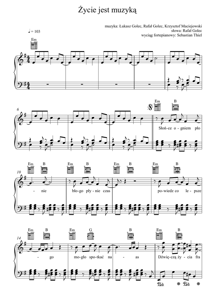 śycie jest muzyką muzyka: Łukasz Golec, Rafał Golec, Krzysztof Maciejowski słowa: Rafał Golec wyciąg fortepianowy: Sebastian Thiel q = 103 E‹ E‹ 6 E‹ B - B E‹ 10 nie B Słoń - ce o - gniem pło B E‹ B E‹ bło - go pły - nie czas po - wiedz co le - psze B E‹ 14 E‹ - go B G mo- gło spo - tkać na E‹ - as B Dźwię - czą Ŝy - cia fra 2 E‹ B E‹ E‹ zy simile 22 - źró - dła bi - je moc B sność E‹ 18 - B E‹ G E‹ B nie o - śle - pia ja - B nie przy - gnia - ta B no - oc Choć de - mo - ny cza - sem D 26 bu - dzą się nie - po - ko - ją ser - ca my - śli złe z kaŜ - dą chwi - lą wciąŜ przy E‹ 30 dło - ni dłoń je -nad po - dróŜ je - dna Ŝy - cia toń śy - cie jest mu zy - ką D G Ŝy -cie jest wy gra - ną E‹ pó - ki na - sze ser - ca ko - chać nie prze sta - ną B 3 34 B E‹ E‹ B D. S. to coda 37 Coda 39 E‹ E‹ 7fr E‹ 42 G 45 B D E‹
