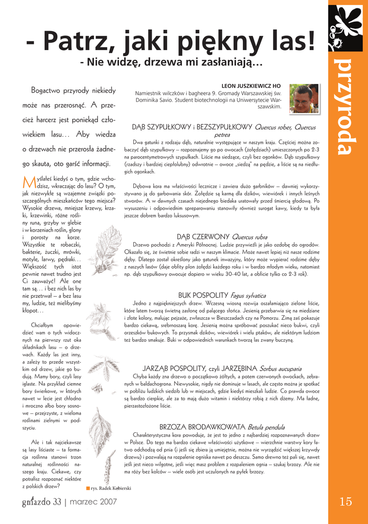 - Patrz, jaki piękny las! LEON JUSZKIEWICZ HO Namiestnik wilczków i bagheera 9. Gromady Warszawskiej św. Dominika Savio. Student biotechnologii na Uniwersytecie Warszawskim. Bogactwo przyrody niekiedy może nas przerosnąć. A przecież harcerz jest poniekąd człowiekiem lasu… Aby wiedza o drzewach nie przerosła żadnego skauta, oto garść informacji. yślałeś kiedyś o tym, gdzie wchoM dzisz, wkraczając do lasu? O tym, jak niezwykłe są wzajemne związki poszczególnych mieszkańców tego miejsca? Wysokie drzewa, mniejsze krzewy, krzaki, krzewinki, różne rośliny runa, grzyby w glebie i w korzeniach roślin, glony i porosty na korze. Wszystkie te robaczki, bakterie, żuczki, mrówki, motyle, larwy, pędraki… Większość tych istot pewnie nawet trudno jest Ci zauważyć! Ale one tam są… i bez nich las by nie przetrwał – a bez lasu my, ludzie, też mielibyśmy kłopot… Chciałbym opowiedzieć wam o tych widocznych na pierwszy rzut oka składnikach lasu – o drzewach. Każdy las jest inny, a zależy to przede wszystkim od drzew, jakie go budują. Mamy bory, czyli lasy iglaste. Na przykład ciemne bory świerkowe, w których nawet w lecie jest chłodno i mroczno albo bory sosnowe – przejrzyste, z wieloma roślinami zielnymi w podszyciu. Ale i tak najciekawsze są lasy liściaste – ta formacja roślinna stanowi trzon naturalnej roślinności naszego kraju. Ciekawe, czy potrafisz rozpoznać niektóre z polskich drzew? gniazdo 33 DĄB SZYPUŁKOWY i BEZSZYPUŁKOWY Quercus rober, Quercus petrea Dwa gatunki z rodzaju dąb, naturalnie występujące w naszym kraju. Częściej można zobaczyć dąb szypułkowy – rozpoznajemy go po owocach (żołędziach) umieszczonych po 2-3 na parocentymetrowych szypułkach. Liście ma siedzące, czyli bez ogonków. Dąb szypułkowy (rzadszy i bardziej ciepłolubny) odwrotnie – owoce „siedzą” na pędzie, a liście są na niedługich ogonkach. przyroda - Nie widzę, drzewa mi zasłaniają… Dębowa kora ma właściwości lecznicze i zawiera dużo garbników – dawniej wykorzystywano ją do garbowania skór. Żołędzie są karmą dla dzików, wiewiórek i innych leśnych stworów. A w dawnych czasach niejednego biedaka uratowały przed śmiercią głodową. Po wysuszeniu i odpowiednim spreparowaniu stanowiły również surogat kawy, kiedy ta była jeszcze dobrem bardzo luksusowym. DĄB CZERWONY Quercus rubra Drzewo pochodzi z Ameryki Północnej. Ludzie przywieźli je jako ozdobę do ogrodów. Okazało się, że świetnie sobie radzi w naszym klimacie. Może nawet lepiej niż nasze rodzime dęby. Dlatego został określony jako gatunek inwazyjny, który może wypierać rodzime dęby z naszych lasów (daje obfity plon żołędzi każdego roku i w bardzo młodym wieku, natomiast np. dąb szypułkowy owocuje dopiero w wieku 30-40 lat, a obficie tylko co 2-3 rok). BUK POSPOLITY Fagus sylvatica Jedno z najpiękniejszych drzew. Wczesną wiosną rozwija oszałamiająco zielone liście, które latem tworzą świetną zasłonę od palącego słońca. Jesienią przebarwia się na miedziane i złote kolory, malując pejzaże, zwłaszcza w Bieszczadach czy na Pomorzu. Zimą zaś pokazuje bardzo ciekawą, srebrnoszarą korę. Jesienią można spróbować poszukać nieco bukwi, czyli orzeszków bukowych. To przysmak dzików, wiewiórek i wielu ptaków, ale niektórym ludziom też bardzo smakuje. Buki w odpowiednich warunkach tworzą las zwany buczyną. JARZĄB POSPOLITY, czyli JARZĘBINA Sorbus aucuparia Chyba każdy zna drzewo o początkowo żółtych, a potem czerwonych owockach, zebranych w baldachogrona. Niewysokie, nigdy nie dominuje w lasach, ale często można je spotkać w pobliżu ludzkich siedzib lub w miejscach, gdzie kiedyś mieszkali ludzie. Co prawda owoce są bardzo cierpkie, ale za to mają dużo witamin i niektórzy robią z nich dżemy. Ma ładne, pierzastozłożone liście. BRZOZA BRODAWKOWATA Betula pendula Charakterystyczna kora powoduje, że jest to jedno z najbardziej rozpoznawanych drzew w Polsce. Do tego ma bardzo ciekawe właściwości użytkowe – wierzchnie warstwy kory łatwo odchodzą od pnia (i jeśli się zbiera ją umiejętnie, można nie wyrządzić większej krzywdy drzewu) i pozwalają na rozpalenie ogniska nawet po deszczu. Samo drewno też pali się, nawet jeśli jest nieco wilgotne, jeśli więc masz problem z rozpaleniem ognia – szukaj brzozy. Ale nie ma róży bez kolców – wiele osób jest uczulonych na pyłek brzozy. rys. Radek Kobierski | marzec 2007 15