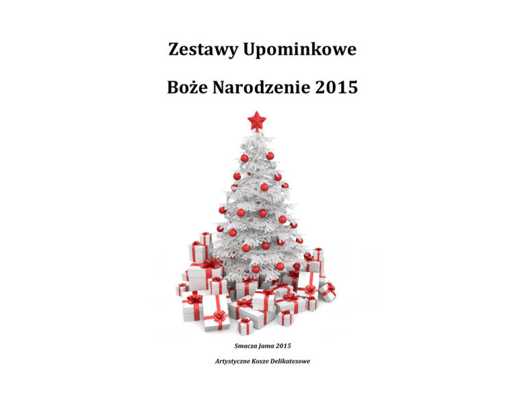 Zestawy Upominkowe Boże Narodzenie 2015 Smacza Jama 2015 Artystyczne Kosze Delikatesowe Szanowni Państwo, przedstawiamy najnowszą ofertę zestawów świątecznych, skomponowanych w oparciu o bogate doświadczenie naszej firmy w sprawianiu przyjemności Państwa pracownikom, kontrahentom i bliskim. Prezentowane kosze delikatesowe zawierają produkty najwyższej klasy w eleganckiej oprawie wysokojakościowej wikliny oraz artystycznego przybrania, bazującego na naturalnych ozdobach, takich jak orzechy, szyszki, suszone rośliny. Dzięki temu mają Państwo pewność, że atrakcyjna zawartość trafi do Odbiorcy w równie efektownej formie. Zestawy świąteczne które prezentujemy, są tylko próbką naszych możliwości- jesteśmy otwarci na sugestie modyfikacji i indywidualne wymogi Klienta dotyczące składu, kolorystyki, firmowego brandingu,jak również wysyłki. Korzystamy z usług sprawdzonych kurierów aby Państwa upominki dotarły bezpiecznie zarówno pojedynczo, jak i zbiorczo do ważnego kontrahenta, czy też wprost na firmowe spotkanie. Wychodząc naprzeciw potrzebom naszych Klientów realizujących zamówienia dla firm, wystawiamy faktury o treści wymaganej do zaksięgowania zakupu upominków. Przy zamówieniach hurtowych oferujemy korzystne rabaty (już od 10 zestawów). Zapraszamy do zapoznania się z aktualną ofertą oraz do współpracy z nami. Wszelkie zapytania i zamówienia prosimy kierować na adres [email protected] Z wyrazami szacunku, w imieniu zespołu sklepu Smacza Jama Maciej Merski Kosz Delikatesowy Perłowy Czar Kosz Delikatesowy Nefrytowe Wspomnienia Kompozycja w eleganckim koszu z jasnej wikliny została przystrojona polnymi suszonymi roślinami i wstążkami w kolorach głębokiego granatu i złota. Kosz zawiera jakościowe wino wytrawne, aromatyczną kawę, herbatę i zestaw najlepszych słodkości. Dokonały na wieczór i popołudnie. Wytworna kompozycja utrzymana w barwach nefrytowej zieleni, przepięknie zdobiona suszoną roślinnością i pasującymi wstążkami. Zawiera jakościowe wino hiszpańskie, które zachwyci niejednego konesera, w towarzystwie gatunkowej kawy i herbaty. Całość wraz z asortymentem słodyczy z najlepszych manufaktur tworzy zestaw obok którego nie sposób przejść obojętnie. Kosz w cenie 202,44 netto zawiera: Kosz w cenie 202,44 netto zawiera: Wino Stimson Cellars Merlot 0,75l Czekolada Lindt Creation Hazelnut de Luxe 150g Herbata liściasta Twinings Lady Grey 100g Konfitura cytrynowa z likierem miodowym Spiżarnia 200ml Kawa Davidoff Cafe Fine Aroma 250g Trufle Anthon Berg Sweet Moments Mleczna Czekolada 162g Wino Cuna de Reyes 0,75l Herbata czarna liściasta Yorkshire Tea 250g Kawa mielona Davidoff Cafe Rich Aroma 250g Delicje Marcepanowe Anthon Berg Grape in Muscat 275g Bombonierka Lindt Lindor Assorted Bag 100g Ciastka Tivoli Caramel Crunch & Pear 150g Migdały w mlecznej czekoladzie z kardamonem 100g Baklava - słodki deser kuchni bałkańskiej Ziarna Kawy w Czekoladzie 30g Świeca pachnąca 2szt. Kosz Delikatesowy Cydrowy Zagajnik Kosz Delikatesowy Purpurowy Romans Mocno owocowy zestaw, w którym główną rolę gra oryginalny gruszkowy cydr z Litwy. Kompozycja obfituje w różne przysmaki w owocowych wariantach smakowych takie jak ciastka, landrynki, czekoladki oraz intensywnie owocowy susz herbaciany. Całość została zamknięta w jasnym wiklinowym koszu z uchem, przepięknie zdobionym suszonymi wrzosami i zielonymi wstążkami. Bogata kompozycja zachwyca bogactwem różnorodnych smaków i przyjemną kolorystyką. Markowa szkocka whisky otoczona jest gatunkową herbatą, aromatyczną kawą i asortymentem wyjątkowych słodyczy z różnych stron świata. Zestaw doskonale nadaje się na prezent dla eleganckiego mężczyzny, który potrafi docenić dobre smaki. Kosz w cenie 129,27 netto zawiera: Cydr la Colvert Gruszkowy 0,7l Czekolada Lindt Excellence Blueberry Intense 100g Czekoladki After Eight Nestle 200g Ciastka Tivoli Caramel Crunch & Pear 150g Puszka na herbatę a w niej: Herbata Owocowa Królewski Bukiet 50g Migdały w białej czekoladzie z cynamonem 100g Cavendish & Harvey Landrynki o smaku gruszki i jeżyny 200g Kosz w cenie 291,90 netto zawiera: Whisky Chivas Regal Extra 0,7l Herbata Dilmah Christmas Gift 40t Kawa Rozpuszczalna Little's Christmas 50g Ciasteczka maślane Walkers Shortbread 150g Czekoladki After Eight Nestle 200g Konfitura Towary Niezwykłe Jeżyny z Brandy Jabłko w czekoladzie 100g Kosz Delikatesowy Czar Magnolii Kosz Delikatesowy Soczysta Eksplozja Wyjątkowy zestaw obfitujący w markowe przysmaki z różnych zakątków świata słynących ze znakomitych wyrobów cukierniczych. Znajdziemy tu tradycyjne włoskie kruche ciasteczka, wyśmienite praliny ze szwajcarskiej manufaktury czekolady, luksusowe duńskie delicje oraz bakalie oblane prawdziwą belgijską czekoladą. Wszystkie te słodkie rarytasy mieszczą się w eleganckiej wiklinie ozdobionej roślinami i wstążkami. Wyjątkowo energetyzująca kompozycja gwarantuje owocowe orzeźwienie w wielu wariantach. Jabłkowy cydr, cytrynowa herbata i słodycze w orzeźwiających odsłonach to prawdziwa eksplozja smaków, wobec której nie sposób przejść obojętnie. Zestaw został utrzymany w intensywnie zielonej kolorystyce z ozdobną wstążką. Kosz w cenie 135,77 netto zawiera: Biszkopty Deseo o smaku kakaowym 150g Bombonierka Lindt Lindor Assorted 150g Delicje Anthon Berg After Dinner 210g Migdały w mlecznej czekoladzie z kardamonem 100g Orzechy włoskie w czekoladzie 100g Jabłko w czekoladzie 100g Kosz w cenie 96,75 netto zawiera: Cydr la Colvert Jabłkowy 0,7l Landrynki Cavendish & Harvey jabłkowe 200g Czekolada Lindt Excellence Lime Intense 100g Agrest w czekoladzie 100g Delicja Anthon Berg Grape in Muscat 1 szt. Ozdobna puszka na herbatę a w niej: Herbata Liściasta Sencha Lemon Sicilia 50g Kosz Delikatesowy Szykowna Szachownica Kosz Delikatesowy Królewski Gościniec Wyjątkowo szykowny zestaw utrzymany w ponadczasowej kolo
