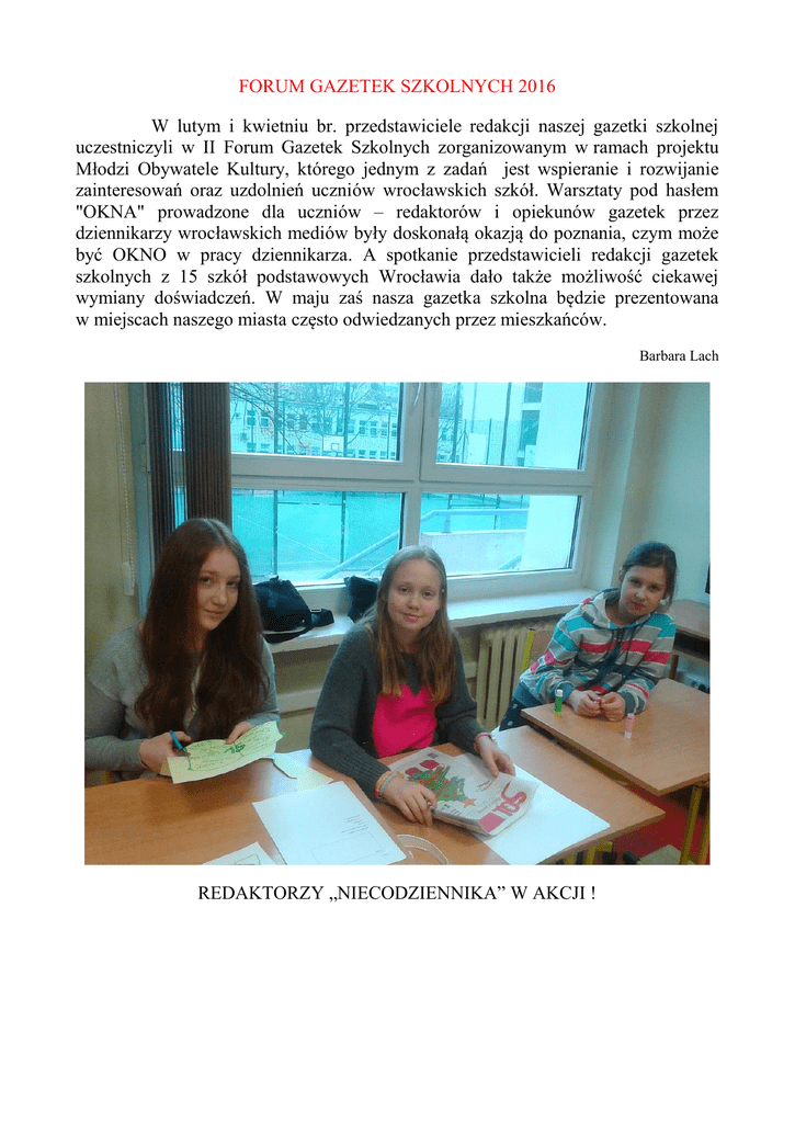 FORUM GAZETEK SZKOLNYCH 2016 W lutym i kwietniu br. przedstawiciele redakcji naszej gazetki szkolnej uczestniczyli w II Forum Gazetek Szkolnych zorganizowanym w ramach projektu Młodzi Obywatele Kultury, którego jednym z zadań jest wspieranie i rozwijanie zainteresowań oraz uzdolnień uczniów wrocławskich szkół. Warsztaty pod hasłem "OKNA" prowadzone dla uczniów – redaktorów i opiekunów gazetek przez dziennikarzy wrocławskich mediów były doskonałą okazją do poznania, czym może być OKNO w pracy dziennikarza. A spotkanie przedstawicieli redakcji gazetek szkolnych z 15 szkół podstawowych Wrocławia dało także możliwość ciekawej wymiany doświadczeń. W maju zaś nasza gazetka szkolna będzie prezentowana w miejscach naszego miasta często odwiedzanych przez mieszkańców. Barbara Lach REDAKTORZY „NIECODZIENNIKA” W AKCJI !