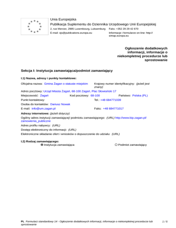 Unia Europejska Publikacja Suplementu do Dziennika Urzędowego Unii Europejskiej 2, rue Mercier, 2985 Luxembourg, Luksemburg Faks: +352 29 29 42 670 E-mail: [email protected] Informacje i formularze on-line: http:// simap.europa.eu Ogłoszenie dodatkowych informacji, informacje o niekompletnej procedurze lub sprostowanie Sekcja I: Instytucja zamawiająca/podmiot zamawiający I.1) Nazwa, adresy i punkty kontaktowe: Oficjalna nazwa: Gmina Żagan o statusie miejskim Krajowy numer identyfikacyjny: (jeżeli jest znany) _____ Adres pocztowy: Urząd Miasta Żagań, 68-100 Zagań, Plac Słowiański 17 Miejscowość: Żagań Kod pocztowy: 68-100 Punkt kontaktowy: _____ Państwo: Polska (PL) Tel.: +48 684771039 Osoba do kontaktów: Dariusz Nowak E-mail: [email protected] Faks: +48 684771017 Adresy internetowe: (jeżeli dotyczy) Ogólny adres instytucji zamawiającej/ podmiotu zamawiającego: (URL) http://www.bip.zagan.pl/ zamowienia_publiczne Adres profilu nabywcy: (URL) _____ Dostęp elektroniczny do informacji: (URL) _____ Elektroniczne składanie ofert i wniosków o dopuszczenie do udziału: (URL) _____ I.2) Rodzaj zamawiającego: Instytucja zamawiająca Podmiot zamawiający PL Formularz standardowy 14 - Ogłoszenie dodatkowych informacji, informacje o niekompletnej procedurze lub sprostowanie 1/5 Sekcja II: Przedmiot zamówienia II.1.1) Nazwa nadana zamówieniu: Budowa systemu informacji przestrzennej oraz wdrożenie usług publicznych w Gminie Miejskiej Żagań II.1.2) Krótki opis zamówienia lub zakupu: (podano w pierwotnym ogłoszeniu) Przedmiotem zamówienia jest budowa systemu informacji przestrzennej oraz wdrożenie usług publicznych w gminie miejskiej Żagań. rzedmiot zamówienia obejmuje dostawę, instalację i konfigurację serwerów – 2 szt., macierzy dyskowej – 1 szt., UPS – 1 szt,, dostawę, instalacje i konfigurację oprogramowania narzędziowego na potrzeby systemu informacji przestrzennej obejmującej systemy operacyjne, oprogramowanie bazodanowe, system backupu, oprogramowanie systemu informacji przestrzennej, dostawę oprogramowania dziedzinowego systemu informacji przestrzennej obejmującej Rejestr Interesantów, Ewidencję Gruntów i Budynków, Ewidencję Miejscowości Ulic i Adresów, Ewidencję Nieruchomości, Rejestr Ofert Inwestycyjnych, Rejestr Planów Przestrzennych, Rejestr Decyzji Lokalizacyjnych, Ewidencję Dróg i Obiektów Mostowych, Ewidencję Zajęcia Pasa Drogowego, Ewidencję Oświetlenia Dróg, Ewidencję Zabytków, Rejestr Pomników Przyrody, Ewidencję Zbiorników Bezodpływowych i Przydomowych Oczyszczalni Ścieków, Rejestr Decyzji Środowiskowych, Geoportal Intranet, Geoportal Internet, system zarządzania treścią (CMS), instalację, konfigurację i uruchomienie oprogramowania standardowego i dziedzinowego, uruchomienie E-usług publicznych zintegrowanych z ePUAP, przetworzenie danych z postaci analogowej do postaci elektronicznej, konwersji danych gromadzonych i w postaci elektronicznej do formatu obsługiwanego przez oprogramowanie, oraz zasilenie oprogramowania przetworzonymi lub skonwertowanymi danymi, przeprowadzenie szkoleń z obsługi systemu informacji przestrzennej, zapewnienie serwisu gwarancyjnego systemu informacji przestrzennej. II.1.3) Wspólny Słownik Zamówień (CPV) Główny przedmiot Dodatkowe przedmioty Słownik główny 48000000 72263000 Słownik uzupełniający (jeżeli dotyczy) PL Formularz standardowy 14 - Ogłoszenie dodatkowych informacji, informacje o niekompletnej procedurze lub sprostowanie 2/5 Sekcja IV: Procedura IV.1)Rodzaj procedury (podano w pierwotnym ogłoszeniu) Otwarta Ograniczona Ograniczona przyspieszona Negocjacyjna Negocjacyjna przyspieszona Dialog konkurencyjny Negocjacyjna z uprzednim ogłoszeniem Negocjacyjna bez uprzedniego ogłoszenia Negocjacyjna z publikacją ogłoszenia o zamówieniu Negocjacyjna bez publikacji ogłoszenia o zamówieniu Udzielenie zamówienia bez uprzedniej publikacji ogłoszenia o zamówieniu w Dzienniku Urzędowym Unii Europejskiej IV.2)Informacje administracyjne IV.2.1)Numer referencyjny: (podano w pierwotnym ogłoszeniu) WZP.271.1.2015 IV.2.2)Dane referencyjne ogłoszenia w przypadku ogłoszeń przesłanych drogą elektroniczną: Pierwotne ogłoszenie przesłane przez eNotices TED eSender Login: ENOTICES_Niklewicz Dane referencyjne ogłoszenia: 2015-015513 rok i numer dokumentu IV.2.3)Ogłoszenie, którego dotyczy niniejsza publikacja: Numer ogłoszenia w Dz.U.: 2015/S 027-044907 z dnia: 07/02/2015 (dd/mm/rrrr) IV.2.4)Data wysłania pierwotnego ogłoszenia: 03/02/2015 (dd/mm/rrrr) PL Formularz standardowy 14 - Ogłoszenie dodatkowych informacji, informacje o niekompletnej procedurze lub sprostowanie 3/5 Sekcja VI: Informacje uzupełniające VI.1) Ogłoszenie dotyczy: Procedury niepełnej Sprostowania Informacji dodatkowych VI.2) Informacje na temat niepełnej procedury udzielenia zamówienia: Postępowanie o udzielenie zamówienia zostało przerwane Postępowanie o udzielenie zamówienia uznano za nieskuteczne Zamówienia nie udzielono Zamówienie może być przedmiotem ponownej publikacji VI.3) Informacje do poprawienia lub dodania : VI.3.1) Zmiana oryginalnej informacji podanej przez instytucję zamawiającą Publikacja w witrynie TED niezgodna z oryginalną informacją, przekazaną przez instytucję zamawiającą Oba przypadki VI.3.2) W ogłoszeniu pierwotnym W odpowiedniej dokumentacji przetargowej (więcej informacji w odpowiedniej dokumentacji przetargowej) W obu przypadkach (więcej informacji w odpowiedniej dokumentacji przetargowej) VI.3.3) Tekst, który należy poprawić w pierwotnym ogłoszeniu Miejsce, w którym znajduje się Zamiast: Powinno być: zmieniany tekst: Wykonawcy występujący wspólnie zapis wykresla się wcałości III.1.3 Forma prawna, jaką musi muszą ustanowić pełnomocnika do przyjąć grupa wykonawców, której reprezentowania ich w postępowaniu o udzielenie niniejszego zamówienia zostanie udzielone zamówienie lub do reprezentowania ich w