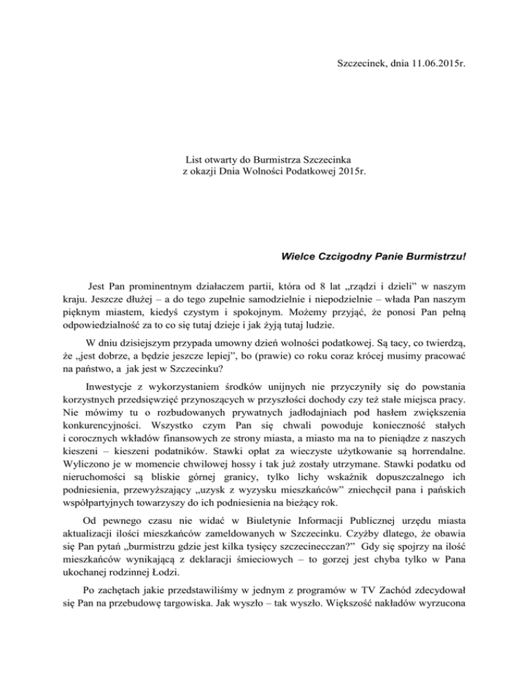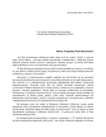 Szczecinek, dnia 11.06.2015r. List otwarty do Burmistrza Szczecinka z okazji Dnia Wolności Podatkowej 2015r. Wielce Czcigodny Panie Burmistrzu! Jest Pan prominentnym działaczem partii, która od 8 lat „rządzi i dzieli” w naszym kraju. Jeszcze dłużej – a do tego zupełnie samodzielnie i niepodzielnie – włada Pan naszym pięknym miastem, kiedyś czystym i spokojnym. Możemy przyjąć, że ponosi Pan pełną odpowiedzialność za to co się tutaj dzieje i jak żyją tutaj ludzie. W dniu dzisiejszym przypada umowny dzień wolności podatkowej. Są tacy, co twierdzą, że „jest dobrze, a będzie jeszcze lepiej”, bo (prawie) co roku coraz krócej musimy pracować na państwo, a jak jest w Szczecinku? Inwestycje z wykorzystaniem środków unijnych nie przyczyniły się do powstania korzystnych przedsięwzięć przynoszących w przyszłości dochody czy też stałe miejsca pracy. Nie mówimy tu o rozbudowanych prywatnych jadłodajniach pod hasłem zwiększenia konkurencyjności. Wszystko czym Pan się chwali powoduje konieczność stałych i corocznych wkładów finansowych ze strony miasta, a miasto ma na to pieniądze z naszych kieszeni – kieszeni podatników. Stawki opłat za wieczyste użytkowanie są horrendalne. Wyliczono je w momencie chwilowej hossy i tak już zostały utrzymane. Stawki podatku od nieruchomości są bliskie górnej granicy, tylko lichy wskaźnik dopuszczalnego ich podniesienia, przewyższający „uzysk z wyzysku mieszkańców” zniechęcił pana i pańskich współpartyjnych towarzyszy do ich podniesienia na bieżący rok. Od pewnego czasu nie widać w Biuletynie Informacji Publicznej urzędu miasta aktualizacji ilości mieszkańców zameldowanych w Szczecinku. Czyżby dlatego, że obawia się Pan pytań „burmistrzu gdzie jest kilka tysięcy szczecinecczan?” Gdy się spojrzy na ilość mieszkańców wynikającą z deklaracji śmieciowych – to gorzej jest chyba tylko w Pana ukochanej rodzinnej Łodzi. Po zachętach jakie przedstawiliśmy w jednym z programów w TV Zachód zdecydował się Pan na przebudowę targowiska. Jak wyszło – tak wyszło. Większość nakładów wyrzucona w błoto (nieszczęsny barako-hangar), niefunkcjonalne stoły, brak logicznego rozplanowania ustawienia stoisk etc. Za to ceny jak w Europie, tej prawdziwej Europie. Tak wysokich cen za wodę i ścieki nie płacą mieszkańcy dużych miast, nawet górale w Zakopanem za wodę płacą mniej , a przecież PWiK to spółka kierowana przez Pana! Mimo iż śmieci wywozi inna miejscowa, samorządowa spółka to stawki za wywóz śmieci też są horrendalne. Księgowo wszystko gra –ale gdy się w spółki monopolistów podpina inne bardzo kosztowne działania (basen, korty tenisowe, Szlot, ...), to mieszkaniec nie ma wyboru, płacze i płaci. Mieszkaniec Szczecinka jest w swej masie biedny, poza nielicznymi wyjątkami w osobie Pana, pańskich kolegów i koleżanek, co widać w oświadczeniach majątkowych. Panie burmistrzu. Ma Pan jeszcze 3 lata przed sobą jako włodarz miasta. Ma Pan szansę na dokonanie takich zmian, które dadzą trochę ulgi mieszkańcom. Nie wystarczy tej ulgi na – tak ulubione w Platformie Obywatelskiej ośmiorniczki i wołowe policzki – ale dla wielu mieszkańców nawet te kilkaset czy kilkadziesiąt złotych w kieszeni ma znaczenie. Niech Pan zechce kupić nasz pomysł na „Tańsze Miasto”. Niech go Pan przedstawi jako własny czy PO. Niech Pan zacznie wreszcie myśleć w kategoriach biednych ludzi, a nie fajerwerków bądź wodotrysków. Jest nas w Szczecinku coraz mniej, młodzi wyjeżdżają jesteśmy wiec coraz starsi, jesteśmy też coraz ubożsi. Dlatego tak nam zależy, by dzień Wolności Podatkowej u nas przypadał dużo wcześniej niż w innych regionach kraju. Ruch Obywatelski Razem Dla Szczecinka