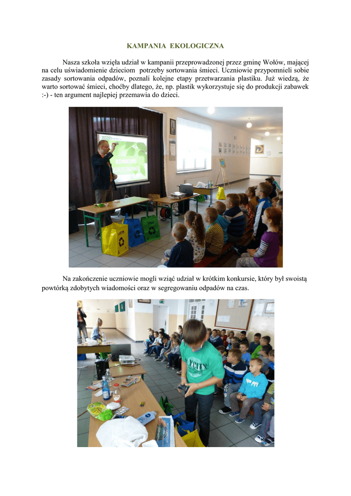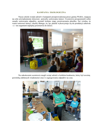KAMPANIA EKOLOGICZNA Nasza szkoła wzięła udział w kampanii przeprowadzonej przez gminę Wołów, mającej na celu uświadomienie dzieciom potrzeby sortowania śmieci. Uczniowie przypomnieli sobie zasady sortowania odpadów, poznali kolejne etapy przetwarzania plastiku. Już wiedzą, że warto sortować śmieci, choćby dlatego, że, np. plastik wykorzystuje się do produkcji zabawek :-) - ten argument najlepiej przemawia do dzieci. Na zakończenie uczniowie mogli wziąć udział w krótkim konkursie, który był swoistą powtórką zdobytych wiadomości oraz w segregowaniu odpadów na czas.