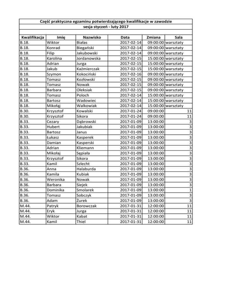 Część praktyczna egzaminu potwierdzającego kwalifikacje w zawodzie sesja styczeń - luty 2017 Kwalifikacja B.18. B.18. B.18. B.18. B.18. B.18. B.18. B.18. B.18. B.18. B.18. B.18. B.18. B.30. B.30. B.33. B.33. B.33. B.33. B.33. B.33. B.33. B.33. B.33. B.36. B.36. B.36. B.36. B.36. B.36. B.36. M.44. M.44. M.44. M.44. Imię Wiktor Konrad Filip Karolina Adrian Jakub Szymon Tomasz Tomasz Barbara Tomasz Bartosz Mikołąj Krzysztof Krzysztof Cezary Hubert Bartosz Łukasz Damian Adrian Mikołaj Krzysztof Kamil Anna Kamila Weronika Barbara Dominika Tomasz Adam Patryk Eryk Wiktor Kamil Nazwisko Białas Biegański Jakubowski Jordanowska Jurga Kaźmierczak Kokociński Kozłowski Nowak Oleksiak Poloch Wadowiec Walkowiak Kowalski Sikora Dąbrowski Jakubiak Janus Kasperek Kasperski Kliemann Sępiała Sikora Szlecht Halaburda Kubiak Nowak Siejek Smolarek Sobczyk Żurek Borowczak Jurga Kabat Thiel Data 2017-02-14 2017-02-14 2017-02-14 2017-02-15 2017-02-15 2017-02-15 2017-02-16 2017-02-15 2017-02-15 2017-02-15 2017-02-14 2017-02-14 2017-02-14 2017-01-24 2017-01-24 2017-01-09 2017-01-09 2017-01-09 2017-01-09 2017-01-09 2017-01-09 2017-01-09 2017-01-09 2017-01-09 2017-01-09 2017-01-09 2017-01-09 2017-01-09 2017-01-09 2017-01-09 2017-01-09 2017-01-31 2017-01-31 2017-01-31 2017-01-31 Zmiana 09:00:00 09:00:00 09:00:00 15:00:00 15:00:00 15:00:00 09:00:00 09:00:00 09:00:00 09:00:00 15:00:00 15:00:00 15:00:00 09:00:00 09:00:00 13:00:00 13:00:00 13:00:00 13:00:00 13:00:00 13:00:00 13:00:00 13:00:00 13:00:00 13:00:00 13:00:00 13:00:00 13:00:00 13:00:00 13:00:00 13:00:00 12:00:00 12:00:00 12:00:00 12:00:00 Sala warsztaty warsztaty warsztaty warsztaty warsztaty warsztaty warsztaty warsztaty warsztaty warsztaty warsztaty warsztaty warsztaty 11 11 3 3 3 3 3 3 3 3 3 3 3 3 3 1 3 3 11 11 11 11