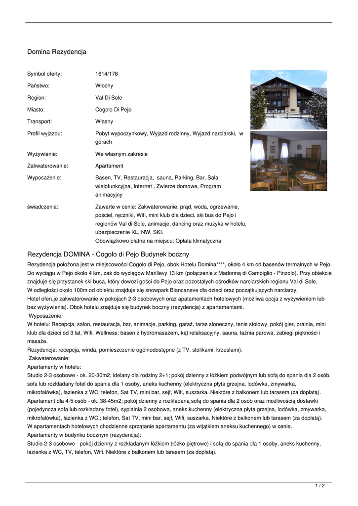 Domina Rezydencja Symbol oferty: 1614/178 Państwo: Włochy Region: Val Di Sole Miasto: Cogolo Di Pejo Transport: Własny Profil wyjazdu: Pobyt wypoczynkowy, Wyjazd rodzinny, Wyjazd narciarski, w Wyżywienie: We własnym zakresie Zakwaterowanie: Apartament Wyposażenie: Basen, TV, Restauracja, sauna, Parking, Bar, Sala górach wielofunkcyjna, Internet , Zwierze domowe, Program animacyjny świadczenia: Zawarte w cenie: Zakwaterowanie, prąd, woda, ogrzewanie, pościel, ręczniki, Wifi, mini klub dla dzieci, ski bus do Pejo i regionów Val di Sole, animacje, dancing oraz muzyka w hotelu, ubezpieczenie KL, NW, SKI. Obowiązkowo płatne na miejscu: Opłata klimatyczna Rezydencja DOMINA - Cogolo di Pejo Budynek boczny Rezydencja położona jest w miejscowości Cogolo di Pejo, obok Hotelu Domina****, około 4 km od basenów termalnych w Pejo. Do wyciągu w Pejo około 4 km, zaś do wyciągów Marillevy 13 km (połączenie z Madonną di Campiglio - Pinzolo). Przy obiekcie znajduje się przystanek ski busa, który dowozi gości do Pejo oraz pozostałych ośrodków narciarskich regionu Val di Sole, W odległości około 100m od obiektu znajduje się snowpark Biancaneve dla dzieci oraz początkujących narciarzy. Hotel oferuje zakwaterowanie w pokojach 2-3 osobowych oraz apatamentach hotelowych (możliwa opcja z wyżywieniem lub bez wyżywienia). Obok hotelu znajduje się budynek boczny (rezydencja) z apartamentami. Wyposażenie: W hotelu: Recepcja, salon, restauracja, bar, animacje, parking, garaż, taras słoneczny, tenis stołowy, pokój gier, pralnia, mini klub dla dzieci od 3 lat, Wifi. Wellness: basen z hydromasażem, kąt relaksacyjny, sauna, łaźnia parowa, zabiegi piękności i masaże. Rezydencja: recepcja, winda, pomieszczenie ogólnodostępne (z TV, stolikami, krzesłami). Zakwaterowanie: Apartamenty w hotelu: Studio 2-3 osobowe - ok. 20-30m2; idelany dla rodziny 2+1; pokój dzienny z łóżkiem podwójnym lub sofą do spania dla 2 osób, sofa lub rozkładany fotel do spania dla 1 osoby, aneks kuchenny (elektryczna płyta grzejna, lodówka, zmywarka, mikrofalówka), łazienka z WC; telefon, Sat TV, mini bar, sejf, Wifi, suszarka. Niektóre z balkonem lub tarasem (za dopłatą). Apartament dla 4-5 osób - ok. 38-45m2; pokój dzienny z rozkładaną sofą do spania dla 2 osób oraz możliwością dostawki (pojedyncza sofa lub rozkładany fotel), sypialnia 2 osobowa, aneks kuchenny (elektryczna płyta grzejna, lodówka, zmywarka, mikrofalówka), łazienka z WC,; telefon, Sat TV, mini bar, sejf, Wifi, suszarka. Niektóre z balkonem lub tarasem (za dopłatą). W apartamentach hotelowych chodzienne sprzątanie apartamentu (za wtjątkiem aneksu kuchennego) w cenie. Apartamenty w budynku bocznym (rezydencja): Studio 2-3 osobowe - pokój dzienny z rozkładanym łóżkiem (łóżko piętrowe) i sofą do spania dla 1 osoby, aneks kuchenny, łazienka z WC, TV, telefon, Wifi. Niektóre z balkonem lub tarasem (za dopłatą). 1/2 Apartament 4-5 osobowy - sypialnia z łóżkiem dwuosobowym, pokój dzienny z sofą i rozkładanym łóżkiem (łóżko piętrowe), aneks kuchenny, łazienka z WC, TV, telefon, Wifi. Niektóre z balkonem lub tarasem (za dopłatą). Wyżywienie: We własnym zakresie. Możliwość wykupienia wyżywienia: śniadania - 9 EUR za osobę za dzień, kolacje - 20 EUR za osobę za dzień. Zawarte w cenie: Zakwaterowanie, prąd, woda, ogrzewanie, pościel, ręczniki, Wifi, mini klub dla dzieci, ski bus do Pejo i regionów Val di Sole, animacje, dancing oraz muzyka w hotelu, ubezpieczenie KL, NW, SKI. Obowiązkowo płatne na miejscu: Opłata klimatyczna Opcjonalnie płatne na miejscu: Korzystanie z Wellnss - 8 EUR za osobę za dzień lub 36 EUR za osobę za tydzień. Płatne w biurze: Dopłata do apartamentu z balkonem - 6 EUR za dzień (na zapytanie). TERMINY: od: 2017-03-11 do: 2017-03-18 (8 dni), miejsca: zamów cena od: 827 PLN = 200 EUR od: 2017-03-18 do: 2017-03-25 (8 dni), miejsca: zamów cena od: 719 PLN = 173 EUR od: 2017-03-25 do: 2017-04-01 (8 dni), miejsca: zamów cena od: 719 PLN = 173 EUR od: 2017-04-01 do: 2017-04-08 (8 dni), miejsca: zamów cena od: 719 PLN = 173 EUR CENNIK: Długość pobytu: 8 dni 8 dni Grupa cenowa: A B 14 14 2.5 2.5 Ubezpieczenie (obligatoryjne) (*) Ubezpieczenie KL, NW, SKI (*) Turystyczny Fundusz Gwarancyjny Pobyt w obiekcie (do wyboru) Apart. 5 os. standardowo dla osób: 5 566 Apart. 4 os. standardowo dla osób: 4 minimalnie: 1 475 Studio 3 os. standardowo dla osób: 3 410 (*) Studio 2 / 2 os. standardowo dla osób: 2 minimalnie: 1 319 Rodzaj osoby (do wyboru) (*) Uczestnik (-) 676 585 462 371 (-) Waluta: EUR Aktualne ceny z systemu S.A.R.T. (-) - cena usługi, podatku kalkulowana przy osobie lub gratis (*) - kwota wliczona w cenę standardową 2/2