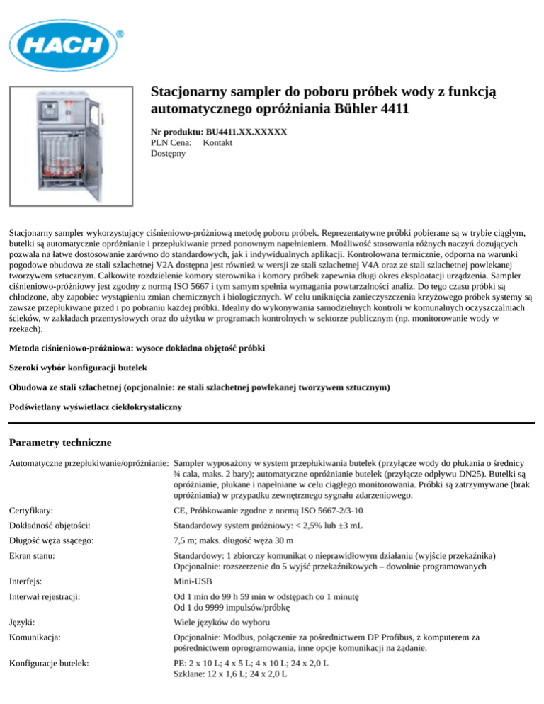 Stacjonarny sampler do poboru próbek wody z funkcją automatycznego opróżniania Bühler 4411 Nr produktu: BU4411.XX.XXXXX PLN Cena: Kontakt Dostępny Stacjonarny sampler wykorzystujący ciśnieniowo-próżniową metodę poboru próbek. Reprezentatywne próbki pobierane są w trybie ciągłym, butelki są automatycznie opróżnianie i przepłukiwanie przed ponownym napełnieniem. Możliwość stosowania różnych naczyń dozujących pozwala na łatwe dostosowanie zarówno do standardowych, jak i indywidualnych aplikacji. Kontrolowana termicznie, odporna na warunki pogodowe obudowa ze stali szlachetnej V2A dostępna jest również w wersji ze stali szlachetnej V4A oraz ze stali szlachetnej powlekanej tworzywem sztucznym. Całkowite rozdzielenie komory sterownika i komory próbek zapewnia długi okres eksploatacji urządzenia. Sampler ciśnieniowo-próżniowy jest zgodny z normą ISO 5667 i tym samym spełnia wymagania powtarzalności analiz. Do tego czasu próbki są chłodzone, aby zapobiec wystąpieniu zmian chemicznych i biologicznych. W celu uniknięcia zanieczyszczenia krzyżowego próbek systemy są zawsze przepłukiwane przed i po pobraniu każdej próbki. Idealny do wykonywania samodzielnych kontroli w komunalnych oczyszczalniach ścieków, w zakładach przemysłowych oraz do użytku w programach kontrolnych w sektorze publicznym (np. monitorowanie wody w rzekach). Metoda ciśnieniowo-próżniowa: wysoce dokładna objętość próbki Szeroki wybór konfiguracji butelek Obudowa ze stali szlachetnej (opcjonalnie: ze stali szlachetnej powlekanej tworzywem sztucznym) Podświetlany wyświetlacz ciekłokrystaliczny Parametry techniczne Automatyczne przepłukiwanie/opróżnianie: Sampler wyposażony w system przepłukiwania butelek (przyłącze wody do płukania o średnicy ¾ cala, maks. 2 bary); automatyczne opróżnianie butelek (przyłącze odpływu DN25). Butelki są opróżnianie, płukane i napełniane w celu ciągłego monitorowania. Próbki są zatrzymywane (brak opróżniania) w przypadku zewnętrznego sygnału zdarzeniowego. Certyfikaty: CE, Próbkowanie zgodne z normą ISO 5667-2/3-10 Dokładność objętości: Standardowy system próżniowy: < 2,5% lub ±3 mL Długość węża ssącego: 7,5 m; maks. długość węża 30 m Ekran stanu: Standardowy: 1 zbiorczy komunikat o nieprawidłowym działaniu (wyjście przekaźnika) Opcjonalnie: rozszerzenie do 5 wyjść przekaźnikowych – dowolnie programowanych Interfejs: Mini-USB Interwał rejestracji: Od 1 min do 99 h 59 min w odstępach co 1 minutę Od 1 do 9999 impulsów/próbkę Języki: Wiele języków do wyboru Komunikacja: Opcjonalnie: Modbus, połączenie za pośrednictwem DP Profibus, z komputerem za pośrednictwem oprogramowania, inne opcje komunikacji na żądanie. Konfiguracje butelek: PE: 2 x 10 L; 4 x 5 L; 4 x 10 L; 24 x 2,0 L Szklane: 12 x 1,6 L; 24 x 2,0 L Materiał obudowy: Dwuścienna obudowa ze stali szlachetnej (stal 1.4301/SS304) / PS / PC (GF10) z izolacją o grubości 40 mm. Obudowa oddziela komorę próbek od komory sterownika. Każda z nich posiada osobne zamykane drzwi. Górne drzwi posiadają okienko z pleksi. Jest możliwość otwarcia górnej pokrywy wykonanej z tworzywa Styrosun w celu wykonania podłączeń lub prac konserwacyjnych. Opcjonalnie: stal 1.4571/SS316Ti; SS304 powlekana żywicą epoksydową; SS316Ti powlekana żywicą epoksydową Materiał węża ssącego: PVC Materiały stykające się z medium: PC, PVC, silikon, PS, PE, EPDM (opcjonalnie: szklane naczynie dozujące Duran50, obciążnik ze stali SS304) Ochrona przed przelaniem: Regulacja od 1 do 999 próbek/butelek Opcje startowe programu: Natychmiastowo, w określonym czasie, poprzez sygnał zewnętrzny Opcje zatrzymania programu: Zakończenie programu próbkowania po jednym powtórzeniu, praca ciągła lub x powtórzeń oraz określona data/godzina próbkowania Programy: 12 programów dowolnie konfigurowanych przez użytkownika z funkcją łączenia programów Ręczny pobór próbki: Możliwy w dowolnym momencie bez przerywania uruchomionego programu Średnica wewn. węża ssącego: 12 mm Sterownik: Sterowanie mikroprocesorowe, tryb uśpienia (<5 mA), zasilacz 8 - 16 V, klawiatura membranowa (z klawiszami od 0 do 9, ESC, ENT oraz kursorem), podświetlany wyświetlacz graficzny (128 x 64 pikseli) System chłodzenia: Samowystarczalny, regulowany system chłodzenia/ogrzewania z 4 ustawieniami, z funkcją no-frost. niezależnie od programowalnego sterownika, temperatura w komorze próbek: 4°C (regulacja w zakresie od 0,0 do 9,9°C) Szybkość zasysania próbki: >0,5 m/s na wysokości zasysania maks. 8 m (przy ciśnieniu atm. 1013 hPa); wydajność pompy można regulować elektronicznie Temperatura otoczenia: -20 - 43 °C Temperatura próbki: 0 – 40°C (32 – 104°F) Tryb pauzy: Możliwość przerwania uruchomionego programu w dowolnym momencie Tryb poboru próby: Ekstrakcja próbek: zależna od czasu, proporcjonalna do przepływu, przy stałym czasie/zmiennej objętości (CTVV), zdarzeniowa, ręczna Typ samplera: Stacjonarny Waga: Ok. 115 kg z konfiguracją butelek 2 x 10 L, PE, większa waga w przypadku konfiguracji z zestawem butelek i/lub ze szklanymi butelkami Wejścia: 1 analogowe: 0/4 - 20 mA 2 cyfrowe (przepływ, zdarzenie), długość impulsu 60 ms, poziom przełączania 7 - 24 V, maks. opór roboczy 500 omów, maks. długość kabla sygnałowego 30 m Wymiary: * z otwartą górną częścią Wymogi energetyczne (napięcie): 115/230 VAC Wysokość zasysania: Maks. 8 m (przy ciśnieniu 1013 hPa i wodzie stojącej), opcjonalnie więcej Zapis danych: 3000 wpisów, stabilna pamięć danych, przechowywanie danych dotyczących poboru próbek i punktów niepowodzeń, tj. ekstrakcja próbek, wymiana butelek, komunikaty, sygnały zewnętrzne Zasada poboru próby: Standardowy system próżniowy, 20 - 350 mL Opcjonalnie: System próżniowy 20 - 500 mL Opcjonalnie: Próżniowy CTVV, proporcjonalnie do przepływu 5 - 350 mL Opcjonalnie: Syst
