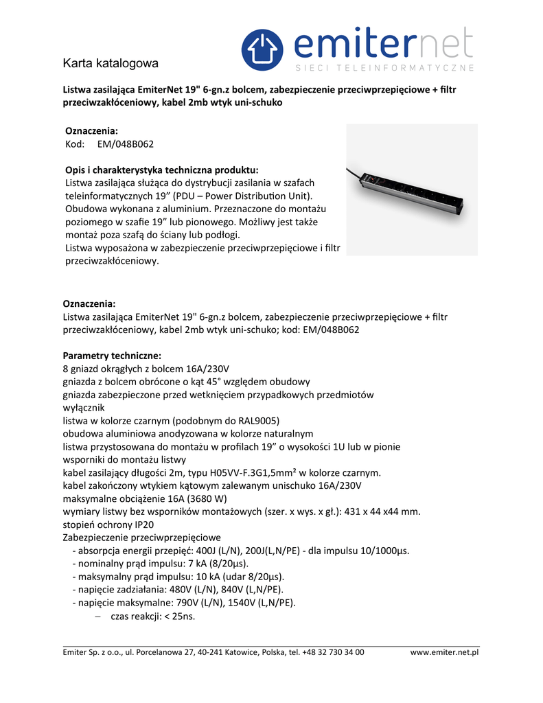 Karta katalogowa Listwa zasilająca EmiterNet 19" 6-gn.z bolcem, zabezpieczenie przeciwprzepięciowe + filtr przeciwzakłóceniowy, kabel 2mb wtyk uni-schuko Oznaczenia: Kod: EM/048B062 Opis i charakterystyka techniczna produktu: Listwa zasilająca służąca do dystrybucji zasilania w szafach teleinformatycznych 19” (PDU – Power Distribu-on Unit). Obudowa wykonana z aluminium. Przeznaczone do montażu poziomego w szafie 19” lub pionowego. Możliwy jest także montaż poza szafą do ściany lub podłogi. Listwa wyposażona w zabezpieczenie przeciwprzepięciowe i filtr przeciwzakłóceniowy. Oznaczenia: Listwa zasilająca EmiterNet 19" 6-gn.z bolcem, zabezpieczenie przeciwprzepięciowe + filtr przeciwzakłóceniowy, kabel 2mb wtyk uni-schuko; kod: EM/048B062 Parametry techniczne: 8 gniazd okrągłych z bolcem 16A/230V gniazda z bolcem obrócone o kąt 45° względem obudowy gniazda zabezpieczone przed wetknięciem przypadkowych przedmiotów wyłącznik listwa w kolorze czarnym (podobnym do RAL9005) obudowa aluminiowa anodyzowana w kolorze naturalnym listwa przystosowana do montażu w profilach 19” o wysokości 1U lub w pionie wsporniki do montażu listwy kabel zasilający długości 2m, typu H05VV-F.3G1,5mm² w kolorze czarnym. kabel zakończony wtykiem kątowym zalewanym unischuko 16A/230V maksymalne obciążenie 16A (3680 W) wymiary listwy bez wsporników montażowych (szer. x wys. x gł.): 431 x 44 x44 mm. stopień ochrony IP20 Zabezpieczenie przeciwprzepięciowe - absorpcja energii przepięć: 400J (L/N), 200J(L,N/PE) - dla impulsu 10/1000μs. - nominalny prąd impulsu: 7 kA (8/20μs). - maksymalny prąd impulsu: 10 kA (udar 8/20μs). - napięcie zadziałania: 480V (L/N), 840V (L,N/PE). - napięcie maksymalne: 790V (L/N), 1540V (L,N/PE). − czas reakcji: < 25ns. Emiter Sp. z o.o., ul. Porcelanowa 27, 40-241 Katowice, Polska, tel. +48 32 730 34 00 www.emiter.net.pl Karta katalogowa Filtr przeciwzakłóceniowy tryb symetryczny f (MHz) 0,15 A (dB) 29 1 42 4,7 30 10 47 30 43 tryb asymetryczny f (MHz) A (dB) 1 62 4,7 64 10 43 30 22 0,15 25 Certyfikaty: Deklaracja Zgodnosci Nr 28/08/2014 Dołożyliśmy wszelkich starań, aby przedstawione informacje były rzetelne i kompletne. Jednak nie ponosimy odpowiedzialności za dokładność i kompletność danych oraz w szczególności nie możemy zagwarantować, że niniejsza specyfikacja nie zawiera błędów lub pomyłek. Informacje zawarte w niniejszej specyfikacji mogą zostać zmienione w każdej chwili bez powiadomienia. Sprzęt podlega selektywnej zbiórce EEE Zakaz umieszczania zużytego sprzętu łącznie z innymi odpadami, co może potencjalnie skutkować na środowisko i zdrowie ludzkie. Emiter Sp. z o.o., ul. Porcelanowa 27, 40-241 Katowice, Polska, tel. +48 32 730 34 00 www.emiter.net.pl