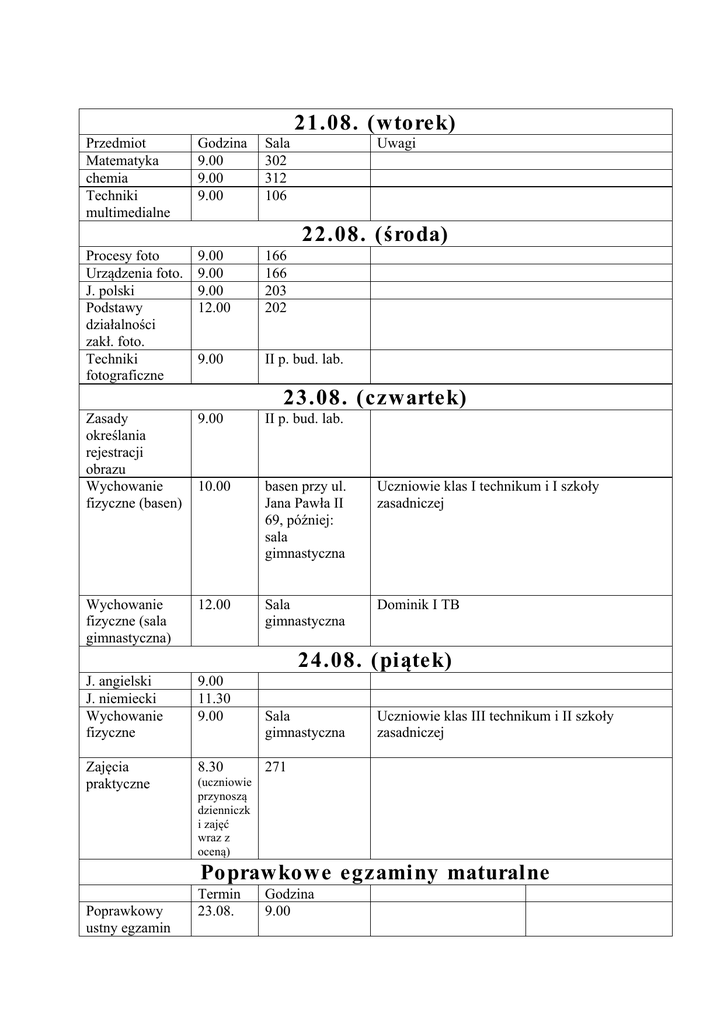 21.08. (wtorek) Przedmiot Matematyka chemia Techniki multimedialne Godzina 9.00 9.00 9.00 Sala 302 312 106 Uwagi 22.08. (środa) Procesy foto Urządzenia foto. J. polski Podstawy działalności zakł. foto. Techniki fotograficzne 9.00 9.00 9.00 12.00 166 166 203 202 9.00 II p. bud. lab. 23.08. (czwartek) Zasady określania rejestracji obrazu Wychowanie fizyczne (basen) 9.00 II p. bud. lab. 10.00 basen przy ul. Jana Pawła II 69, później: sala gimnastyczna Uczniowie klas I technikum i I szkoły zasadniczej Wychowanie fizyczne (sala gimnastyczna) 12.00 Sala gimnastyczna Dominik I TB 24.08. (piątek) J. angielski J. niemiecki Wychowanie fizyczne 9.00 11.30 9.00 Zajęcia praktyczne 8.30 Sala gimnastyczna Uczniowie klas III technikum i II szkoły zasadniczej 271 (uczniowie przynoszą dzienniczk i zajęć wraz z oceną) Poprawkowe egzaminy maturalne Poprawkowy ustny egzamin Termin 23.08. Godzina 9.00 maturalny – j. niemiecki Popr. ustny egzamin maturalny – j. polski Popr. ustny egzamin maturalny – j. angielski Poprawkowy pisemny egzamin maturalny 23.08. 9.00 23.08. 9.00 21.08. 8.30