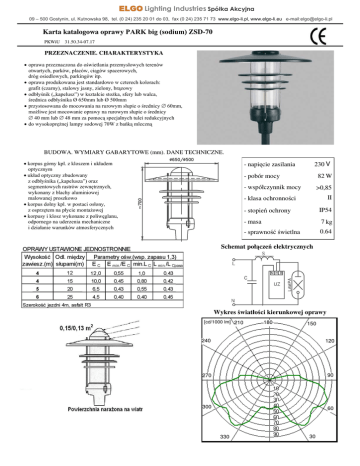 ELGO Lighting Industries Spóãka Akcyjna 09 – 500 Gostynin, ul. Kutnowska 98, tel. (0 24) 235 20 01 do 03, fax (0 24) 235 71 73 www.elgo-li.pl, www.elgo-li.eu e-mail:[email protected] Karta katalogowa oprawy PARK big (sodium) ZSD-70 PKWiU 31.50.34-07.17 PRZEZNACZENIE. CHARAKTERYSTYKA x oprawa przeznaczona do oĞwietlania przemysáowych terenów otwartych, parków, placów, ciągów spacerowych, dróg osiedlowych, parkingów itp. x oprawa produkowana jest standardowo w czterech kolorach: grafit (czarny), stalowy jasny, zielony, brązowy x odbáyĞnik („kapelusz”) w ksztaácie stoĪka, sfery lub walca, Ğrednica odbáyĞnika Ø 650mm lub Ø 500mm x przystosowana do mocowania na rurowym sáupie o Ğrednicy 60mm, moĪliwe jest mocowanie oprawy na rurowym sáupie o Ğrednicy 40 mm lub 48 mm za pomocą specjalnych tulei redukcyjnych x do wysokoprĊĪnej lampy sodowej 70W z baĔką mleczną BUDOWA. WYMIARY GABARYTOWE (mm). DANE TECHNICZNE. x korpus górny kpl. z kloszem i ukáadem optycznym x ukáad optyczny zbudowany z odbáyĞnika („kapelusza”) oraz segmentowych rastrów zewnĊtrznych, wykonany z blachy aluminiowej malowanej proszkowo x korpus dolny kpl. w postaci osáony, z osprzĊtem na páycie montaĪowej x korpusy i klosz wykonane z poliwĊglanu, odpornego na uderzenia mechaniczne i dziaáanie warunków atmosferycznych 230 V - napięcie zasilania - pobór mocy 82 W - współczynnik mocy >0,85 II - klasa ochronności - stopień ochrony IP54 - masa 7 kg - sprawność świetlna 0.64 Schemat połączeń elektrycznych Wykres światłości kierunkowej oprawy [cd/1000 lm] 210 180 150 240 120 270 90 300 60 330 30