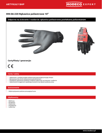 ARTYKUŁY BHP MN-06-220 Rękawice poliestrowe 10" Odporne na ścieranie i rozdarcie rękawice poliestrowe powlekane poliuretanem Certyfikaty i gwarancje: Cechy i zalety • • • • Wykonanie z cienkiej przędzy poliestrowej poprawiaja precyzję chwytu Bezszwowy krój chroni skórę przed podrażnieniami Powlekane spienianym lateksem zwiększa odporność na ścieranie i rozdarcie Wykończenie ściągaczem zapobiega zsuwaniu się rękawic podczas pracy Zastosowanie • Wykorzystywane podczas precyzyjnych prac Użytkownicy • Elektrycy • Drogowcy • Glazurnicy • Instalatorzy • Lakiernicy www.modeco.pl ARTYKUŁY BHP Dane techniczne Indeks MN-06-220 Rozmiar Opakowanie jed nostkowe Opakowanie zbiorcze Waga opakowa nia jednostkowe go Waga opakowa nia zbiorczego [-] [szt] [szt] [kg] [kg] 10" 12 240 0.42 8.4 EAN 5906675088303 Ostrzeżenia • Przeczytaj instrukcję obsługi www.modeco.pl