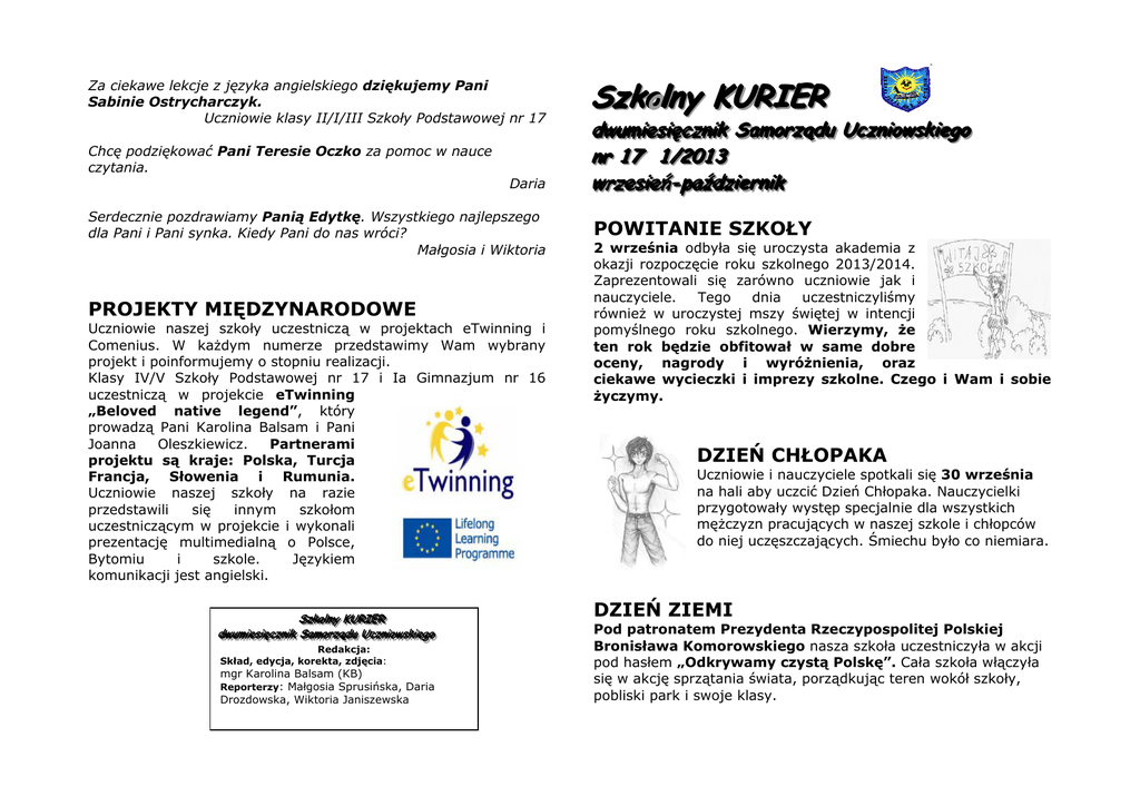 Za ciekawe lekcje z języka angielskiego dziękujemy Pani Sabinie Ostrycharczyk. Uczniowie klasy II/I/III Szkoły Podstawowej nr 17 Chcę podziękować Pani Teresie Oczko za pomoc w nauce czytania. Daria Serdecznie pozdrawiamy Panią Edytkę. Wszystkiego najlepszego dla Pani i Pani synka. Kiedy Pani do nas wróci? Małgosia i Wiktoria PROJEKTY MIĘDZYNARODOWE Uczniowie naszej szkoły uczestniczą w projektach eTwinning i Comenius. W każdym numerze przedstawimy Wam wybrany projekt i poinformujemy o stopniu realizacji. Klasy IV/V Szkoły Podstawowej nr 17 i Ia Gimnazjum nr 16 uczestniczą w projekcie eTwinning „Beloved native legend”, który prowadzą Pani Karolina Balsam i Pani Joanna Oleszkiewicz. Partnerami projektu są kraje: Polska, Turcja Francja, Słowenia i Rumunia. Uczniowie naszej szkoły na razie przedstawili się innym szkołom uczestniczącym w projekcie i wykonali prezentację multimedialną o Polsce, Bytomiu i szkole. Językiem komunikacji jest angielski. S S U Szzzkkkooolllnnnyyy KKKU URRRIIIEEERRR dddw cczzznnniiikkk S aam ząąąddduuu U oo w m S morz Ucz w wuuum miiieeesssiiięęęc Sa mor orz Ucczznnniiiooow wssskkkiiieeegggo Redakcja: Skład, edycja, korekta, zdjęcia: mgr Karolina Balsam (KB) Reporterzy: Małgosia Sprusińska, Daria Drozdowska, Wiktoria Janiszewska Szkolny KURIER du U zniioow kiieeggoo ddw siięęcczznniikk S rzząądu Saam moor Ucczn wssk wuum miiees nnr r 1177 11//22001133 rniikk aźźddzziieern w siieeńń--ppa rzees wrz POWITANIE SZKOŁY 2 września odbyła się uroczysta akademia z okazji rozpoczęcie roku szkolnego 2013/2014. Zaprezentowali się zarówno uczniowie jak i nauczyciele. Tego dnia uczestniczyliśmy również w uroczystej mszy świętej w intencji pomyślnego roku szkolnego. Wierzymy, że ten rok będzie obfitował w same dobre oceny, nagrody i wyróżnienia, oraz ciekawe wycieczki i imprezy szkolne. Czego i Wam i sobie życzymy. DZIEŃ CHŁOPAKA Uczniowie i nauczyciele spotkali się 30 września na hali aby uczcić Dzień Chłopaka. Nauczycielki przygotowały występ specjalnie dla wszystkich mężczyzn pracujących w naszej szkole i chłopców do niej uczęszczających. Śmiechu było co niemiara. DZIEŃ ZIEMI Pod patronatem Prezydenta Rzeczypospolitej Polskiej Bronisława Komorowskiego nasza szkoła uczestniczyła w akcji pod hasłem „Odkrywamy czystą Polskę”. Cała szkoła włączyła się w akcję sprzątania świata, porządkując teren wokół szkoły, pobliski park i swoje klasy. DZIEŃ NAUCZYCIELA Z okazji Dnia Edukacji Narodowej 15 października w naszej szkole odbyła się akademia, na której uczniowie wręczyli nauczycielom własnoręcznie wykonane praz uczniów uczestniczących w zajęciach świetlicowych kwiatki z papieru zawierające życzenia. Postaramy się w tym roku nie sprawiać nauczycielom kłopotów, nie chodzić na wagary i dobrze się uczyć. W WY YB BO OR RY YD DO OS SA AM MO OR RZ ZĄ ĄD DU U U UC CZ ZN NIIO OW WS SK KIIE EG GO O 1 1 7 p d n o d b w n o 17 7p paaaźźźd dzzziiieeerrrn niiikkkaaa o od db byyyłłłyyy sssiiięęę w wn naaassszzzeeejjj ssszzzkkko ollleee w y b o r y d o R a d y M ł o d z i e ż y . W w y n i k u w y b o r y d o R a d y M ł o d z i e ż y . W w y n i k u wybory do Rady Młodzieży. W wyniku g W o w b n g o o w n Waaasssiii wyyyb brrraaan niii W głłło ossso ow waaan niiiaaa zzzo ossstttaaallliii w : d s t a w i c i e l e p r z e r z e d s t a w i c i e l e : p przedstawiciele: P P a y k K u b a k p w o d n o 3 9 g o ó w Pa atttrrry yk kK Ku ub ba accck kiii p prrrzzzeeew wo od dn niiiccczzząąącccyyy ssszzzkkko ołłłyyy 3 39 9g głłło osssó ów w;;; W i r g i n i a M a t u s i k v i c e p r z e w o d n i c z ą c a 2 4 g ł o s y ; W i r g i n i a M a t u s i k v i c e p r z e w o d n i c z ą c a 2 4 g ł o s y ; Wirginia Matusik vice-przewodnicząca 24 głosy; JJJa a n u C h u b a b n 2 1 g o ó w an nu ussszzz C Ch hlllu ub ba a ssskkkaaarrrb bn niiikkk 2 21 1g głłło osssó ów w... PASOWANIE NA GIMNAZJALISTĘ byliśmy w kościele na mszy różańcowej. Uczniowie zarówno indywidualnie jak i klasami wykonali przepiękne różańce. Tego dnia odbył się quiz wiedzy religijnej. Miały też miejsce projekcje filmów o tej samej tematyce. W pracowni informatycznej mogliście obejrzeć filmy „Gość oczekiwany” i „Magiczne drzewo”. Na hali uczestniczyliście w zajęciach sportowych. RANKING KLAS Podczas całego roku szkolnego uczniowie klas IV-VI Szkoły Podstawowej nr 17 i IIII Gimnazjum nr 16 będą rywalizować w Rankingu Klas. Nagrodą będzie wyjście do kina ufundowane przez Radę Rodziców. Punkty będą przyznawane na podstawie wpisów do Białej i Czernej Księgi. WASZE SPRAWY W tym miejscu możecie zamieszczać swoje ogłoszenia. Jeśli chcecie komuś podziękować lub złożyć życzenia zgłoście się do biblioteki szkolnej. 29 października w naszej szkole odbyło się pasowanie na gimnazjalistę. Uczniowie klas pierwszych gimnazjum zostali włączeni w poczet gimnazjalistów. Program został przygotowany przez panie Teresę Oczko i Sabinę Maślankę. Dziękujemy uczniom klas pierwszych z występ. Mamy nadzieję, że przygotowany specjalnie na tą okazję magiczny napój już wkrótce zacznie działać i przemieni was w anioły ☺ poważnie ;) Dziękujemy za wesołe lekcje i za pomoc w nauce Pani Małgosi Witkowskiej Małgosia i Bożenka DZIEŃ SKUPIENIA Serdecznie dziękuję Darii za to, że jest moją najlepszą przyjaciółką! W ramach corocznych rekolekcji szkolnych 25 października cała społeczność szkolna uczestniczyła w Dniu Skupienia. Z tej okazji Za fajne zajęcie świetlicowe dziękujemy Pani Gosi Bartosińskiej. Szczególnie lubimy wycinać z papieru ☺ Dzieci ze świetlicy Małgosia