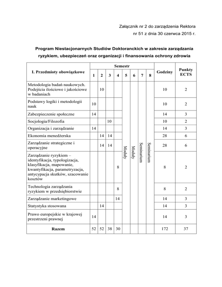 Załącznik nr 2 do zarządzenia Rektora nr 51 z dnia 30 czerwca 2015 r. Program Niestacjonarnych Studiów Doktoranckich w zakresie zarządzania ryzykiem, ubezpieczeń oraz organizacji i finansowania ochrony zdrowia Semestr I. Przedmioty obowiązkowe 1 Metodologia badań naukowych. Podejścia ilościowe i jakościowe w badaniach 2 3 4 5 6 7 8 10 Godziny Punkty ECTS 10 2 Podstawy logiki i metodologii nauk 10 10 2 Zabezpieczenie społeczne 14 14 3 10 2 14 3 28 6 28 6 Socjologia/Filozofia Organizacja i zarządzanie 10 14 Seminarium 14 14 Seminarium Zarządzanie strategiczne i operacyjne Moduły 14 14 Moduły Ekonomia menedżerska Zarządzanie ryzykiem – identyfikacja, typologizacja, klasyfikacja, mapowanie, kwantyfikacja, parametryzacja, antycypacja skutków, szacowanie kosztów 8 8 2 Technologia zarządzania ryzykiem w przedsiębiorstwie 8 8 2 14 14 3 14 3 14 14 3 52 52 38 30 172 37 Zarządzanie marketingowe Statystyka stosowana Prawo europejskie w krajowej przestrzeni prawnej Razem 14 Semestr II. Przedmioty do wyboru w 5 modułach Moduł 1. Organizacja i finasowanie ochrony zdrowia Rozwiązania systemowe w ochronie zdrowia II. Przedmioty do wyboru w modułach 14 3 14 3 14 3 14 14 3 28 56 12 Godziny Punkty ECTS 6 14 14 Ocena potencjału i stopnia wykorzystania rezerw infrastruktury, kadr, środków finansowych, możliwości oprogramowania w systemie ochrony zdrowia i podmiotach ochrony zdrowia Razem Punkty ECTS 14 Zarządzanie w podmiotach systemu ochrony zdrowia / zarządzanie w podmiotach leczniczych Finansowanie procedur medycznych w systemie ochrony zdrowia o charakterze etatystyczno-rynkowym Godziny 28 Semestr 5 6 Moduł 2. Ubezpieczenia Ubezpieczeniowa teoria, doktryna i technologia zarządzania ryzykiem utraty zdrowia 14 14 3 Metodologia i metodyka badań społecznych w analizie produktowej rynku 14 14 3 14 3 Warunki ubezpieczalności chorób w polskim etatystyczno-rynkowym modelu ochrony zdrowia 14 2 Wykorzystanie Health Technology Assessment w: (1) polityce lekowej, (2) szacowaniu kosztów i cen świadczeń zdrowotnych, (3) projektowaniu produktów ubezpieczenia zdrowotnego, (4) projektowaniu produktów ochrony zdrowia (świadczeń zdrowotnych) Razem II. Przedmioty do wyboru w modułach 28 14 14 3 28 56 12 Godziny Punkty ECTS Semestr 5 6 Moduł 3. Zarządzanie ryzykiem utraty zdrowia a ryzyko w działalności podmiotów systemu ochrony zdrowia Ryzyko w teorii, doktrynie i praktyce ubezpieczeniowej na przykładzie ryzyka utraty zdrowia 14 14 3 Kryteria i metody identyfikacji, klasyfikacji, kwantyfikacji, parametryzacji i rejestracji ryzyk w podmiotach systemu ochrony zdrowia 14 14 3 Konstrukcja programów zarządzania ryzykiem w podmiotach systemu ochrony zdrowia 14 14 3 Społeczne i ekonomiczne skutki realizacji ryzyka utraty zdrowia jako dobra publicznego i jako dobra prywatnego 14 14 3 28 56 12 Razem 28 3 6 7 8 14 seminarium + 8 konsultacje 20 seminarium 20 seminarium 14 konsultacje 6 konsultacje 3 6 konsultacje III. Seminarium doktorskie 2 6 konsultacje 1 Semestr 4 5 Razem ECTS 94 Seminarium = 12 pkt. ECTS Razem: 322 godziny dydaktyczne - 61 pkt ECTS Wymiar praktyk dydaktycznych nie mniej niż 10 i nie więcej niż 90 godzin rocznie. 4