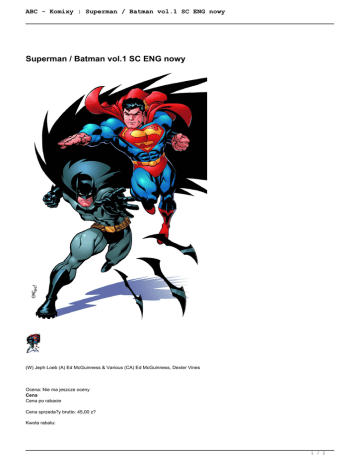 ABC - Komixy : Superman / Batman vol.1 SC ENG nowy Superman / Batman vol.1 SC ENG nowy (W) Jeph Loeb (A) Ed McGuinness & Various (CA) Ed McGuinness, Dexter Vines Ocena: Nie ma jeszcze oceny Cena Cena po rabacie Cena sprzeda?y brutto: 45,00 z? Kwota rabatu: 1 / 2 ABC - Komixy : Superman / Batman vol.1 SC ENG nowy Zadaj pytanie o produkt Producent: DC Comics Szczegó?y produktu (W) Jeph Loeb (A) Ed McGuinness & Various (CA) Ed McGuinness, Dexter Vines In this new edition from issues #1-13 of the hit series, Superman and Batman unite when Lex Luthor assembles a team of powerhouse heroes to bring Superman in dead or alive. Then, prepare for the arrival of Supergirl! Can Darkseid recruit her into doing his bidding? 2 / 2 Powered by TCPDF (www.tcpdf.org)