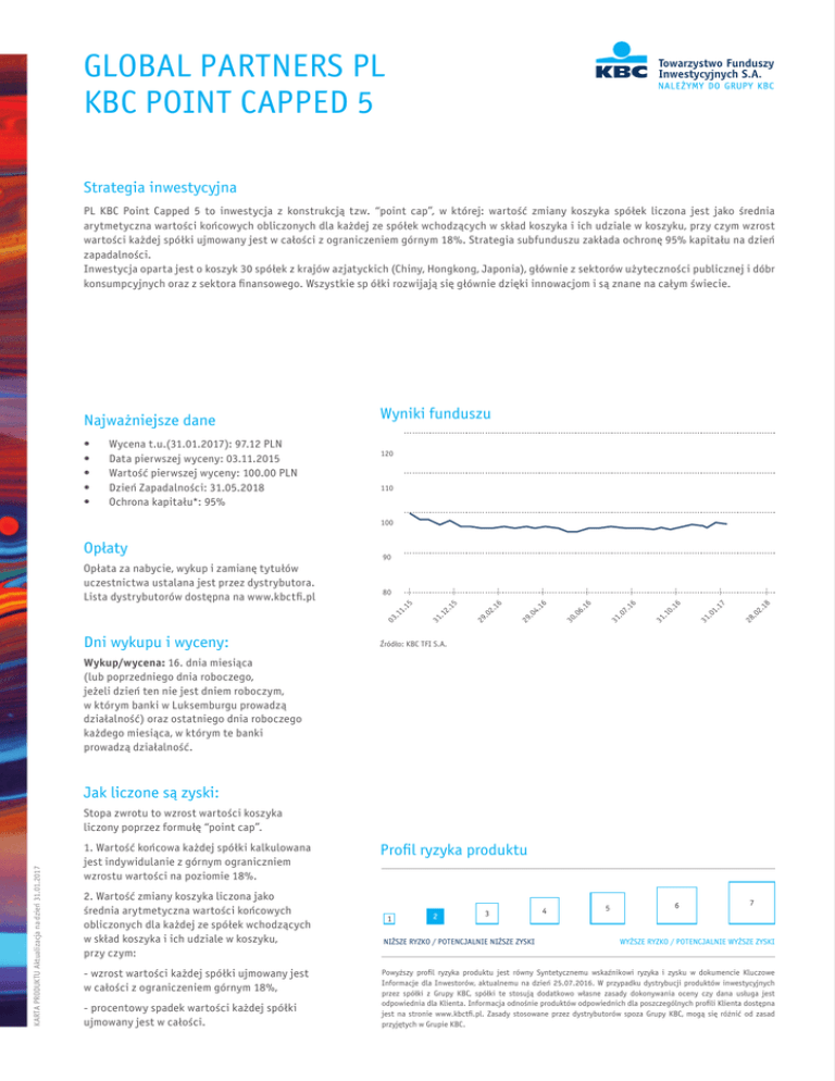 GLOBAL PARTNERS PL KBC POINT CAPPED 5 Strategia inwestycyjna PL KBC Point Capped 5 to inwestycja z konstrukcją tzw. “point cap”, w której: wartość zmiany koszyka spółek liczona jest jako średnia arytmetyczna wartości końcowych obliczonych dla każdej ze spółek wchodzących w skład koszyka i ich udziale w koszyku, przy czym wzrost wartości każdej spółki ujmowany jest w całości z ograniczeniem górnym 18%. Strategia subfunduszu zakłada ochronę 95% kapitału na dzień zapadalności. Inwestycja oparta jest o koszyk 30 spółek z krajów azjatyckich (Chiny, Hongkong, Japonia), głównie z sektorów użyteczności publicznej i dóbr konsumpcyjnych oraz z sektora finansowego. Wszystkie sp ółki rozwijają się głównie dzięki innowacjom i są znane na całym świecie. Najważniejsze dane • • • • • Wycena t.u.(31.01.2017): 97.12 PLN Data pierwszej wyceny: 03.11.2015 Wartość pierwszej wyceny: 100.00 PLN Dzień Zapadalności: 31.05.2018 Ochrona kapitału*: 95% Wyniki funduszu 120 110 100 90 18 2. .0 28 17 1. .0 31 16 0. .1 31 16 7. .0 31 16 6. .0 30 16 29 .0 4. 16 2. .0 29 2. .1 1. .1 03 Dni wykupu i wyceny: 15 80 15 Opłata za nabycie, wykup i zamianę tytułów uczestnictwa ustalana jest przez dystrybutora. Lista dystrybutorów dostępna na www.kbctfi.pl 31 Opłaty Źródło: KBC TFI S.A. Wykup/wycena: 16. dnia miesiąca (lub poprzedniego dnia roboczego, jeżeli dzień ten nie jest dniem roboczym, w którym banki w Luksemburgu prowadzą działalność) oraz ostatniego dnia roboczego każdego miesiąca, w którym te banki prowadzą działalność. Jak liczone są zyski: KARTA PRODUKTU Aktualizacja na dzień 31.01.2017 Stopa zwrotu to wzrost wartości koszyka liczony poprzez formułę “point cap”. 1. Wartość końcowa każdej spółki kalkulowana jest indywidulanie z górnym ograniczniem wzrostu wartości na poziomie 18%. 2. Wartość zmiany koszyka liczona jako średnia arytmetyczna wartości końcowych obliczonych dla każdej ze spółek wchodzących w skład koszyka i ich udziale w koszyku, przy czym: - wzrost wartości każdej spółki ujmowany jest w całości z ograniczeniem górnym 18%, - procentowy spadek wartości każdej spółki ujmowany jest w całości. Profil ryzyka produktu NIŻSZE RYZKO / POTENCJALNIE NIŻSZE ZYSKI WYŻSZE RYZKO / POTENCJALNIE WYŻSZE ZYSKI Powyższy profil ryzyka produktu jest równy Syntetycznemu wskaźnikowi ryzyka i zysku w dokumencie Kluczowe Informacje dla Inwestorów, aktualnemu na dzień 25.07.2016. W przypadku dystrybucji produktów inwestycyjnych przez spółki z Grupy KBC, spółki te stosują dodatkowo własne zasady dokonywania oceny czy dana usługa jest odpowiednia dla Klienta. Informacja odnośnie produktów odpowiednich dla poszczególnych profili Klienta dostępna jest na stronie www.kbctfi.pl. Zasady stosowane przez dystrybutorów spoza Grupy KBC, mogą się różnić od zasad przyjętych w Grupie KBC. GLOBAL PARTNERS PL KBC POINT CAPPED 5 Akcje spółek wchodzące w skład koszyka: Lp. Nazwa spółki Giełda Waga w koszyku[%] Kurs początkowy Kurs na dzień aktualizacji 1. Hengan Intl Group Co Ltd HK 3,33 80,99 63,75 Zmiana -21,29 2. China Shenhua Energy Co-H HK 3,33 12,68 16,54 30,40 3. Henderson Land Development HK 3,33 47,66 43,05 -9,67 4. Agricultural Bank of China-H HK 3,33 3,07 3,26 6,12 5. Industrial & Commercial Bank Of China Ltd HK 3,33 4,78 4,78 -0,04 6. Sun Hung Kai Properties HK 3,33 98,48 107,40 7. Belle International Holdings HK 3,33 7,11 4,76 -33,05 8. CLP HK 3,33 65,83 75,85 15,22 9. Boc Hong Kong Hold Ltd HK 3,33 24,82 31,20 25,71 10. Japan Tobacco Inc JT 3,33 4 438,60 3 640,00 -17,99 11. China Petroleum & Chemical HK 3,33 5,20 6,21 19,42 12. Bank Of China Ltd HK 3,33 3,49 3,54 1,49 13. Wharf Holdings Ltd HK 3,33 44,35 58,55 32,02 14. Power Assets Holdings Ltd HK 3,33 73,86 74,55 15. Komatsu JT 3,33 2 006,60 2 694,00 16. Toshiba Corp. JT 3,33 305,02 242,30 17. Panasonic Corp JT 3,33 1 410,60 1 178,50 -16,45 18. Nissan Motor Co Ltd JT 3,33 1 275,10 1 119,00 -12,24 19. Toyota Motor Corp (JT) JT 3,33 7 550,20 6 584,00 -12,80 20. Honda Motor JT 3,33 4 009,60 3 387,00 -15,53 21. Canon JT 3,33 3 735,40 3 345,00 -10,45 -12,30 9,06 0,93 34,26 -20,56 22. Sumitomo Mitsui Financial Group JT 3,33 5 075,00 4 451,00 23. PetroChina Co Ltd HK 3,33 5,74 6,22 24. Mitsui Fudosan Co Ltd JT 3,33 3 192,00 2 616,50 25. CNOOC HK 3,33 8,43 9,84 16,78 26. 26 Huaneng Power International Inc HK 3,33 7,83 5,06 -35,41 27. China Construction Bank-H HK 3,33 5,47 5,80 6,03 28. China Mobile Hong Kong HK 3,33 90,83 87,85 -3,28 8,40 -18,03 29. Lenovo Group Ltd HK 3,33 7,76 5,11 -34,15 30. Fast Retailing Co Ltd JT 3,33 47 366,00 35 580,00 -24,88 Źródło: obliczenia KBC TFI S.A. na podstawie serwisu www.bloomberg.com Kurs Początkowy dla i-tej spółki - średnia arytmetyczna kursów zamknięcia cen akcji z pierwszych 5 sesji giełdowych począwszy od 10 listopada 2015 r. KBC Towarzystwo Funduszy Inwestycyjnych S.A. Informacje podstawowe: Siedziba: ul. Chmielna 85/87, 00-805 Warszawa Kontakt: [email protected]; infolinia: (22) 582 88 58 Aktywa w zarządzaniu: 4,4 mld PLN (stan na 31.12.2015) Akcjonariusz: 100% KBC Asset Management Data powstania: 20.04.2005 r.; połączenie WARTA TFI S.A., WARTA AM S.A., TFI KB S.A., KB ZA S.A. Zezwolenie Komisji Nadzoru Finansowego z dn. 14.05.2002, decyzja nr DFN1 - 4030–23-1/02-1452 Gdzie kupić fundusze KBC TFI? informacja na www.kbctfi.pl WAŻNE INFORMACJE * Ochrona kapitału w Dniu Zapadalności Subfunduszu, opłata za nabycie tytułów uczestnictwa jest bezzwrotna. Fundusz nie gwarantuje osiągnięcia celu inwestycyjnego ani uzyskania określonego wyniku inwestycyjnego. Inwestor powinien liczyć się z możliwością utraty co najmniej części kapitału. Wyniki historyczne nie stanowią gwarancji osiągnięcia podobnych zysków w przyszłości. Global Partners PL KBC Point Capped 5 to Subfundusz Funduszu GLOBAL PARTNERS. GLOBAL PARTNERS to zagraniczna spółka inwestycyjna o zm