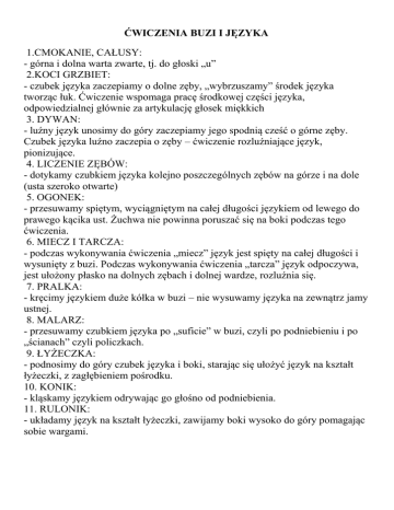 ĆWICZENIA BUZI I JĘZYKA 1.CMOKANIE, CAŁUSY: - górna i dolna warta zwarte, tj. do głoski „u” 2.KOCI GRZBIET: - czubek języka zaczepiamy o dolne zęby, „wybrzuszamy” środek języka tworząc łuk. Ćwiczenie wspomaga pracę środkowej części języka, odpowiedzialnej głównie za artykulację głosek miękkich 3. DYWAN: - luźny język unosimy do góry zaczepiamy jego spodnią cześć o górne zęby. Czubek języka luźno zaczepia o zęby – ćwiczenie rozluźniające język, pionizujące. 4. LICZENIE ZĘBÓW: - dotykamy czubkiem języka kolejno poszczególnych zębów na górze i na dole (usta szeroko otwarte) 5. OGONEK: - przesuwamy spiętym, wyciągniętym na całej długości językiem od lewego do prawego kącika ust. Żuchwa nie powinna poruszać się na boki podczas tego ćwiczenia. 6. MIECZ I TARCZA: - podczas wykonywania ćwiczenia „miecz” język jest spięty na całej długości i wysunięty z buzi. Podczas wykonywania ćwiczenia „tarcza” język odpoczywa, jest ułożony płasko na dolnych zębach i dolnej wardze, rozluźnia się. 7. PRALKA: - kręcimy językiem duże kółka w buzi – nie wysuwamy języka na zewnątrz jamy ustnej. 8. MALARZ: - przesuwamy czubkiem języka po „suficie” w buzi, czyli po podniebieniu i po „ścianach” czyli policzkach. 9. ŁYŻECZKA: - podnosimy do góry czubek języka i boki, starając się ułożyć język na kształt łyżeczki, z zagłębieniem pośrodku. 10. KONIK: - kląskamy językiem odrywając go głośno od podniebienia. 11. RULONIK: - układamy język na kształt łyżeczki, zawijamy boki wysoko do góry pomagając sobie wargami.