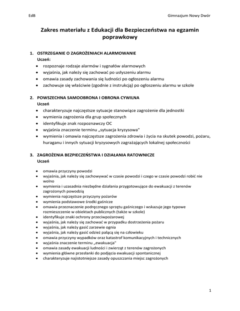 EdB Gimnazjum Nowy Dwór Zakres materiału z Edukacji dla Bezpieczeństwa na egzamin poprawkowy 1. OSTRZEGANIE O ZAGROŻENIACH ALARMOWANIE Uczeń: rozpoznaje rodzaje alarmów i sygnałów alarmowych wyjaśnia, jak należy się zachować po usłyszeniu alarmu omawia zasady zachowania się ludności po ogłoszeniu alarmu zachowuje się właściwie (zgodnie z instrukcją) po ogłoszeniu alarmu w szkole 2. POWSZECHNA SAMOOBRONA I OBRONA CYWILNA Uczeń charakteryzuje najczęstsze sytuacje stanowiące zagrożenie dla jednostki wymienia zagrożenia dla grup społecznych identyfikuje znak rozpoznawczy OC wyjaśnia znaczenie terminu „sytuacja kryzysowa" wymienia i omawia najczęstsze zagrożenia zdrowia i życia na skutek powodzi, pożaru, huraganu i innych sytuacji kryzysowych zagrażających lokalnej społeczności 3. ZAGROŻENIA BEZPIECZEŃSTWA I DZIAŁANIA RATOWNICZE Uczeń omawia przyczyny powodzi wyjaśnia, jak należy się zachowywać w czasie powodzi i czego w czasie powodzi robić nie wolno wymienia i uzasadnia niezbędne działania przygotowujące do ewakuacji z terenów zagrożonych powodzią wymienia najczęstsze przyczyny pożarów wymienia podstawowe środki gaśnicze omawia przeznaczenie podręcznego sprzętu gaśniczego i wskazuje jego typowe rozmieszczenie w obiektach publicznych (także w szkole) identyfikuje znaki ochrony przeciwpożarowej wyjaśnia, jak należy się zachować w przypadku dostrzeżenia pożaru wyjaśnia, jak należy gasić zarzewie ognia wyjaśnia, jak należy gasić odzież palącą się na człowieku omawia przyczyny wypadków oraz katastrof komunikacyjnych i technicznych wyjaśnia znaczenie terminu „ewakuacja" omawia zasady ewakuacji ludności i zwierząt z terenów zagrożonych wymienia główne przesłanki do podjęcia ewakuacji spontanicznej charakteryzuje najistotniejsze zasady opuszczania miejsc zagrożonych 1 EdB Gimnazjum Nowy Dwór 4. PIERWSZA POMOC I RESUSCYTACJA Uczeń wyjaśnia zasady oceny układu oddechowego i krążenia (ABC) • wymienia kolejne ogniwa łańcucha przeżycia; omawia ich znaczenie • wymienia numery alarmowe i omawia właściwy sposób wzywania pomocy • omawia zasady postępowania aseptycznego i bezpiecznego dla ratownika • wyjaśnia, na czym polega resuscytacja krążeniowo-oddechowa • rozpoznaje stan osoby poszkodowanej; prawidłowo bada jej oddech (na manekinie) układa poszkodowanego w pozycji bezpiecznej • wykonuje samodzielnie resuscytację krążeniowo-oddechowa u dorosłych i dzieci (na manekinach) • wyjaśnia, na czym polega pomoc ratownicza w zadławieniu omawia znaczenie czasu w udzielaniu pierwszej pomocy • wymienia zawartość apteczki pierwszej pomocy; posługuje się apteczką pierwszej pomocy udziela pomocy przy krwawieniu odpowiednio do rodzaju krwawienia • udziela pomocy w przypadku krwawienia z nosa udziela pomocy przy urazach kończyn wyjaśnia, czym jest zasłabnięcie, i omawia zasady postępowania w przypadku zasłabnięcia • wyjaśnia zasady postępowania z poszkodowanym skarżącym się na ból w klatce piersiowej • wymienia części ciała najłatwiej ulegające odmrożeniom • wyjaśnia, na czym polega pierwsza pomoc: - w wychłodzeniu - w odmrożeniu • udziela pomocy osobie poszkodowanej na skutek oparzenia termicznego • udziela pomocy osobie poszkodowanej na skutek oparzenia chemicznego: - skóry - przełyku i przewodu pokarmowego - oczu • wyjaśnia, jak można pomóc osobie, która ucierpiała wskutek udaru • omawia prawidłowe postępowanie w czasie upałów wyjaśnia, jak udzielić pomocy osobie porażonej prądem elektrycznym • wyjaśnia, jak należy się zachowywać i czego należy unikać w czasie burzy wymienia najczęstsze przyczyny utonięć • wyjaśnia, jak należy postępować, by bezpiecznie udzielić pomocy osobom tonącym wyjaśnia, na czym polega pierwsza pomoc przy zatruciach: - pokarmowych - lekami 2 EdB Gimnazjum Nowy Dwór - gazami - środkami chemicznymi wymienia najczęstsze przyczyny wypadków drogowych omawia zasady zachowania się podczas udzielania pomocy poszkodowanym w wypadkach drogowych 5. OCHRONA PRZED SKAŻENIAMI Uczeń • • • • • • • • wyjaśnia znaczenie terminu „promieniotwórczość" omawia wpływ substancji promieniotwórczych na ludzi, zwierzęta, żywność i wodę wyjaśnia, na czym polegają zabiegi sanitarne i zabiegi specjalne wyjaśnia znaczenie terminów: „skażenie" i „zakażenie" wymienia możliwe źródła skażenia wymienia sposoby zabezpieczenia żywności i wody przed skażeniami charakteryzuje walory ochronne różnych rodzajów opakowań 6. ZAGROŻENIA CHEMICZNE Uczeń • wyjaśnia, na czym polega uzdatnianie skażonej żywności i wody • rozpoznaje znaki substancji toksycznych na pojazdach i budowlach • proponuje działania chroniące ludzi przed działaniem substancji szkodliwych wyjaśnia zasady postępowania w przypadku awarii instalacji chemicznej i środka transportu oraz rozszczelnienia zbiorników z substancjami toksycznymi 3