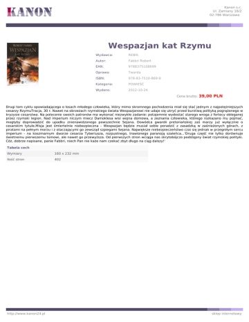 Kanon s.c. Ul. Zamiany 16/2 02-786 Warszawa Wespazjan kat Rzymu Wydawca: REBIS Autor: Fabbri Robert EAN: 9788375108699 Oprawa: Twarda ISBN: 978-83-7510-869-9 Kategoria: POWIEŚĆ Wydano: 2012-10-24 Cena brutto: 39,00 PLN Drugi tom cyklu opowiadającego o losach młodego człowieka, który mimo skromnego pochodzenia miał się stać jednym z najpotężniejszych cesarzy RzymuTracja, 30 r. Nawet na obrzeżach rzymskiego świata Wespazjanowi nie udaje się ukryć przed burzliwą polityką pogrążonego w kryzysie cesarstwa. Na polecenie swoich patronów ma wykonać niezwykłe zadanie: potajemnie wydostać starego wroga z fortecy obleganej przez rzymski legion. Nad imperium niczym miecz Damoklesa wisi wojna domowa, a zeznania człowieka, którego rozkazano mu pojmać, mogłyby doprowadzić do upadku znienawidzonego powszechnie Sejana. Dowódca gwardii pretoriańskiej zaś marzy już wyłącznie o cesarskim tytule.Misja jest śmiertelnie niebezpieczna - Wespazjan będzie musiał sobie poradzić z zasadzką w zaśnieżonych górach, z piratami na pełnym morzu i z otaczającymi go zewsząd szpiegami Sejana. Największe niebezpieczeństwo czai się jednak w przegniłym sercu imperium - na koszmarnym dworze cesarza Tyberiusza, rozpustnego, trawionego paranoją szaleńca...'Druga część nie tylko dorównuje świetnemu pierwszemu tomowi, ale nawet go przewyższa. Od pierwszych stron wciąga nas skrytobójczo podstępny świat rzymskiej polityki. Cóż, dobrze napisane, panie Fabbri, niech Pan nie każe nam czekać zbyt długo na ciąg dalszy!' Tabela cech Wymiary 160 x 232 mm Ilość stron 402 http://www.kanon24.pl sklep internetowy