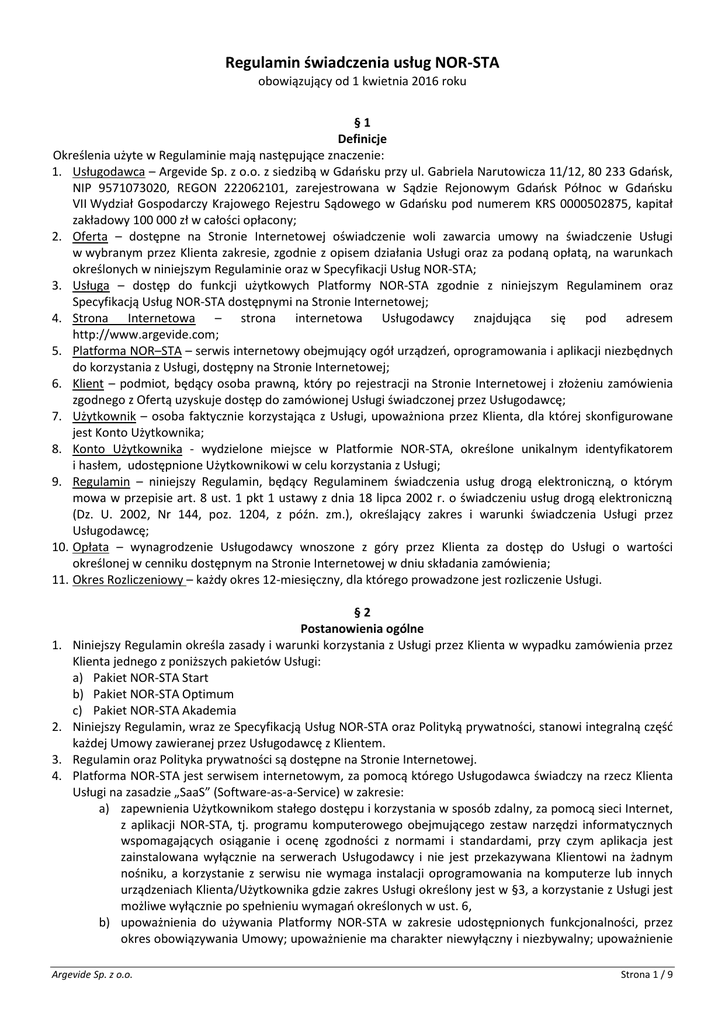 Regulamin świadczenia usług NOR-STA obowiązujący od 1 kwietnia 2016 roku §1 Definicje Określenia użyte w Regulaminie mają następujące znaczenie: 1. Usługodawca – Argevide Sp. z o.o. z siedzibą w Gdańsku przy ul. Gabriela Narutowicza 11/12, 80 233 Gdańsk, NIP 9571073020, REGON 222062101, zarejestrowana w Sądzie Rejonowym Gdańsk Północ w Gdańsku VII Wydział Gospodarczy Krajowego Rejestru Sądowego w Gdańsku pod numerem KRS 0000502875, kapitał zakładowy 100 000 zł w całości opłacony; 2. Oferta – dostępne na Stronie Internetowej oświadczenie woli zawarcia umowy na świadczenie Usługi w wybranym przez Klienta zakresie, zgodnie z opisem działania Usługi oraz za podaną opłatą, na warunkach określonych w niniejszym Regulaminie oraz w Specyfikacji Usług NOR-STA; 3. Usługa – dostęp do funkcji użytkowych Platformy NOR-STA zgodnie z niniejszym Regulaminem oraz Specyfikacją Usług NOR-STA dostępnymi na Stronie Internetowej; 4. Strona Internetowa – strona internetowa Usługodawcy znajdująca się pod adresem http://www.argevide.com; 5. Platforma NOR–STA – serwis internetowy obejmujący ogół urządzeń, oprogramowania i aplikacji niezbędnych do korzystania z Usługi, dostępny na Stronie Internetowej; 6. Klient – podmiot, będący osoba prawną, który po rejestracji na Stronie Internetowej i złożeniu zamówienia zgodnego z Ofertą uzyskuje dostęp do zamówionej Usługi świadczonej przez Usługodawcę; 7. Użytkownik – osoba faktycznie korzystająca z Usługi, upoważniona przez Klienta, dla której skonfigurowane jest Konto Użytkownika; 8. Konto Użytkownika - wydzielone miejsce w Platformie NOR-STA, określone unikalnym identyfikatorem i hasłem, udostępnione Użytkownikowi w celu korzystania z Usługi; 9. Regulamin – niniejszy Regulamin, będący Regulaminem świadczenia usług drogą elektroniczną, o którym mowa w przepisie art. 8 ust. 1 pkt 1 ustawy z dnia 18 lipca 2002 r. o świadczeniu usług drogą elektroniczną (Dz. U. 2002, Nr 144, poz. 1204, z późn. zm.), określający zakres i warunki świadczenia Usługi przez Usługodawcę; 10. Opłata – wynagrodzenie Usługodawcy wnoszone z góry przez Klienta za dostęp do Usługi o wartości określonej w cenniku dostępnym na Stronie Internetowej w dniu składania zamówienia; 11. Okres Rozliczeniowy – każdy okres 12-miesięczny, dla którego prowadzone jest rozliczenie Usługi. 1. 2. 3. 4. §2 Postanowienia ogólne Niniejszy Regulamin określa zasady i warunki korzystania z Usługi przez Klienta w wypadku zamówienia przez Klienta jednego z poniższych pakietów Usługi: a) Pakiet NOR-STA Start b) Pakiet NOR-STA Optimum c) Pakiet NOR-STA Akademia Niniejszy Regulamin, wraz ze Specyfikacją Usług NOR-STA oraz Polityką prywatności, stanowi integralną część każdej Umowy zawieranej przez Usługodawcę z Klientem. Regulamin oraz Polityka prywatności są dostępne na Stronie Internetowej. Platforma NOR-STA jest serwisem internetowym, za pomocą którego Usługodawca świadczy na rzecz Klienta Usługi na zasadzie „SaaS” (Software-as-a-Service) w zakresie: a) zapewnienia Użytkownikom stałego dostępu i korzystania w sposób zdalny, za pomocą sieci Internet, z aplikacji NOR-STA, tj. programu komputerowego obejmującego zestaw narzędzi informatycznych wspomagających osiąganie i ocenę zgodności z normami i standardami, przy czym aplikacja jest zainstalowana wyłącznie na serwerach Usługodawcy i nie jest przekazywana Klientowi na żadnym nośniku, a korzystanie z serwisu nie wymaga instalacji oprogramowania na komputerze lub innych urządzeniach Klienta/Użytkownika gdzie zakres Usługi określony jest w §3, a korzystanie z Usługi jest możliwe wyłącznie po spełnieniu wymagań określonych w ust. 6, b) upoważnienia do używania Platformy NOR-STA w zakresie udostępnionych funkcjonalności, przez okres obowiązywania Umowy; upoważnienie ma charakter niewyłączny i niezbywalny; upoważnienie Argevide Sp. z o.o. Strona 1 / 9 odnosi się wyłącznie do Klienta oraz takiej liczby Użytkowników upoważnionych przez Klienta, która została określona w zamówieniu złożonym przez Klienta, c) udostępnienia możliwości zapisywania i przechowywania danych w bazie danych serwisu, d) zapewnienia dostępu do Kont Użytkowników. 5. Dostęp do Usługi Użytkownik uzyskuje poprzez interfejs przeglądarki internetowej, po zalogowaniu się do Platformy NOR-STA. 6. Wymagania techniczne niezbędne do prawidłowego korzystania z Platformy NOR-STA obejmują posiadanie przez każdego Użytkownika komputera podłączonego do Internetu, wyposażonego w przeglądarkę internetową z następującej listy: a) Mozilla Firefox w wersji 5 lub nowszej, b) Google Chrome w wersji 10 lub nowszej, c) Microsoft Internet Explorer w wersji 9 lub nowszej, przy czym wymagane jest włączenie w przeglądarce: a) obsługi ciasteczek (cookies), b) obsługi JavaScript. 7. Usługa jest: a) świadczona w sposób całkowicie zautomatyzowany przez technologię informacyjną (IT), b) polega na wysyłaniu i odbieraniu danych za pomocą systemów teleinformatycznych w publicznych sieciach telekomunikacyjnych użyciem technik zabezpieczających bezpieczeństwo transmisji, w tym z zastosowaniem szyfrowania komunikacji i certyfikatów bezpieczeństwa, c) świadczona na indywidualne żądanie Użytkownika, d) realizowana bez jednoczesnej obecności stron w tej samej lokalizacji (zdalnie). 1. 2. 3. 4. 5. 6. 7. §3 Zawieranie umowy, zmiana zakresu Usługi i płatności Za dostęp do Platformy NOR-STA i korzystanie z wybranej Usługi w Okresie Rozliczeniowym Usługodawca pobiera opłatę określoną w Ofercie. Opłata obejmuje zapewnienie przez Usługodawcę ciągłej pracy oprogramowania poprzez zapewnienie pracy całej infrastruktury technicznej i realizacji procedur utrzymaniowych i bezpieczeństwa wraz z usługami podnoszenia wersji i aktualizacji oprogramowania. Usługodawca zamieszcza na Stronie Inter