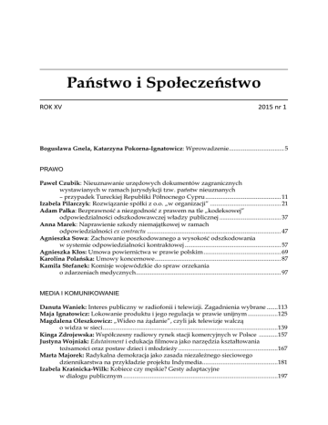 Państwo i Społeczeństwo ROK XV 2015 nr 1 Bogusława Gnela, Katarzyna Pokorna-Ignatowicz: Wprowadzenie................................... 5 PRAWO Paweł Czubik: Nieuznawanie urzędowych dokumentów zagranicznych wystawianych w ramach jurysdykcji tzw. państw nieuznanych – przypadek Tureckiej Republiki Północnego Cypru ................................................ 11 Izabela Pilarczyk: Rozwiązanie spółki z o.o. „w organizacji” ............................................. 21 Adam Pałka: Bezprawność a niezgodność z prawem na tle „kodeksowej” odpowiedzialności odszkodowawczej władzy publicznej ....................................... 37 Anna Marek: Naprawienie szkody niemajątkowej w ramach odpowiedzialności ex contractu ..................................................................................... 47 Agnieszka Sowa: Zachowanie poszkodowanego a wysokość odszkodowania w systemie odpowiedzialności kontraktowej ............................................................. 57 Agnieszka Kłos: Umowa powiernictwa w prawie polskim ................................................. 69 Karolina Polańska: Umowy koncernowe ................................................................................ 87 Kamila Stefanek: Komisje wojewódzkie do spraw orzekania o zdarzeniach medycznych ............................................................................................ 97 MEDIA I KOMUNIKOWANIE Danuta Waniek: Interes publiczny w radiofonii i telewizji. Zagadnienia wybrane .......113 Maja Ignatowicz: Lokowanie produktu i jego regulacja w prawie unijnym ...................125 Magdalena Oleszkowicz: „Wideo na żądanie”, czyli jak telewizje walczą o widza w sieci ...............................................................................................................139 Kinga Zdrojewska: Współczesny radiowy rynek stacji komercyjnych w Polsce ............157 Justyna Wojniak: Edutainment i edukacja filmowa jako narzędzia kształtowania tożsamości oraz postaw dzieci i młodzieży ...............................................................167 Marta Majorek: Radykalna demokracja jako zasada niezależnego sieciowego dziennikarstwa na przykładzie projektu Indymedia................................................181 Izabela Kraśnicka-Wilk: Kobiece czy męskie? Gesty adaptacyjne w dialogu publicznym ..................................................................................................197 HISTORIA MYŚLI POLITYCZNEJ Michał Kowalówka: Powrót Stanisława Brzozowskiego w XXI wieku ...........................213 Joanna Plata: Irlandia kobiet. Początki irlandzkiego ruchu kobiecego .............................227 RECENZJE Dariusz Baran: Maciej Pacuła, Informacja: wolne dobro publiczne nie chronione autorskoprawnie [Wydawnictwo Naukowe Scriptorium, Opole 2014, 182 s.] .......245 Michał Kowalówka: Jan Sowa, Fantomowe ciało króla. Peryferyjne zmagania z nowoczesną formą [Universitas, Kraków 2012, 584 s.] ............................................249 Lech Mikulski: Guy Standing, Prekariat. Nowa niebezpieczna klasa [Wydawnictwo Naukowe PWN, Warszawa 2014, 368 s.]; Jarosław Urbański, Prekariat i nowa walka klas: przeobrażenia współczesnej klasy pracowniczej i jej form walki [Instytut Wydawniczy Książka i Prasa, Warszawa 2014, 274 s.] ............................253 Joanna Plata: Marcin Król, Europa w obliczu kryzysu [Wydawnictwo Czerwone i Czarne, Warszawa 2012, 224 s.] ................................................................................259 SPRAWOZDANIA Joanna Bierówka, Marta du Vall: Sprawozdanie z V Ogólnopolskiej Konferencji Metodologicznej Medioznawców i IV edycji warsztatów metodologicznych medioznawców, z konferencji CyberRE 5.0. oraz z konferencji Cyfrowe wyzwania. Kompetencje cyfrowe: badania, strategie, praktyka ......................................265 Magdalena Oleszkowicz: Sprawozdanie z IV Ogólnopolskiej Konferencji Mediów Studenckich w Krakowie..............................................................................................271 Iga Bałos, Aneta Januszko-Szakiel: Sprawozdanie z międzynarodowego seminarium Infobrokering. Profesjonaliści informacji i adepci zawodu ........................273 Noty o autorach ........................................................................................................................ 277 Instrukcja przygotowania artykułów ...................................................................................... 279 Zasady recenzowania publikacji w czasopismach ............................................................. 281