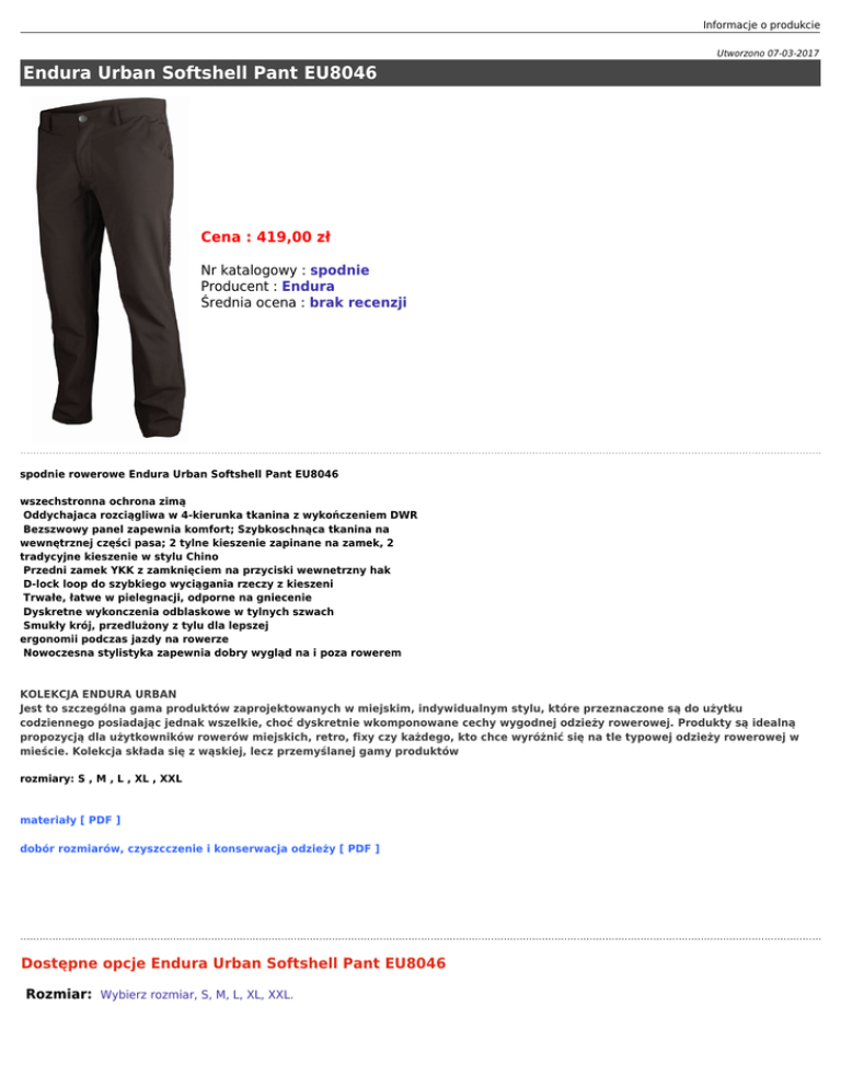 Informacje o produkcie Utworzono 07-03-2017 Endura Urban Softshell Pant EU8046 Cena : 419,00 zł Nr katalogowy : spodnie Producent : Endura Średnia ocena : brak recenzji spodnie rowerowe Endura Urban Softshell Pant EU8046 wszechstronna ochrona zimą Oddychajaca rozciągliwa w 4-kierunka tkanina z wykończeniem DWR Bezszwowy panel zapewnia komfort; Szybkoschnąca tkanina na wewnętrznej części pasa; 2 tylne kieszenie zapinane na zamek, 2 tradycyjne kieszenie w stylu Chino Przedni zamek YKK z zamknięciem na przyciski wewnetrzny hak D-lock loop do szybkiego wyciągania rzeczy z kieszeni Trwałe, łatwe w pielegnacji, odporne na gniecenie Dyskretne wykonczenia odblaskowe w tylnych szwach Smukły krój, przedlużony z tylu dla lepszej ergonomii podczas jazdy na rowerze Nowoczesna stylistyka zapewnia dobry wygląd na i poza rowerem KOLEKCJA ENDURA URBAN Jest to szczególna gama produktów zaprojektowanych w miejskim, indywidualnym stylu, które przeznaczone są do użytku codziennego posiadając jednak wszelkie, choć dyskretnie wkomponowane cechy wygodnej odzieży rowerowej. Produkty są idealną propozycją dla użytkowników rowerów miejskich, retro, fixy czy każdego, kto chce wyróżnić się na tle typowej odzieży rowerowej w mieście. Kolekcja składa się z wąskiej, lecz przemyślanej gamy produktów rozmiary: S , M , L , XL , XXL materiały [ PDF ] dobór rozmiarów, czyszcczenie i konserwacja odzieży [ PDF ] Dostępne opcje Endura Urban Softshell Pant EU8046 Rozmiar: Wybierz rozmiar, S, M, L, XL, XXL.
