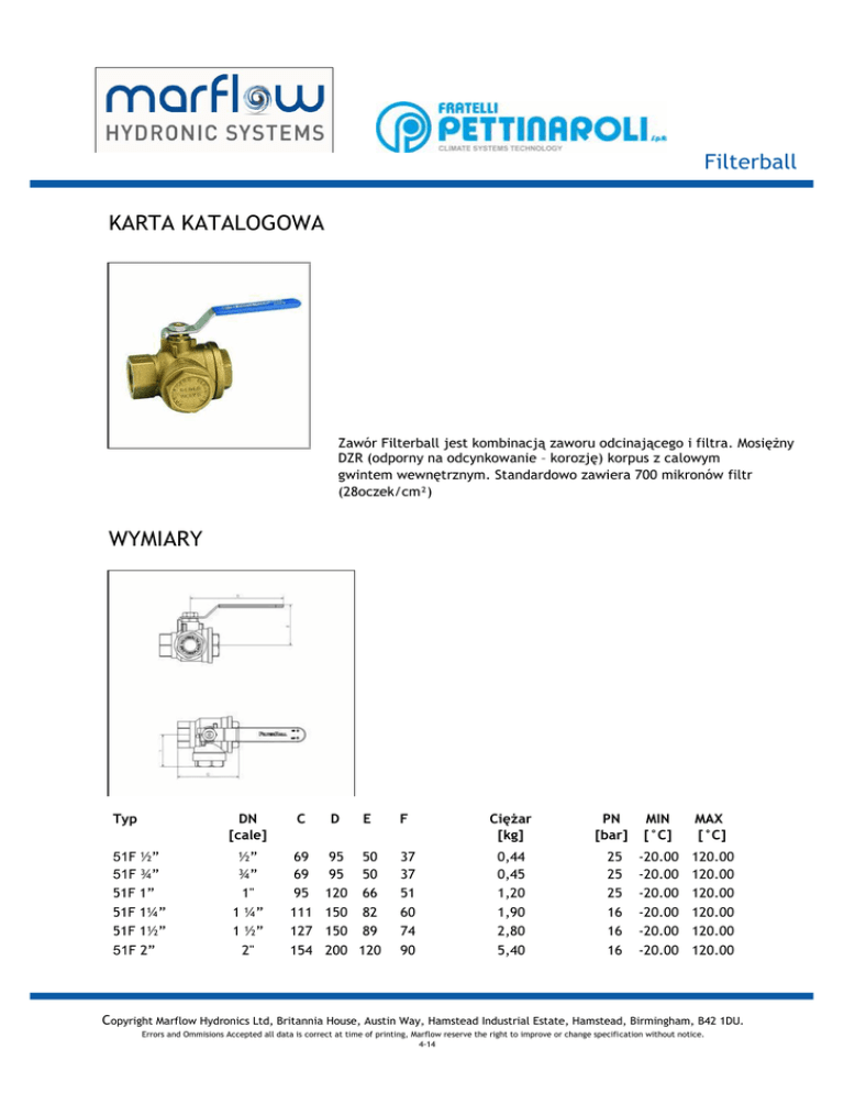 Filterball KARTA KATALOGOWA Zawór Filterball jest kombinacją zaworu odcinającego i filtra. Mosiężny DZR (odporny na odcynkowanie – korozję) korpus z calowym gwintem wewnętrznym. Standardowo zawiera 700 mikronów filtr (28oczek/cm²) WYMIARY Typ DN [cale] C 51F ½” 51F ¾” 51F 1” 51F 1¼” 51F 1½” 51F 2” ½” ¾” 1" 1 ¼” 1 ½” 2" 69 69 95 111 127 154 D E 95 50 95 50 120 66 150 82 150 89 200 120 F Ciężar [kg] PN [bar] MIN [°C] MAX [°C] 37 37 51 60 74 90 0,44 0,45 1,20 1,90 2,80 5,40 25 25 25 16 16 16 -20.00 -20.00 -20.00 -20.00 -20.00 -20.00 120.00 120.00 120.00 120.00 120.00 120.00 Copyright Marflow Hydronics Ltd, Britannia House, Austin Way, Hamstead Industrial Estate, Hamstead, Birmingham, B42 1DU. Errors and Ommisions Accepted all data is correct at time of printing, Marflow reserve the right to improve or change specification without notice. 4-14 MATERIAŁ Komponent Kula Korpus Rączka Gniazdo Trzpień Uszczelnienie trzpienia Materiał Mosiądz DZR Cw602N (CZ132) Mosiądz DZR Cw602N (CZ132) Stal tłoczona PTFE Mosiądz DZR Cw602N (CZ132) VITON Copyright Marflow Hydronics Ltd, Britannia House, Austin Way, Hamstead Industrial Estate, Hamstead, Birmingham, B42 1DU. Errors and Ommisions Accepted all data is correct at time of printing, Marflow reserve the right to improve or change specification without notice. 4-14 CHARAKTERYSTYKI PRZEPŁYWÓW Typ 51F ½” 51F ¾” 51F 1” 51F 1¼” 51F 1½” 51F 2” Kv 7.00 7.50 14.50 20.00 31.00 60.00 Kvs KV @ 30% UWAGI MONTAŻOWE/INSTRUKCJE 1) Zawór może być instalowany w dowolnym położeniu poziomym. 2) Zawór może być zainstalowany pionowo jeżeli kierunek przepływu wskazany przez strzałkę zwrócony jest ku dołowi 3) Kierunek przepływu musi być zgodny ze strzałką na korpusie zaworu. Copyright Marflow Hydronics Ltd, Britannia House, Austin Way, Hamstead Industrial Estate, Hamstead, Birmingham, B42 1DU. Errors and Ommisions Accepted all data is correct at time of printing, Marflow reserve the right to improve or change specification without notice. 4-14 SPECYFIKACJA PROJEKTOWA Jeżeli wymagane jest zastosowanie filtra DN15 - DN50 zalecane jest zastosowanie zaworu Filterball jako kombinacji filtra i zaworów odcinających z ¼ obrotu rączką. Filtr umieszczony jest wewnątrz kuli i dostęp do niego celem obsługi i czyszczenia jest dozwolony tylko w pozycji odciętego przepływu. Dodatkowe zawory przed i za filtrem nie są wymagane. Wytworzony w gorącej obróbce mosiądz DZR (odporny na odcynkowanie – korozję), potrójnie uszczelniony trzpień z zabezpieczeniem przed wypchnięciem z dwoma uszczelkami typu O-ring oraz uszczelnieniem z PTFE. Taki, jak dostarczany przez Marflow Hydronics Ltd Tel: +44 121 358 2012 www.marflowhydronics.co.uk Copyright Marflow Hydronics Ltd, Britannia House, Austin Way, Hamstead Industrial Estate, Hamstead, Birmingham, B42 1DU. Errors and Ommisions Accepted all data is correct at time of printing, Marflow reserve the right to improve or change specification without notice. 4-14