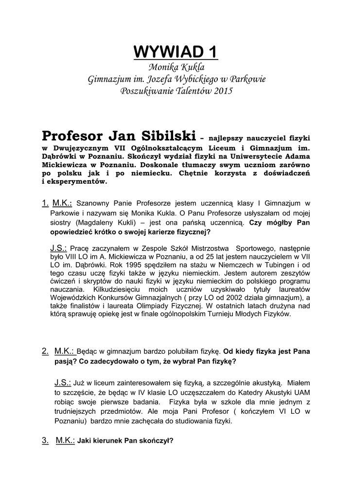 WYWIAD 1 Monika Kukla Gimnazjum im. Jozefa Wybickiego w Parkowie Poszukiwanie Talentów 2015 Profesor Jan Sibilski – najlepszy nauczyciel fizyki w Dwujęzycznym VII Ogólnokształcącym Liceum i Gimnazjum im. Dąbrówki w Poznaniu. Skończył wydział fizyki na Uniwersytecie Adama Mickiewicza w Poznaniu. Doskonale tłumaczy swym uczniom zarówno po polsku jak i po niemiecku. Chętnie korzysta z doświadczeń i eksperymentów. 1. M.K.: Szanowny Panie Profesorze jestem uczennicą klasy I Gimnazjum w Parkowie i nazywam się Monika Kukla. O Panu Profesorze usłyszałam od mojej siostry (Magdaleny Kukli) – jest ona pańską uczennicą. Czy mógłby Pan opowiedzieć krótko o swojej karierze fizycznej? J.S.: Pracę zaczynałem w Zespole Szkół Mistrzostwa Sportowego, następnie było VIII LO im A. Mickiewicza w Poznaniu, a od 25 lat jestem nauczycielem w VII LO im. Dąbrówki. Rok 1995 spędziłem na stażu w Niemczech w Tubingen i od tego czasu uczę fizyki także w języku niemieckim. Jestem autorem zeszytów ćwiczeń i skryptów do nauki fizyki w języku niemieckim do polskiego programu nauczania. Kilkudziesięciu moich uczniów uzyskiwało tytuły laureatów Wojewódzkich Konkursów Gimnazjalnych ( przy LO od 2002 działa gimnazjum), a także finalistów i laureata Olimpiady Fizycznej. W ostatnich latach drużyna nad którą sprawuję opiekę jest w finale ogólnopolskim Turnieju Młodych Fizyków. 2. M.K.: Będąc w gimnazjum bardzo polubiłam fizykę. Od kiedy fizyka jest Pana pasją? Co zadecydowało o tym, że wybrał Pan fizykę? J.S.: Już w liceum zainteresowałem się fizyką, a szczególnie akustyką. Miałem to szczęście, że będąc w IV klasie LO uczęszczałem do Katedry Akustyki UAM robiąc swoje pierwsze badania. Fizyka była w szkole dla mnie jednym z trudniejszych przedmiotów. Ale moja Pani Profesor ( kończyłem VI LO w Poznaniu) bardzo mnie zachęcała do studiowania fizyki. 3. M.K.: Jaki kierunek Pan skończył? J.S.: Właściwie to wybrałem fizykę z myślą o akustyce. Najpierw jednak musiałem przejść przez wszystkie działy fizyki. Nie wszystkie były dla mnie równie ciekawe. Dużo zależało tu od prowadzącego zajęcia. Chociaż skończyłem bardzo przyszłościową specjalizację – akustykę środowiska - to ciągnęła mnie zawsze dydaktyka i tak – ku zaskoczeniu znajomych i rodziny - zostałem nauczycielem. 4. M.K.: Który dział uważa Pan za szczególnie trudny? J.S.: Dla mnie zawsze trudne były działy związane z elektroniką. Szczególnie, że wymagały one z jednej strony pewnych umiejętności manualnych, których niestety nie posiadam. 5. M.K.: Jak radził sobie Pan z fizyką w szkole? Czy sprawiała ona Panu problemy? J.S.: Fizyka nie sprawiała mi trudności tylko – jak już wspomniałem – miałem problemy z elektroniką. 6. M.K.: Czy według Pana fizyki można się nauczyć, czy żeby w pełni pojąć i zrozumieć tę dziedzinę nauki niezbędny jest talent? J.S.: Moim zdaniem aby zrozumieć fizykę nie potrzebny jest jakiś szczególny talent. Wystarczy dużo dobrych chęci , cierpliwości i koniecznie nie omijanie sfer, które wydają się szczególnie trudne. Fizyka jest związana z obserwacją przyrody, dlatego tak ważne są na początku nauki proste doświadczenia ich wykonywanie i traktowanie jako dobrą zabawę. Później należy zawsze zadawać pytanie, które wyjaśniałyby przebieg obserwowanego zjawiska. 7. M.K.: Co jest tak ciekawego według Pana w tej nauce? J.S.: Przede wszystkim jest nauką podstawową. Praktycznie wszystkie inne nauki czerpią z dokonań fizyki. Bez jej znajomości trudno o dobre zrozumienie biologii, chemii czy też geografii. Badania fizyczne są też podstawą do rozwoju medycyny. Dla mnie zawsze istotnym było, że można w fizyce wiele rzeczy wyjaśnić bez ogromnej wiedzy pamięciowej. Niestety „wyważa się wtedy otwarte drzwi” dochodząc do prawidłowości już dawno odkrytych. Ale jaka z tego satysfakcja! 8. M.K.: Jakie ma Pan najwspanialsze wspomnienie związane z fizyką, które zapadło w Pana pamięci? J.S.: Ciężko mi to powiedzieć, gdyż nie potrafię powstrzymać się od śmiechu. W liceum bardzo ciekawiłem i interesowałem się fizyką. Lubiłem ,,sprawdzać’’ doświadczenia – po prostu chciałem ich doświadczyć. Pod koniec roku szkolnego –byłem wtedy w I klasie.- pojechaliśmy na wycieczkę. Niestety nie pamiętam już dokąd była ta podróż, ale wiem ,że na środku tego budynku była okrągła podstawka, która podłączona po prądu obracała się .I oczywiście ja postanowiłem sprawdzić na niej siłę dośrodkową. Po kryjomu podłączyłem kabel do prądu i podstawka zaczęła się kręcić. Przyśpieszyłem ją i ledwo udało mi się na nią wejść. Miałem zeszyt w ręce, – notowałem wszystko co pani nam mówiłastanąłem na brzegu tego okręgu i przez ruch straciłem równowagę .Zeszyt wyleciał mi z ręki i uderzył w nauczycielkę. Na szczęście nic jej się nie stało, ale ja miałem duże kłopoty. Nie było mi wtedy do śmiechu, ale dziś inaczej na to patrzę. Co prawda nie jest to najwspanialsza przygoda związana z fizyką ,ale na pewno najzabawniejsza. Zapamiętam ją jeszcze na długie lata. MONIKA KUKLA: Dziękuję Panu bardzo za możliwość przeprowadzenia wywiadu.
