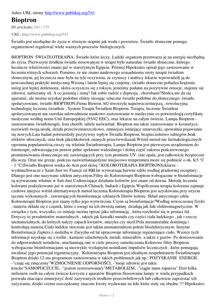 Adres URL strony http://www.publikuj.org/541 Bioptron ID artykułu: 541 / 175 URL: http://www.publikuj.org/541 Światło jest niezbędne do życia w równym stopniu jak woda i powietrze. Światło słoneczne pomaga organizmowi regulować wiele ważnych procesów biologicznych. BIOPTRON ŚWIATŁOTERAPIA- Światło które leczy. Ludzki organizm przetwarza je na energię niezbędną do życia. Pierwszym źródłem światła stosowanym w terapii było naturalne światło słoneczne, którego lecznicze właściwości znano już w starożytnym Egipcie. Później Hipokrates opisał jego zastosowanie w leczeniu różnych schorzeń. Pomimo, że nie znano naukowego uzasadnienia istoty terapii światłem słonecznym, jej lecznicza moc była na tyle oczywista, że rzymscy i arabscy lekarze wprowadzili ją do powszechnej praktyki medycznej.Wiosną i latem lepiej się czujemy, światło słoneczne pobudza krążenie, mózg jest lepiej dotleniony, skóra oczyszcza się z toksyn, jesteśmy podatni na pozytywne emocje, stajemy się zdrowsi, nabieramy sił. A co jesienią i zimą? Jak sobie radzić z depresją , chorobami?Słońca nie da się ujarzmić, ale można uzyskać podobne efekty stosując sztuczne światło podobne do słonecznego, światło spolaryzowane, światło BIOPTRON.Firma Biotron AG stworzyła najnowocześniejszą , rewolucyjną technologię leczenia światłem - System Terapii Światłem Bioptron. Terapia, leczenie Światłem spolaryzowanym ma szerokie udowodnione naukowo zastosowanie w medycynie co potwierdzają certyfikaty medyczne według norm Unii Europejskiej (93/42 EEC), oraz lekarze na całym świecie. Lampa Bioptron zastosowanie światłoterapii, lista chorób, tabele naświetlań. Bioptron ma także zastosowanie w kosmetyce, rozświetli twoją urodę, działa przeciwzmarszczkowo, zmniejsza istniejące zmarszczki, spowalnia pojawianie się nowych.Lata badań potwierdziły pozytywny wpływ Światła Bioptron, bezpieczeństwo zabiegów,brak efektów ubocznych, oraz brak jakichkolwiek znanych przeciwwskazań.Wśród metod nie farmakologicznych ogromną popularnością cieszy się właśnie Światłoterapia. Lampa Bioptron jest pierwszym urządzeniem do fototerapii, odtwarzającym prawie pełne spektrum widzialnego i dolną część zakresu podczerwonego promieniowania słonecznego nie zawierających przy tym promieni UV. (nie opala, jest całkowicie bezpieczne dla oczu. Oraz nie grzeje, podczas naświetlaniajedynie miejscowo temperatura może się podnieść o ok. 0,5 °C - 1 °C)Światło Bioptron wnika do 4cm pod skórę ! KOLOROTERAPIA BIOPTRONSzklarze wydmuchiwacze z Saint-Just we Francji od 800 lat wytwarzają barwne szkło według pradawnej receptury. Dlatego jest ono nazywane szkłem antycznym.Filtry do Koloroterapii Bioptron wzbogacone w bioinformacje są wytwarzane właśnie w Sait-Just.Uzdrawiające działanie kolorów jest znane od dawna. Metodę leczenia kolorami praktykowano już w starożytnych Chinach, Indiach i Egipcie.Współczesna terapia kolorami zajmuje czołowe miejsce wśród alternatywnych metod leczenia.Koloroterapia Bioptron jest uzyskiwana przy użyciu ręcznie wykonanych , zawierających bioinformacje szklanych filtrów koloru. Skład antycznego szkła Koloroterapii Bioptron jest znany tylko jego wytwórcom. Czym są bioinformacje?Według nowoczesnej fizyki , materia składa się z cząstek, które z uwagi na ich dwoistą naturę działają jak fale elektromagnetyczne. W związku z tym, wszystko, co istnieje można opisać jako informację , która rozchodzi się w postaci fal. Dotyczy to przedmiotów materialnych , takich jak kawałki metalu czy części ciała ludzkiego , jak i rzeczy niematerialnych, do których należy zapach kwiatów, muzyka czy myśl.Pola niematerialne dominują i kontrolują materię.Ciało ludzkie otoczone jest takim niematerialnym polem bioelektrycznym. Instytut Bioinformacji Zeptera z siedzibą w Zurychu od lat opracowuje informacje regenerujące ciało. Wzorce tych informacji uzyskuje się z roślin , kamieni szlachetnych, metali, minerałów, a także z gazów. Po dostosowaniu do odpowiednich nośników, uruchamiają one w ciele procesy samoleczenia.Kolorowe filtry Bioptron wzbogacone bioinformacjami są niezwykle wydajnymi nośnikami impulsów leczniczych , które pomagają uwalniać jego potencjał regeneracyjny. Koloroterapia Bioptron jest idealnym uzupełnieniem Światloterapii Bioptron dzięki 12-stu programom zastosowania w takich problemach jak np.: POZYSKANIE ENERGII, -"czuję się zmęczony"WZMOCNIENIE ODPORNOŚCI, -"moje zdrowie jest takie kruche"SAMOPOCZUCIE, -"jestem zestresowana/y"METABOLIZM, -"ciągle mam zaparcia" Dziś kilka milionów osób na całym świecie korzysta z aparatów Bioptron.Stosowanie lampy w wielu przypadkach pozwala znacząco zmniejszyć ilość zażywanych środków przeciwbólowych lub całkowicie zaprzestać ich zażywania, dzięki czemu oszczędzamy znaczne kwoty wydawane na leki które stały się zbędne !!! Hipokrates: Strona 1 / 2 "Po pierwsze - nie szkodzić""Uszanuj uzdrawiającą moc natury""Lekarz leczy, natura uzdrawia" Jacek Wielopolski Lampa Zepter - zastosowanie, lista chorób, parametry, szeroki opis. Aktywacja: 12/12/08 09:00, odsłony: 495 Strona 2 / 2