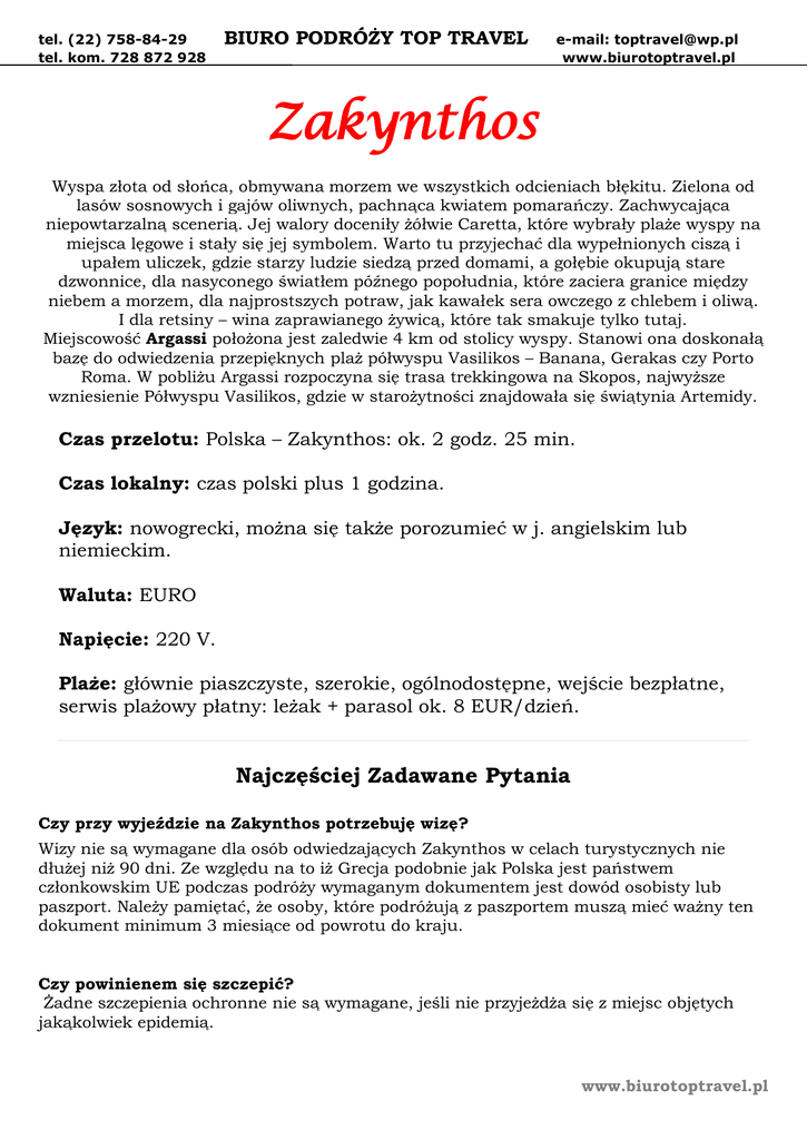 tel. (22) 758-84-29 tel. kom. 728 872 928 BIURO PODRÓŻY TOP TRAVEL e-mail: [email protected] www.biurotoptravel.pl Zakynthos Wyspa złota od słońca, obmywana morzem we wszystkich odcieniach błękitu. Zielona od lasów sosnowych i gajów oliwnych, pachnąca kwiatem pomarańczy. Zachwycająca niepowtarzalną scenerią. Jej walory doceniły żółwie Caretta, które wybrały plaże wyspy na miejsca lęgowe i stały się jej symbolem. Warto tu przyjechać dla wypełnionych ciszą i upałem uliczek, gdzie starzy ludzie siedzą przed domami, a gołębie okupują stare dzwonnice, dla nasyconego światłem późnego popołudnia, które zaciera granice między niebem a morzem, dla najprostszych potraw, jak kawałek sera owczego z chlebem i oliwą. I dla retsiny – wina zaprawianego żywicą, które tak smakuje tylko tutaj. Miejscowość Argassi położona jest zaledwie 4 km od stolicy wyspy. Stanowi ona doskonałą bazę do odwiedzenia przepięknych plaż półwyspu Vasilikos – Banana, Gerakas czy Porto Roma. W pobliżu Argassi rozpoczyna się trasa trekkingowa na Skopos, najwyższe wzniesienie Półwyspu Vasilikos, gdzie w starożytności znajdowała się świątynia Artemidy. Czas przelotu: Polska – Zakynthos: ok. 2 godz. 25 min. Czas lokalny: czas polski plus 1 godzina. Język: nowogrecki, można się także porozumieć w j. angielskim lub niemieckim. Waluta: EURO Napięcie: 220 V. Plaże: głównie piaszczyste, szerokie, ogólnodostępne, wejście bezpłatne, serwis plażowy płatny: leżak + parasol ok. 8 EUR/dzień. Najczęściej Zadawane Pytania Czy przy wyjeździe na Zakynthos potrzebuję wizę? Wizy nie są wymagane dla osób odwiedzających Zakynthos w celach turystycznych nie dłużej niż 90 dni. Ze względu na to iż Grecja podobnie jak Polska jest państwem członkowskim UE podczas podróży wymaganym dokumentem jest dowód osobisty lub paszport. Należy pamiętać, że osoby, które podróżują z paszportem muszą mieć ważny ten dokument minimum 3 miesiące od powrotu do kraju. Czy powinienem się szczepić? Żadne szczepienia ochronne nie są wymagane, jeśli nie przyjeżdża się z miejsc objętych jakąkolwiek epidemią. www.biurotoptravel.pl Czy na wyspie jest bezpiecznie? Grecja jest krajem stosunkowo bezpiecznym. Nie należy jednak pozostawiać bez nadzoru rzeczy osobistych i dokumentów w miejscach publicznych, zwłaszcza na plażach. Jednak zwracamy uwagę, że:  Woda z kranu nadaje się do picia po przegotowaniu. Zalecamy jednak spożywać wodę butelkowaną.  Mimo, że władze greckie dbają o bezpieczeństwo turystów, nie ma sposobu na zlikwidowanie drobnej przestępczości. Dlatego nie pozostawiajmy bagażu bez opieki. Nie należy również nosić przy sobie większej ilości pieniędzy, czy czeków podróżnych, a jeśli mamy więcej niż jedną kartę kredytową - nie trzymajmy ich w tym samym miejscu.  Poza tym należy uważać podczas kąpieli w morzu. Drobne obrażenia może spowodować kontakt z parzydełkami meduz oraz z jeżowcami. W piasku mogą ukrywać się trygony - gatunek ryb, których jad (znajdujący się w ogonie) może spowodować u człowieka wysypkę. Na szczęście coraz rzadziej można je spotkać na greckich plażach.  Przy poruszaniu się po wyspie samochodem / skuterem pamiętajmy, że na bocznych trasach asfalt często nagle zamienia się w polną drogę. Większość przejazdów kolejowych jest niestrzeżona. Kierowcy jadący pod gorę zazwyczaj domagają się pierwszeństwa. Miganie długimi światłami oznacza, że dający znak będzie jechał, a nie jak w Polsce, że nas przepuszcza. Jakie jest napięcie elektryczne i wtyczki? Napięcie w sieci wynosi 220 V. Nie ma konieczności przywożenia ze sobą adaptera do gniazdek. Jak można poruszać się po wyspie? Najtańszym środkiem lokomocji są autobusy kursujące między większymi miejscowościami, jednak planując zwiedzanie wyspy w oparciu o ten rodzaj transportu należy zapytać kierowcę o godziny powrotu, gdyż rzadko kiedy autobusy kursują według rozkładów na przystankach. Popularnością cieszą się wypożyczalnie samochodów i skuterów, dające możliwość wygodniejszego zwiedzania. Z głównego port w mieście Zakynthos odpływają liniowe promy i barki na Kefalonię, do Kyllini na Peloponezie i włoskiego Brindisi. Wynajem samochodu Samochód wynająć może każdy kto posiada polskie prawo jazdy kategorii B. Przed wypożyczeniem warto zrobić rozeznanie w kilku miejscowych punktach. Ceny między różnymi wypożyczalniami mogą różnić się nawet o 50% dla tej samej klasy samochodu. Bardzo ważne aby przed wypożyczeniem dopytać o ubezpieczenie. Niektóre wypożyczalnie nie ubezpieczają kół, lusterek oraz szyb. Koszt wynajmu samochodu uzależniony jest od standardu samochodu oraz zdolności negocjacyjnych. Np. wypożyczenie Fiata Pandy z klimatyzacją to koszt ok. 30 EURO/dzień + benzyna. Mapy wyspy dostaniemy przy wypożyczeniu samochodu. Wynajem skutera Skuter wynająć można nawet w mniejszych miejscowościach turystycznych. Podobnie jak na innych greckich wyspach tak i na Zakynthos jest to niezwykle popularny środek transportu. W większości przypadków do wynajęcia potrzebne jest jedynie polskie prawo jazdy kat. A lub B. Wypożyczenie skutera na 1 dzien kosztuje 12-15 euro. Zdecydowanie bardziej opłaca się wynająć go na min 3 dni. Warto tez się targować. Za 3 dni zapłacimy ok. 30-35 euro. Coraz popularniejsze stają się quady. Niestety zabawa na tych maszynach nie jest tania. Koszt wypożyczenia quada często przewyższa koszt wypożyczenia samochodu. Drogi na Zakynthos Drogi na Zakynthos są dobrze utrzymane, choć niekiedy bardzo wąskie oraz kręte. Oznakowanie dróg można uznać za przyzwoite, choć nazwy na tabliczkach nie zawsze odpowiadały tym na mapie. Jaka religia obowiązuje? Obecnie Grecja jest krajem chrześcijańskim mimo długiego panowania na Bałkanach muzułmańskiej Turcji. Grecy są narodem wyznania prawosławnego