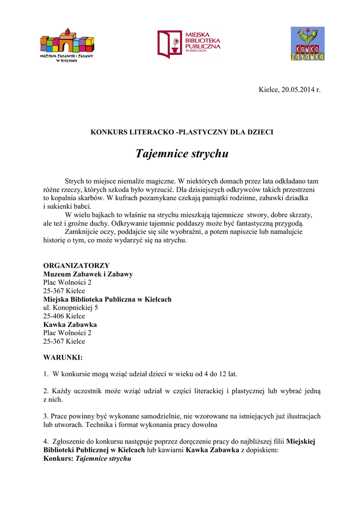 Kielce, 20.05.2014 r. KONKURS LITERACKO -PLASTYCZNY DLA DZIECI Tajemnice strychu Strych to miejsce niemalże magiczne. W niektórych domach przez lata odkładano tam różne rzeczy, których szkoda było wyrzucić. Dla dzisiejszych odkrywców takich przestrzeni to kopalnia skarbów. W kufrach pozamykane czekają pamiątki rodzinne, zabawki dziadka i sukienki babci. W wielu bajkach to właśnie na strychu mieszkają tajemnicze stwory, dobre skrzaty, ale też i groźne duchy. Odkrywanie tajemnic poddaszy może być fantastyczną przygodą. Zamknijcie oczy, poddajcie się sile wyobraźni, a potem napiszcie lub namalujcie historię o tym, co może wydarzyć się na strychu. ORGANIZATORZY Muzeum Zabawek i Zabawy Plac Wolności 2 25-367 Kielce Miejska Biblioteka Publiczna w Kielcach ul. Konopnickiej 5 25-406 Kielce Kawka Zabawka Plac Wolności 2 25-367 Kielce WARUNKI: 1. W konkursie mogą wziąć udział dzieci w wieku od 4 do 12 lat. 2. Każdy uczestnik może wziąć udział w części literackiej i plastycznej lub wybrać jedną z nich. 3. Prace powinny być wykonane samodzielnie, nie wzorowane na istniejących już ilustracjach lub utworach. Technika i format wykonania pracy dowolna 4. Zgłoszenie do konkursu następuje poprzez doręczenie pracy do najbliższej filii Miejskiej Biblioteki Publicznej w Kielcach lub kawiarni Kawka Zabawka z dopiskiem: Konkurs: Tajemnice strychu 5. Sposób opisania pracy na tylniej stronie: - nazwisko i imię dziecka, wiek - imię i nazwisko opiekuna - kontakt: telefon, adres, e-mail 6. Prace zostaną ocenione w trzech kategoriach wiekowych przez Jury powołane przez organizatorów: I. Dzieci w wieku 4 – 6 lat: Nagrody i wyróżnienia II. Dzieci w wieku 7 – 9 lat: Nagrody i wyróżnienia III. Dzieci w wieku 10 – 12 lat Nagrody i wyróżnienia 7. Kryteria oceny Prace literackie – zgodność z tematem, bogactwo treści, poprawność językowa Prace plastyczne – zgodność z tematem, samodzielność, kreatywność. 8. Organizatorzy konkursu nie zwracają prac nagrodzonych i wyróżnionych oraz nie zakwalifikowanych do wystawy pokonkursowej. Zastrzegają sobie także możliwość dysponowania pracami, publikacji nagrodzonych prac w mediach na stronie internetowej MBP i w innych materiałach dotyczących wystawy oraz w ramach promocji konkursu. TERMINARZ KONKURSU: 1. Prace przyjmowane będą do 7 czerwca 2014 r. we wszystkich filiach Miejskiej Biblioteki Publicznej w Kielcach lub w kawiarni Kawka Zabawka (Plac Wolności 2). 2. Podsumowanie konkursu, wręczenie nagród oraz otwarcie wystawy pokonkursowej odbędzie się 14 czerwca 2014 r. (sobota) w kawiarni Kawka Zabawka. Dodatkowych informacji udzielają: Przemysław Krystian [email protected], tel. 41 343 37 15 Bożena Iwan [email protected], tel.41 368 54 09 Kawka Zabawka [email protected] , 41 343 33 00, 666 840 226 SPONSORZY