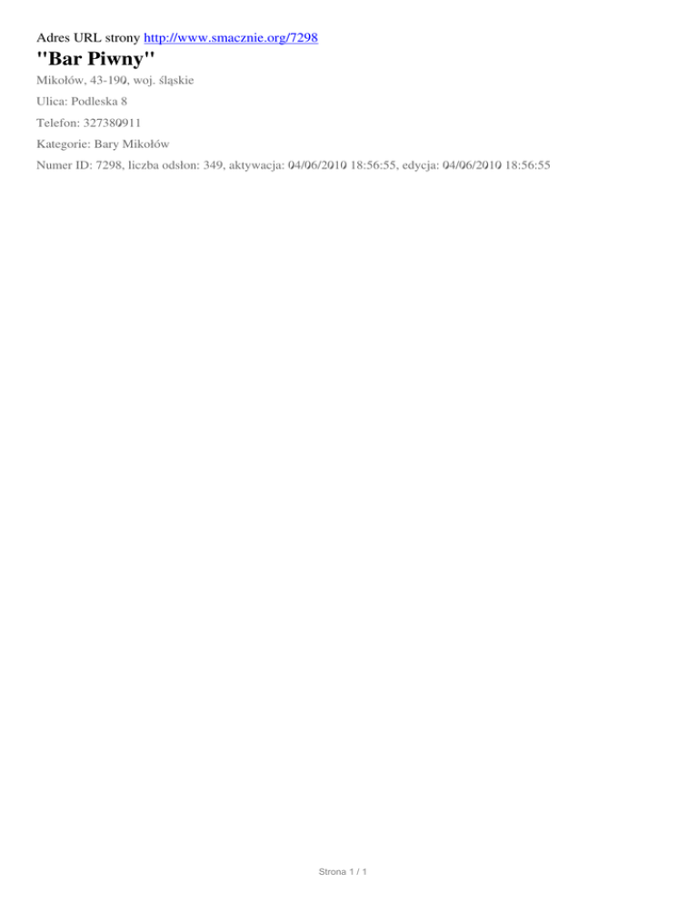 Adres URL strony http://www.smacznie.org/7298 "Bar Piwny" Mikołów, 43-190, woj. śląskie Ulica: Podleska 8 Telefon: 327380911 Kategorie: Bary Mikołów Numer ID: 7298, liczba odsłon: 349, aktywacja: 04/06/2010 18:56:55, edycja: 04/06/2010 18:56:55 Strona 1 / 1