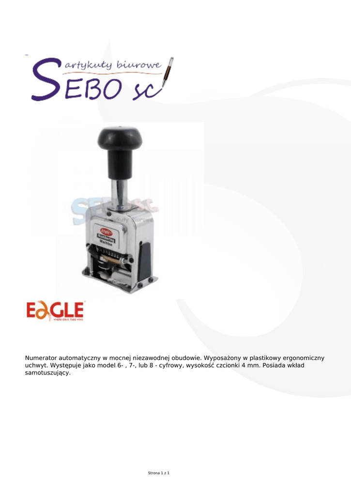 Numerator automatyczny w mocnej niezawodnej obudowie. Wyposażony w plastikowy ergonomiczny uchwyt. Występuje jako model 6- , 7-, lub 8 - cyfrowy, wysokość czcionki 4 mm. Posiada wkład samotuszujący. Strona 1 z 1