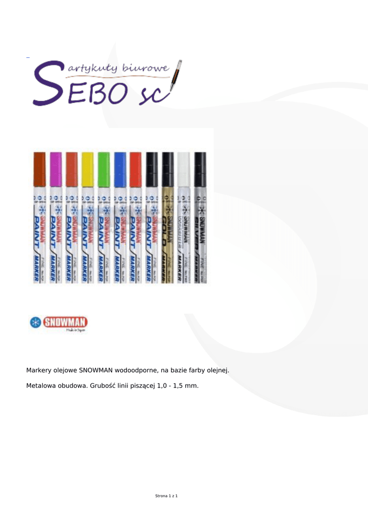 Markery olejowe SNOWMAN wodoodporne, na bazie farby olejnej. Metalowa obudowa. Grubość linii piszącej 1,0 - 1,5 mm. Strona 1 z 1