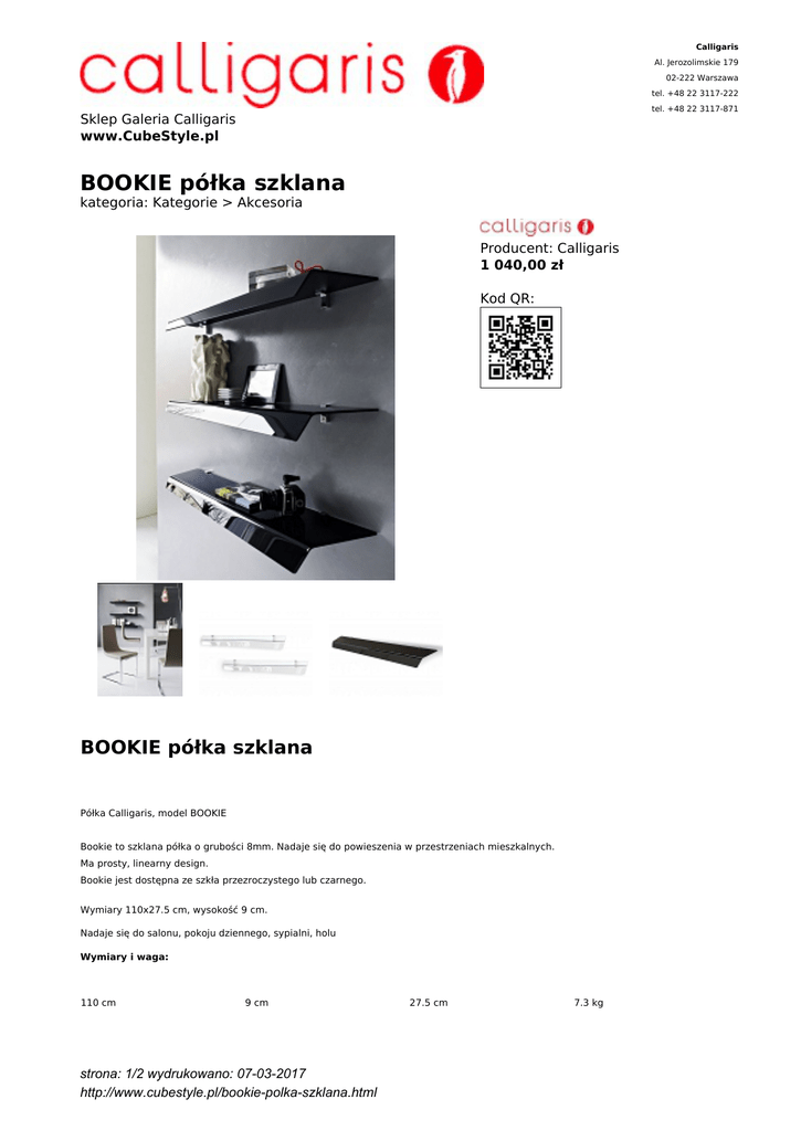 Calligaris Al. Jerozolimskie 179 02-222 Warszawa tel. +48 22 3117-222 tel. +48 22 3117-871 Sklep Galeria Calligaris www.CubeStyle.pl BOOKIE półka szklana kategoria: Kategorie > Akcesoria Producent: Calligaris 1 040,00 zł Kod QR: BOOKIE półka szklana Półka Calligaris, model BOOKIE Bookie to szklana półka o grubości 8mm. Nadaje się do powieszenia w przestrzeniach mieszkalnych. Ma prosty, linearny design. Bookie jest dostępna ze szkła przezroczystego lub czarnego. Wymiary 110x27.5 cm, wysokość 9 cm. Nadaje się do salonu, pokoju dziennego, sypialni, holu Wymiary i waga: 110 cm 9 cm strona: 1/2 wydrukowano: 07-03-2017 http://www.cubestyle.pl/bookie-polka-szklana.html 27.5 cm 7.3 kg Czas dostawy: 6-8 tygodni Dostępne wersje: Glass top strona: 2/2 wydrukowano: 07-03-2017 http://www.cubestyle.pl/bookie-polka-szklana.html